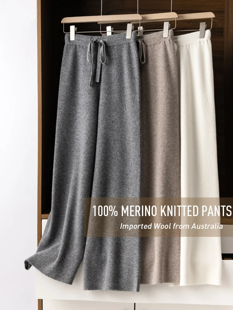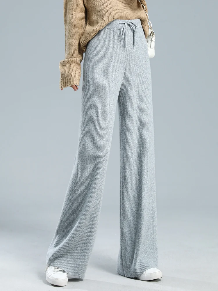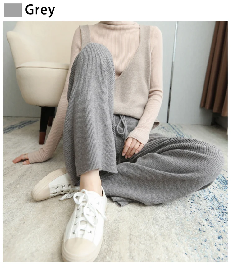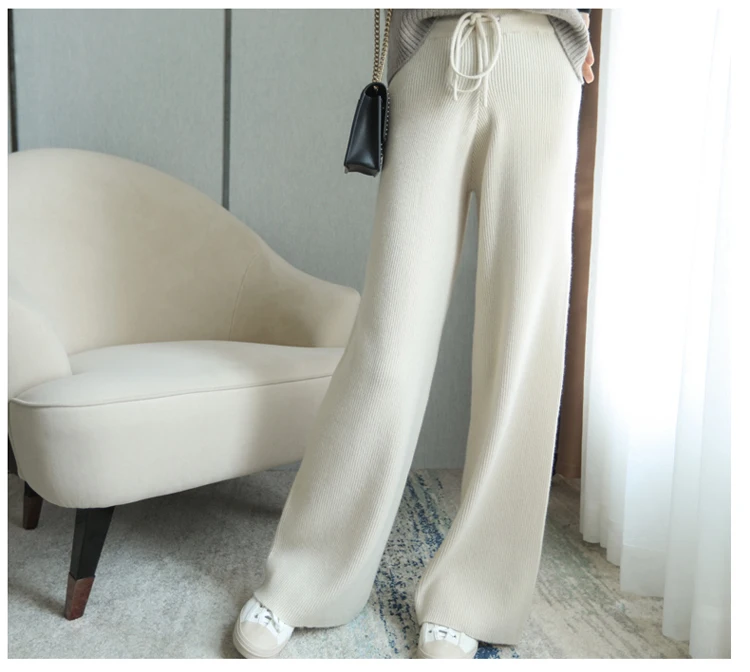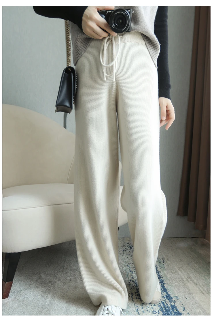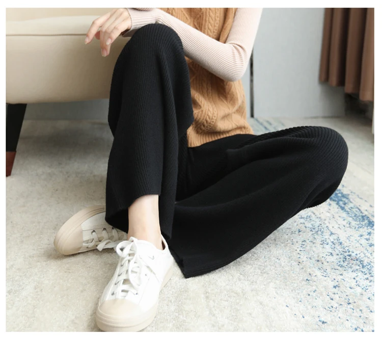 100% lana lavorata a maglia costole pesanti pantaloni larghi a gamba larga lunghezza del pavimento pantaloni All-match lana morbida donna autunno inverno pantaloni Casual #15