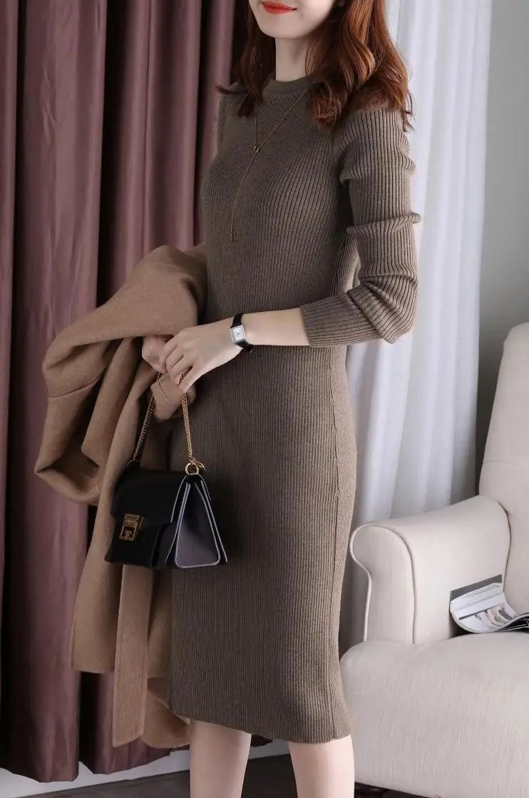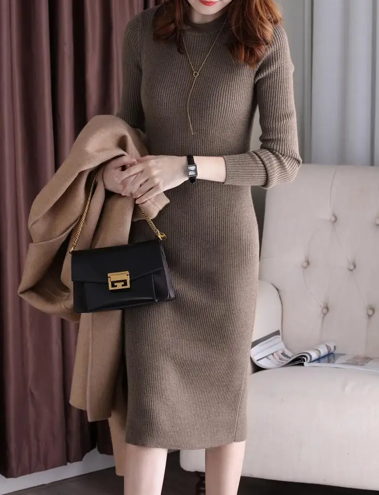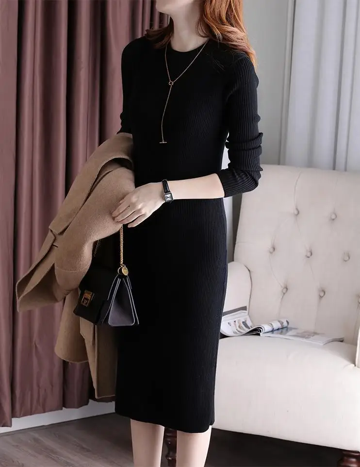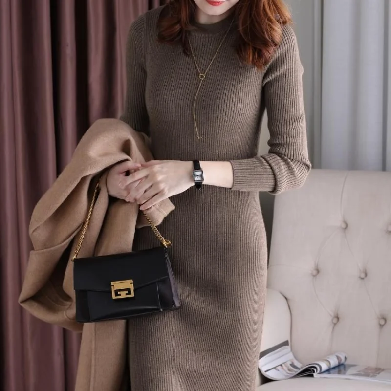 2023 Autunno/Inverno Versione coreana Nuovo girocollo Abito a maniche lunghe Slim Fit e moda Tinta unita Abito a trapezio di media lunghezza