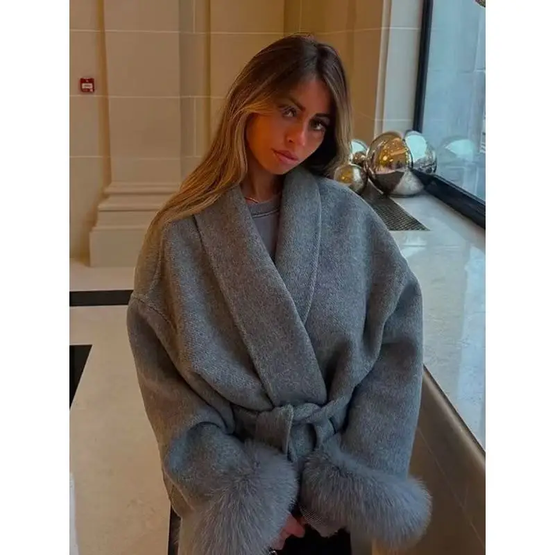 2025 Autunno Donna Chic Risvolto Cappotto di Peluche Con Cintura Vintage Manica In Pelliccia Sintetica Tweed Cappotti Aperti Femminile Inverno Casual Strada Outwear