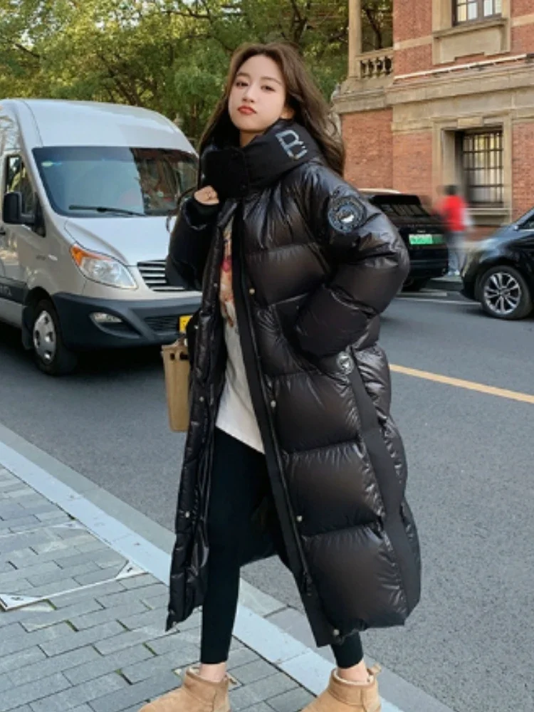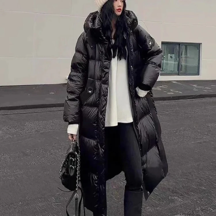 2025 Nuovo Autunno Inverno Femminile Con Cappuccio Piumino D’anatra Bianca Inverno Lucido Caldo Addensato Lungo Piumino Antivento Outwear