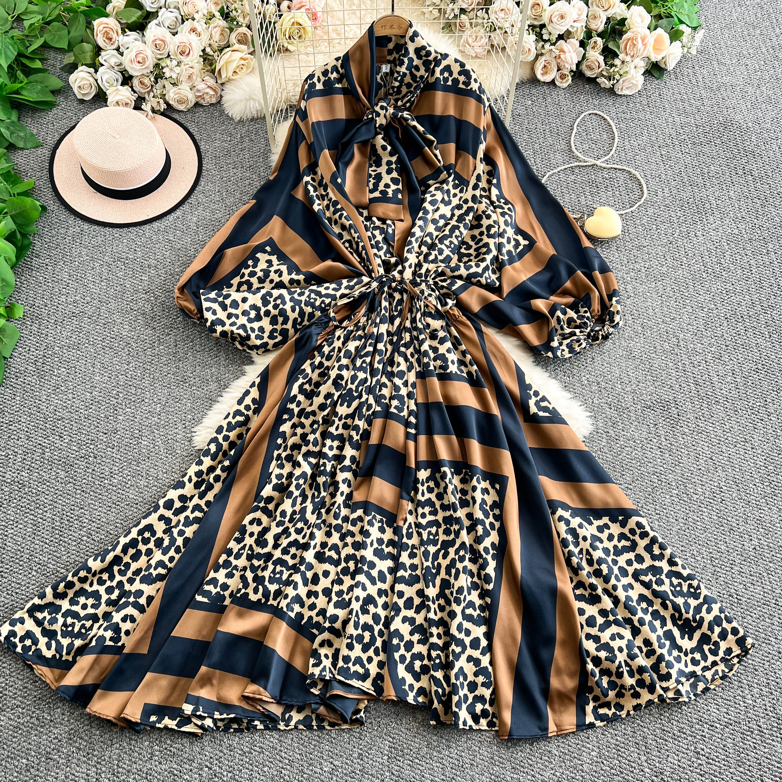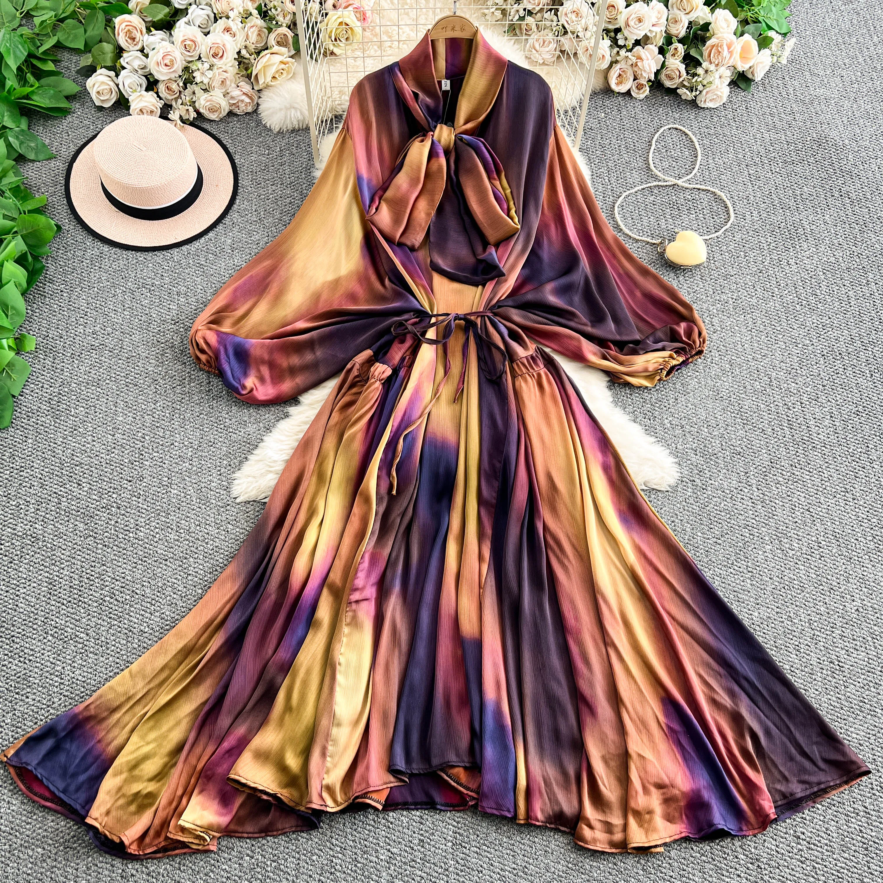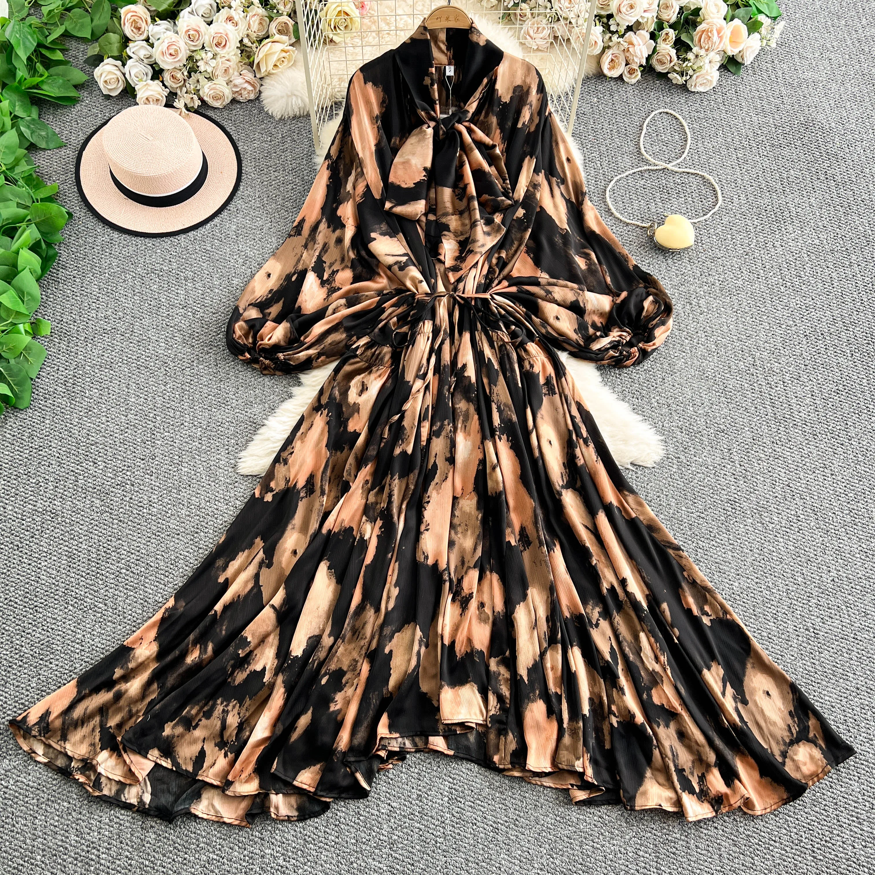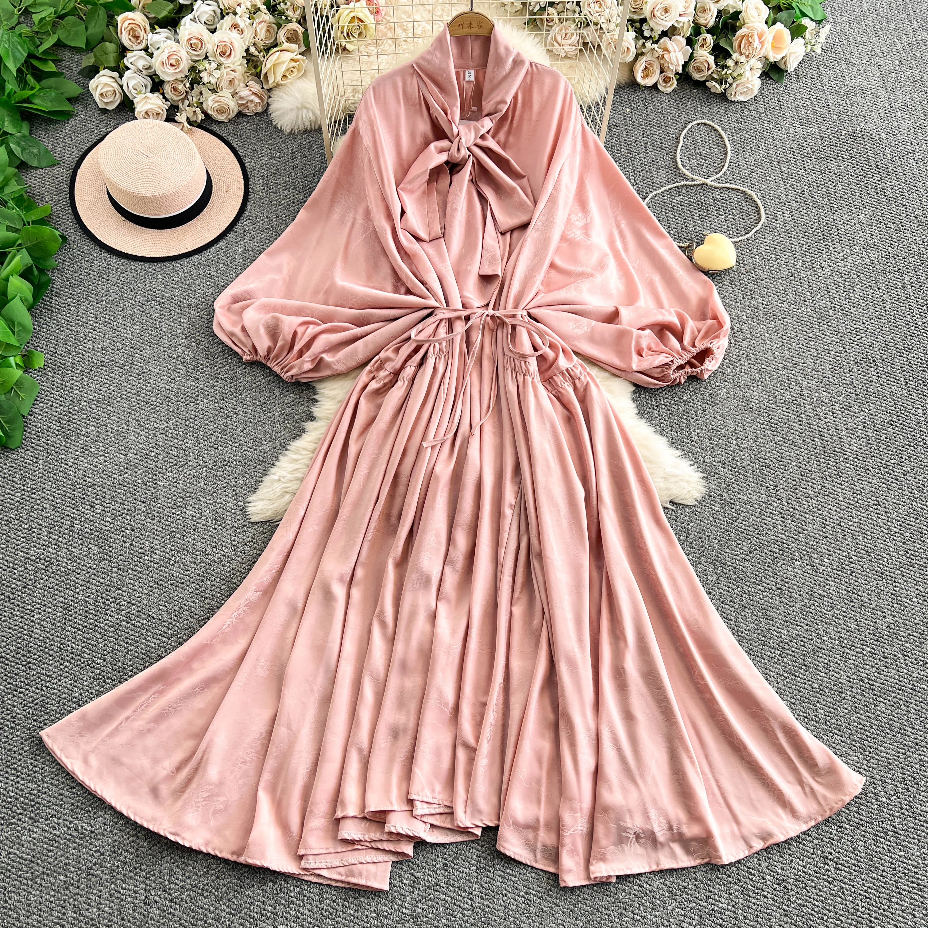 2025 Nuovo francese retrò pizzo con fiocco scollo a V manica lanterna Maxi abito da donna Casual Vintage Fashion Party grande gonna lunga altalena