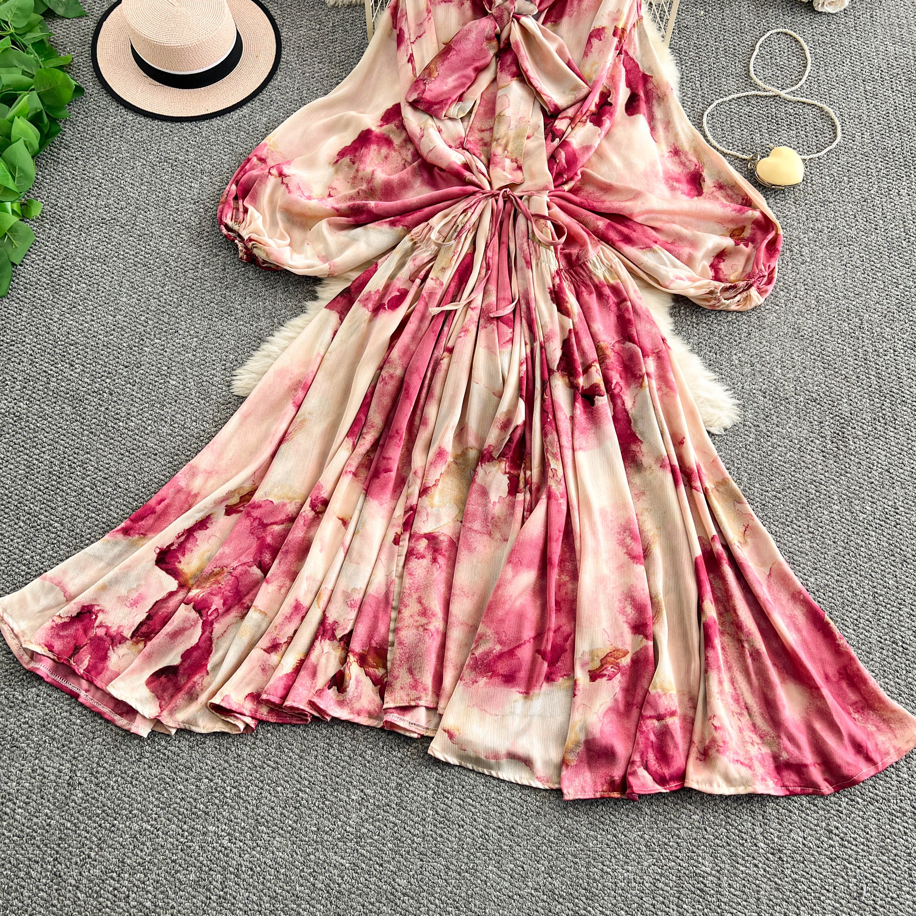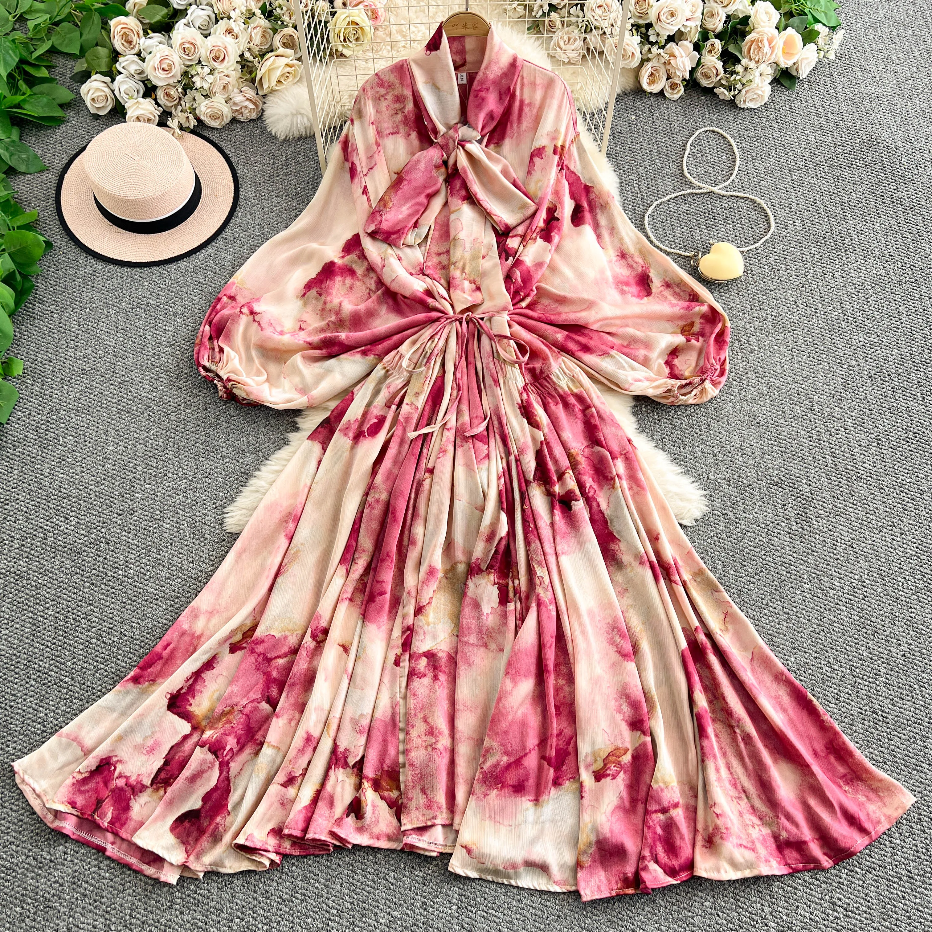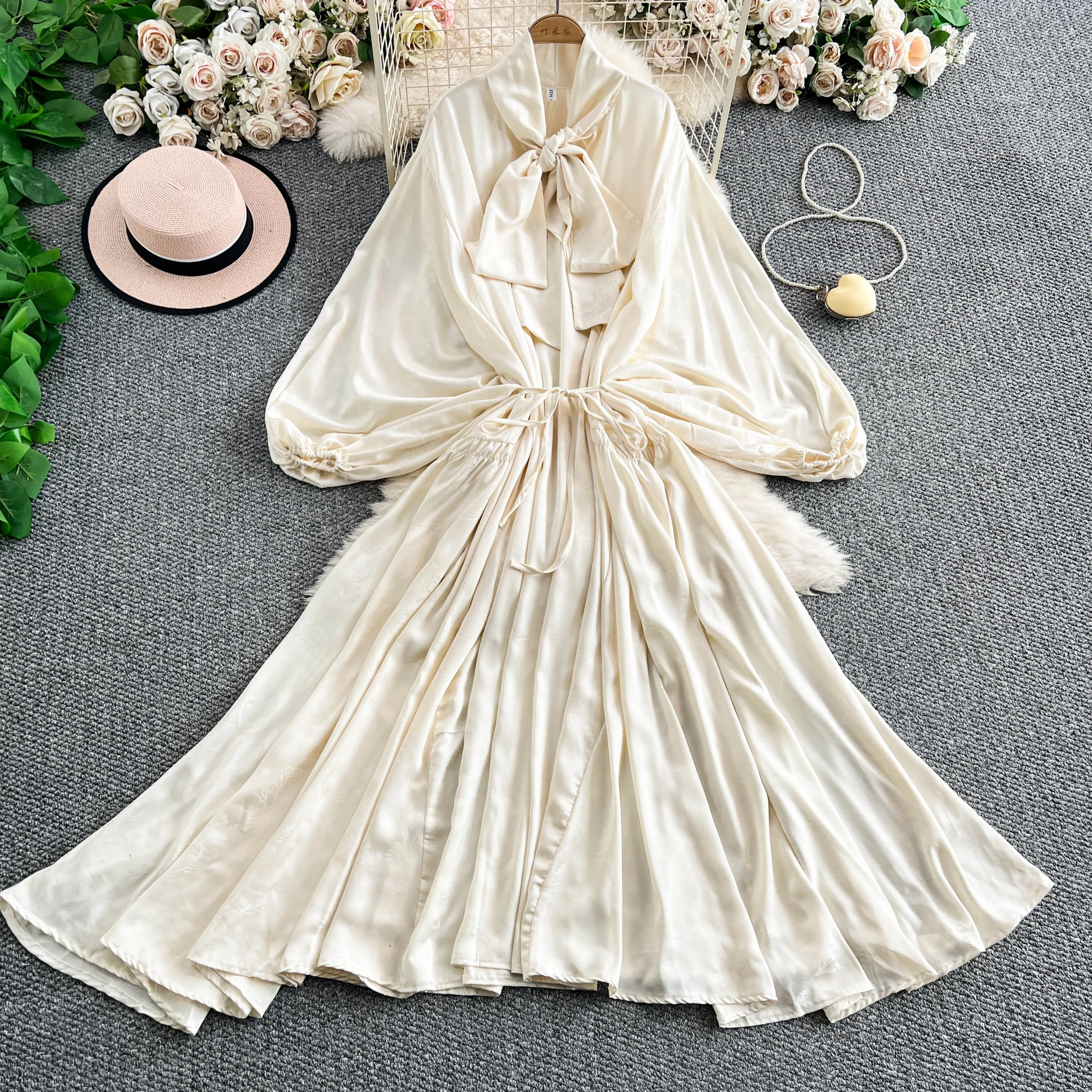 2025 Nuovo francese retrò pizzo con fiocco scollo a V manica lanterna Maxi abito da donna Casual Vintage Fashion Party grande gonna lunga altalena