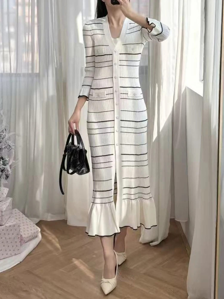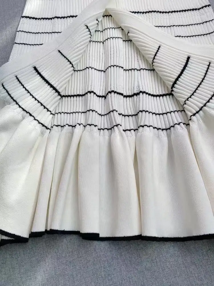 2025 Primavera estate New Fashion Nero Bianco Contrasto di Colore Della Banda Abito in Maglia da Donna Elegante Bordo con Volant Sottile con Scollo a V Veste da Donna