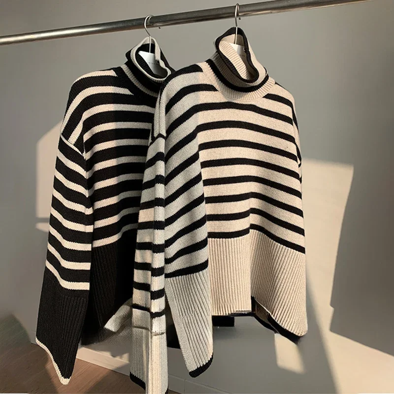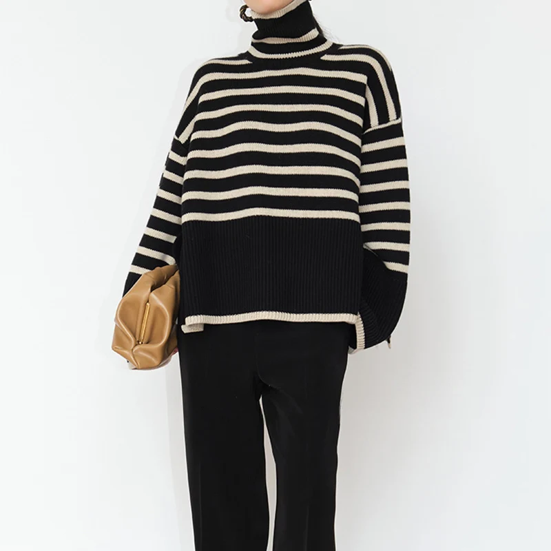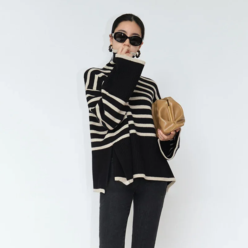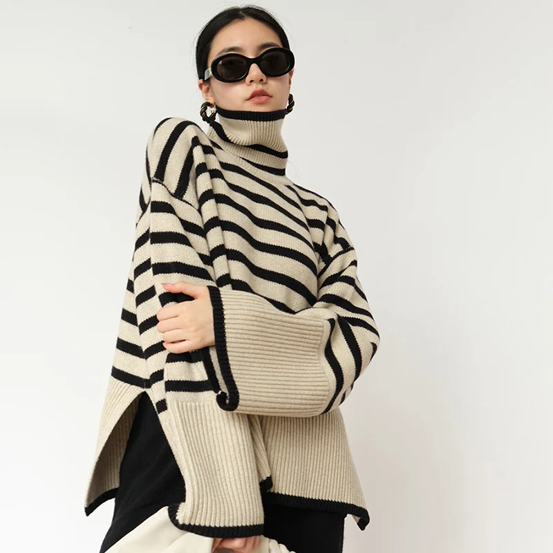 2025 Pullover dolcevita a righe da donna Maglioni con spacco laterale a colori a contrasto a costine Autunno Inverno Y2K Chic High Street Top lunghi