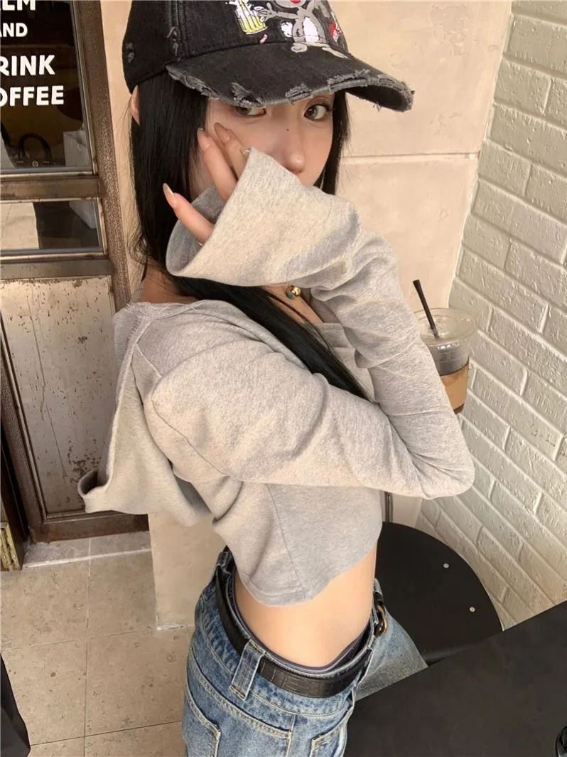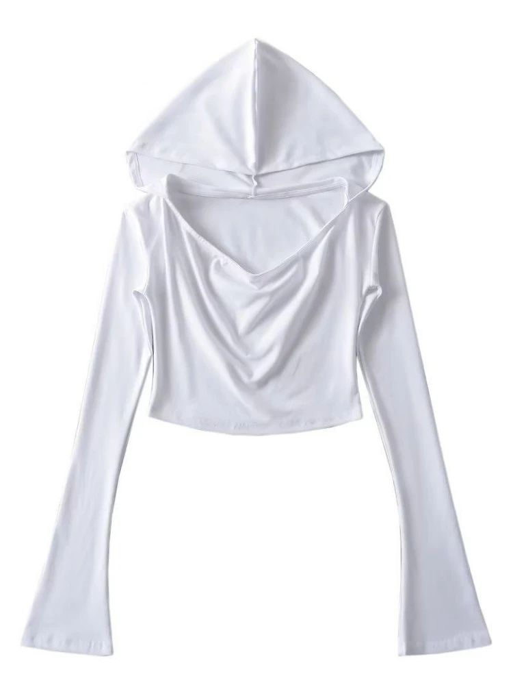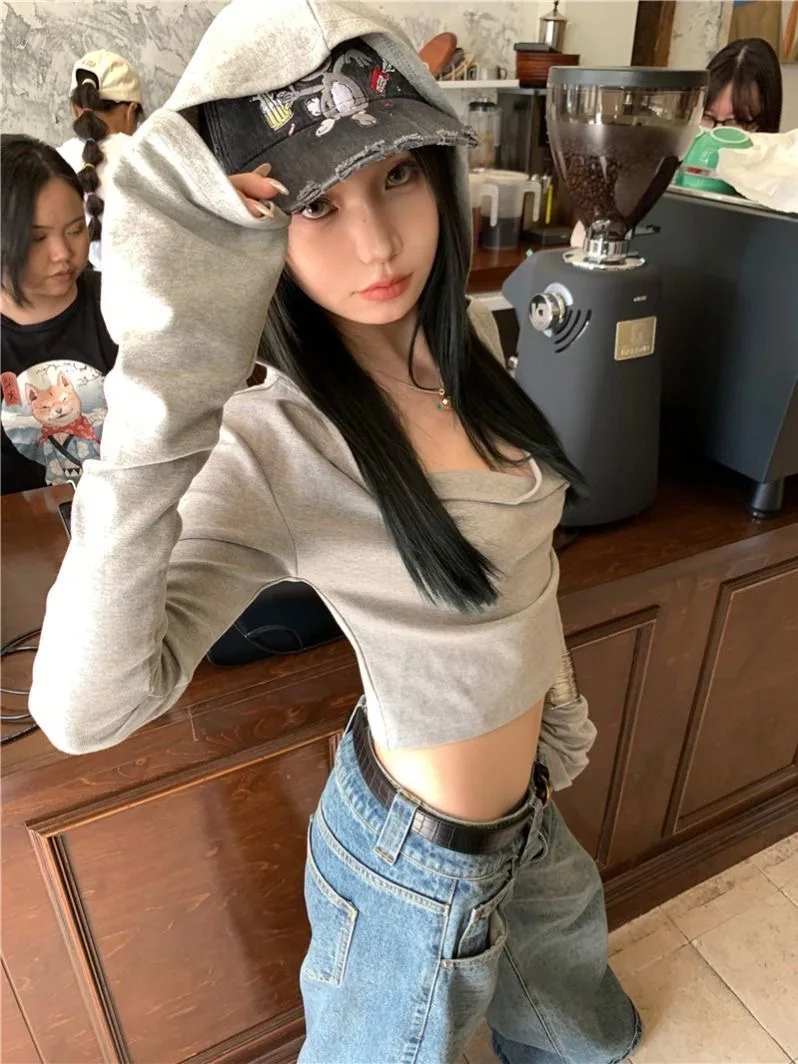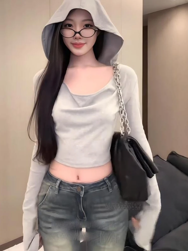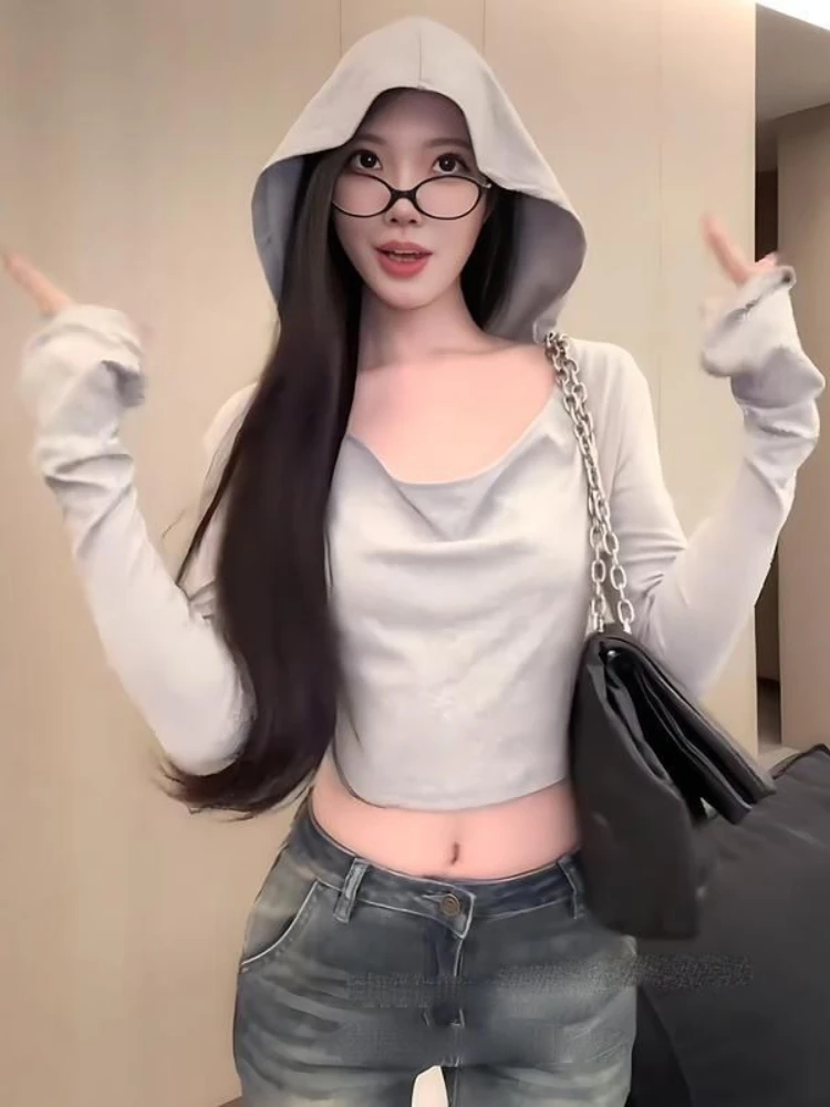 2025 Y2k Estetica Donna Casual T-shirt con cappuccio Streetwear Grunge Autunno Solid Magliette Harajuku Vintage Fata Ritagliata Tees Femme