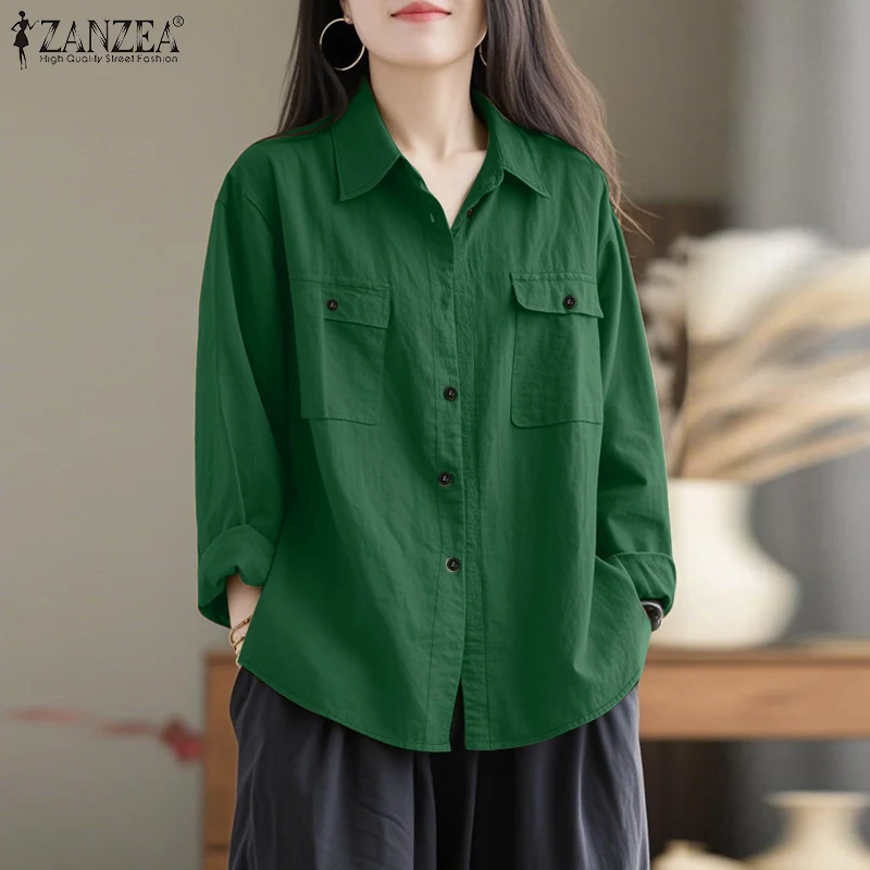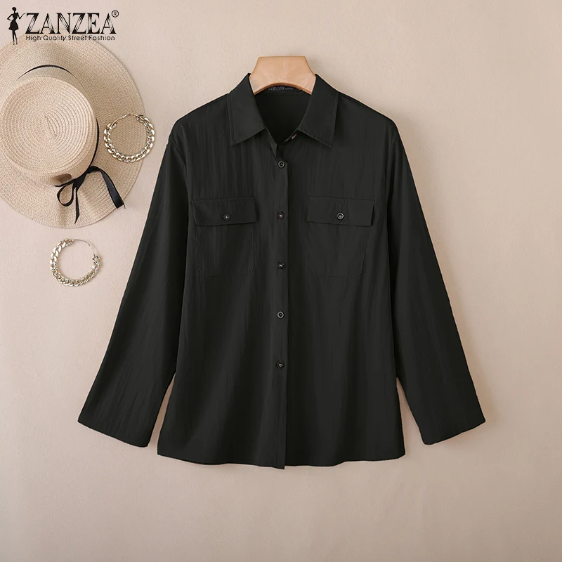 2025 ZANZEA Camicia moda autunno Camicetta da donna Collo con risvolto Top a maniche lunghe Elegante Solido Allentato OL Camicie da lavoro Tunica Blusas Femme