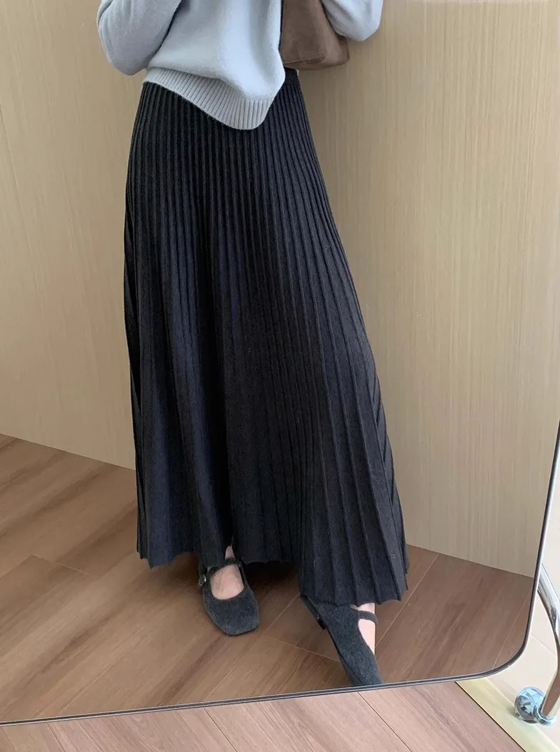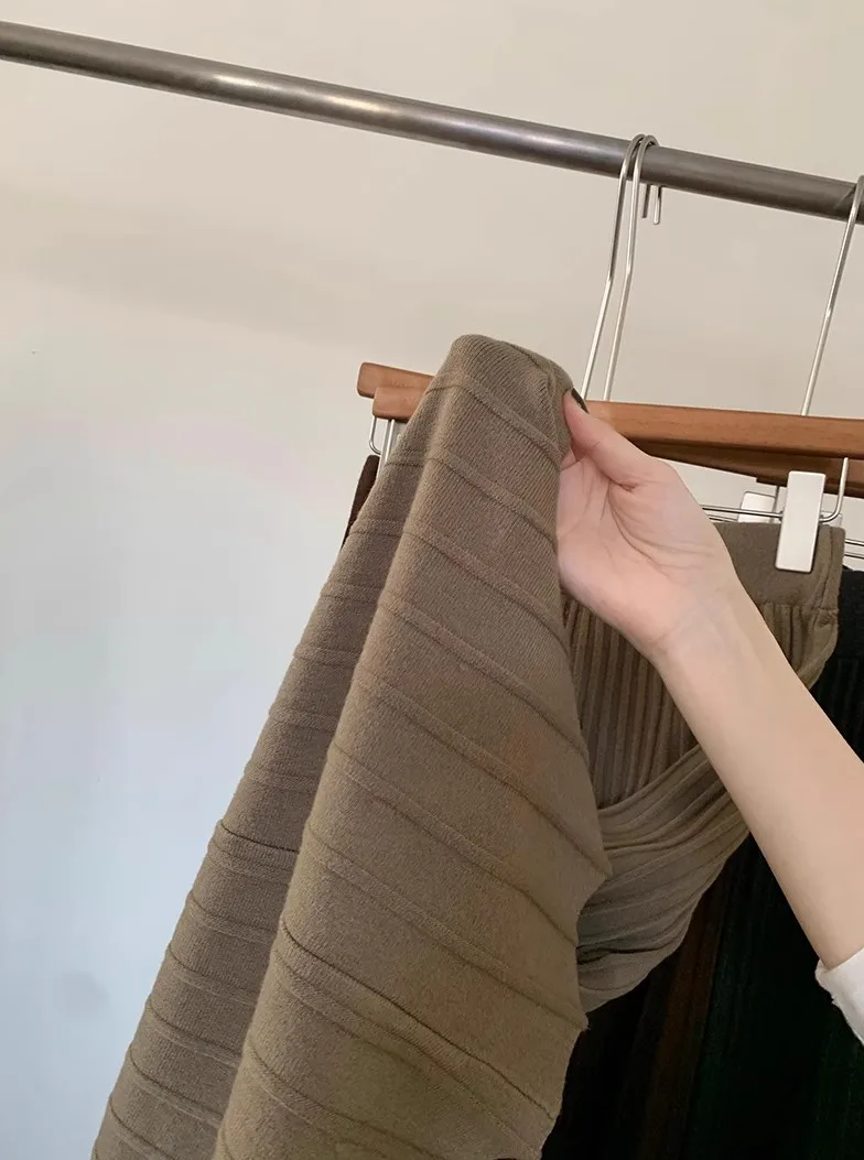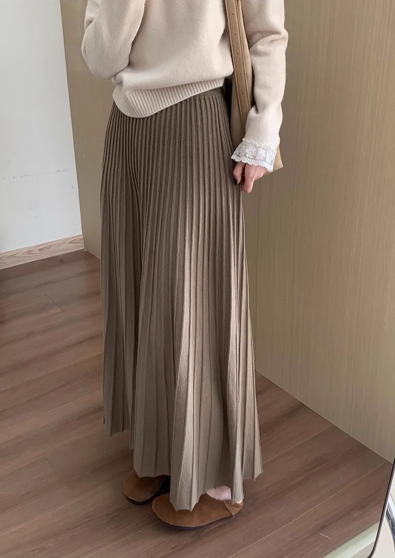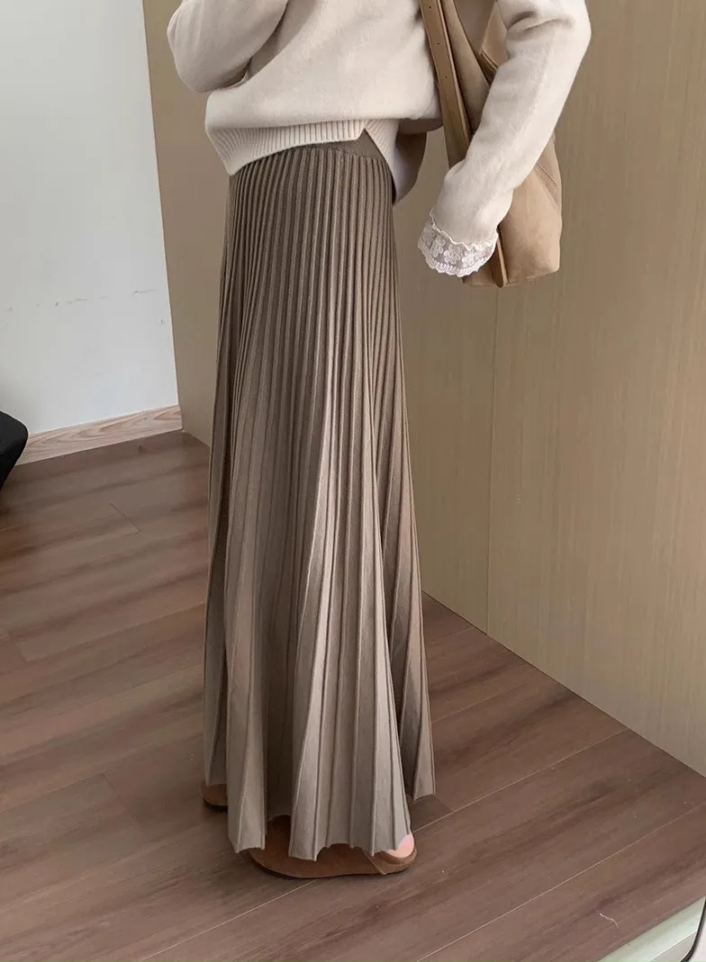 2026 Gonna longuette lavorata a maglia in cashmere kaki da donna, vestibilità ampia, drappeggiata, gonna a pieghe a trapezio snellente per l’autunno e l’inverno
