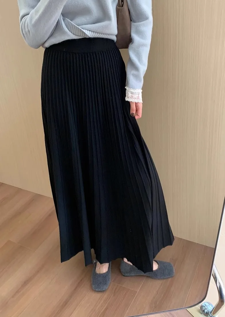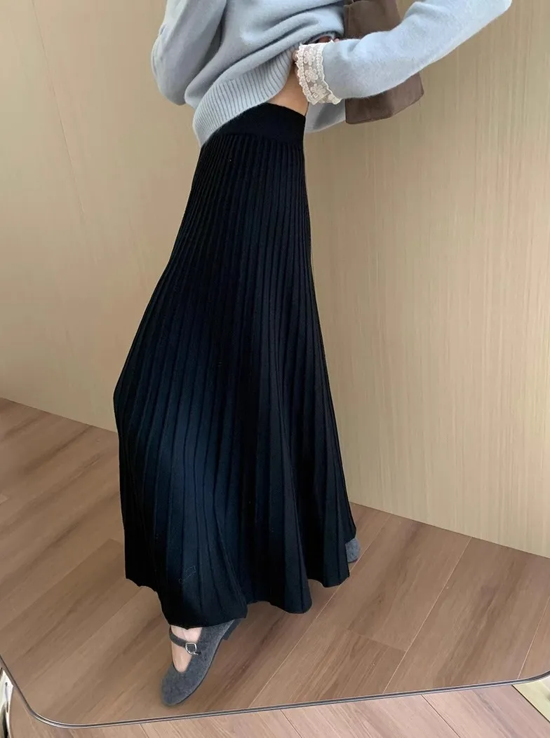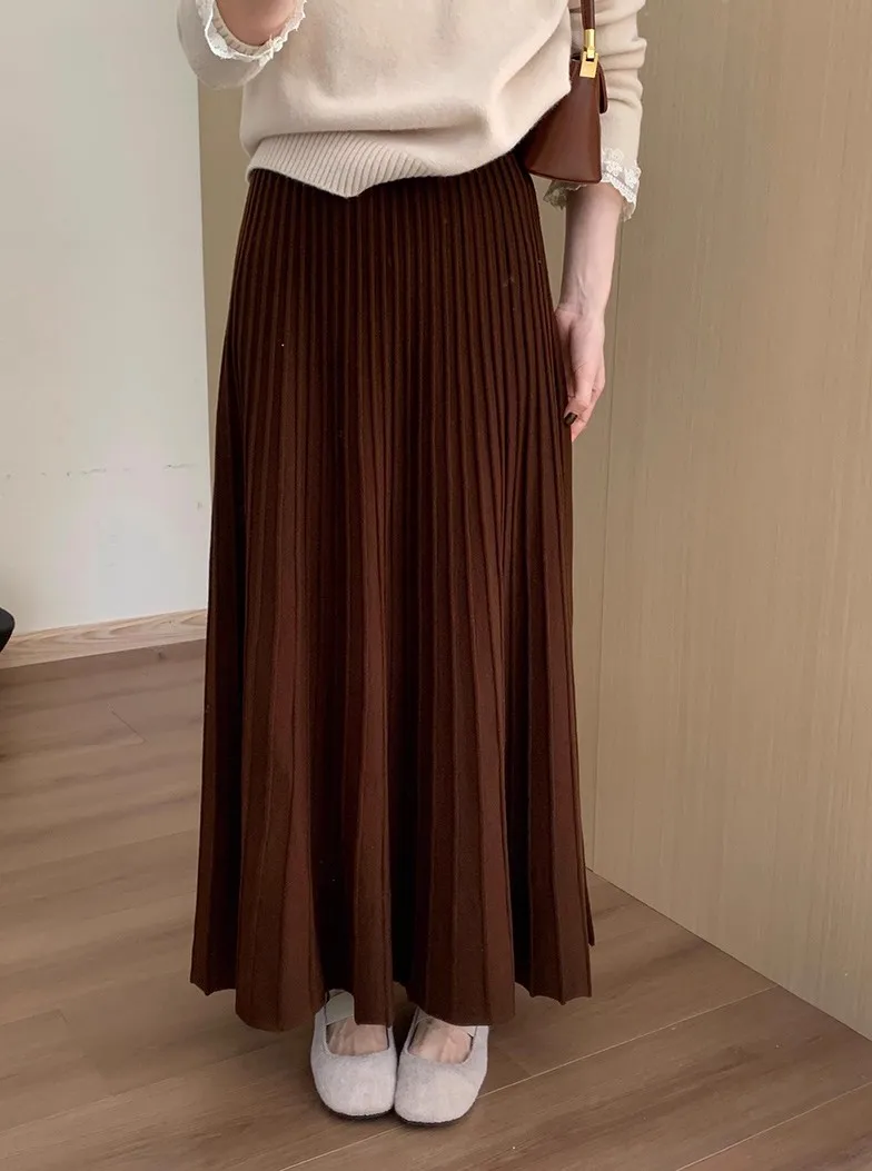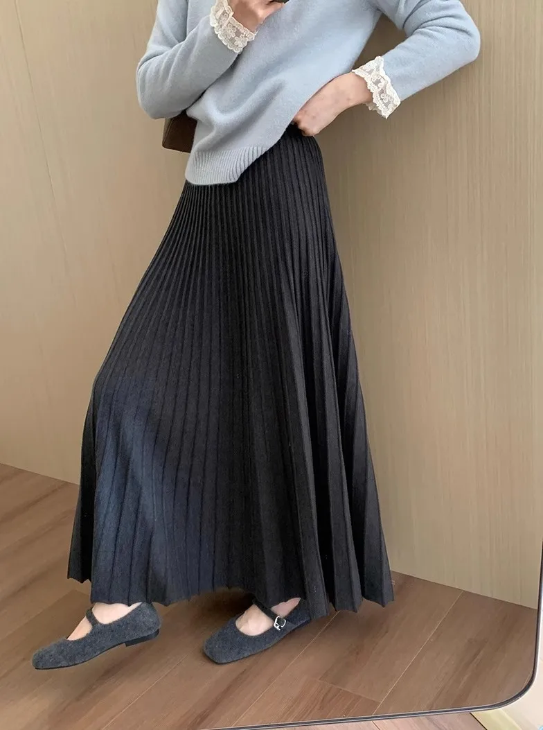 2026 Gonna longuette lavorata a maglia in cashmere kaki da donna, vestibilità ampia, drappeggiata, gonna a pieghe a trapezio snellente per l’autunno e l’inverno