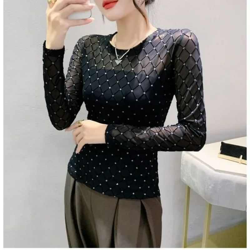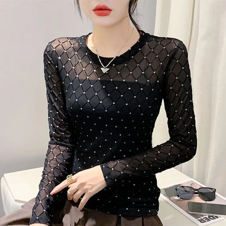 Abbigliamento donna Primavera Autunno Moda coreana Sexy vedere attraverso la maglia con strass T-shirt basic Elegante O collo manica lunga Slim Top