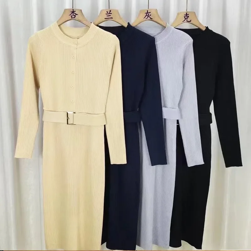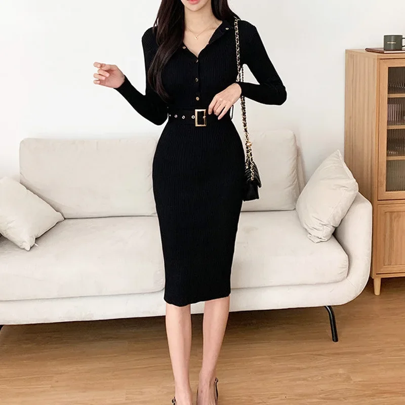 Abito aderente a maniche lunghe con colletto alla coreana monopetto elegante e sexy, abiti autunnali invernali attillati in maglia elasticizzata tinta unita