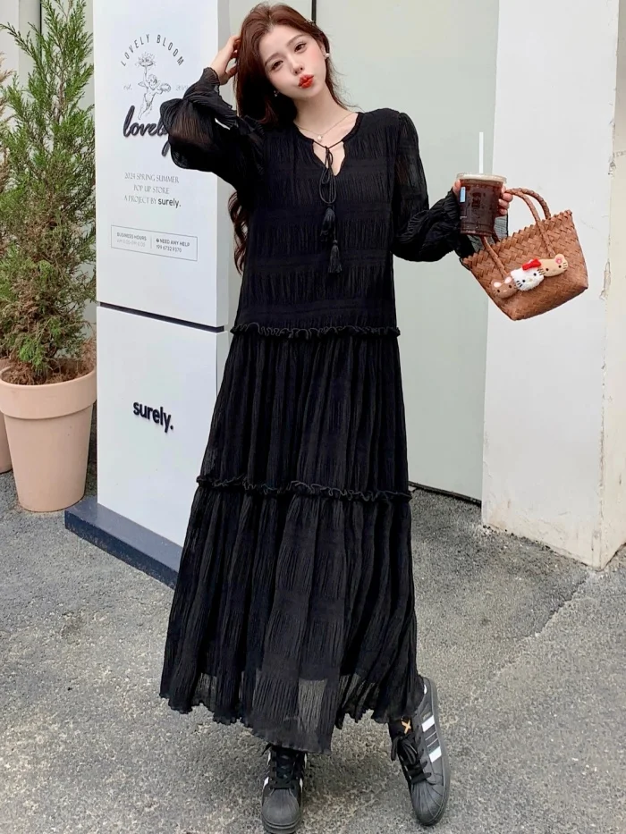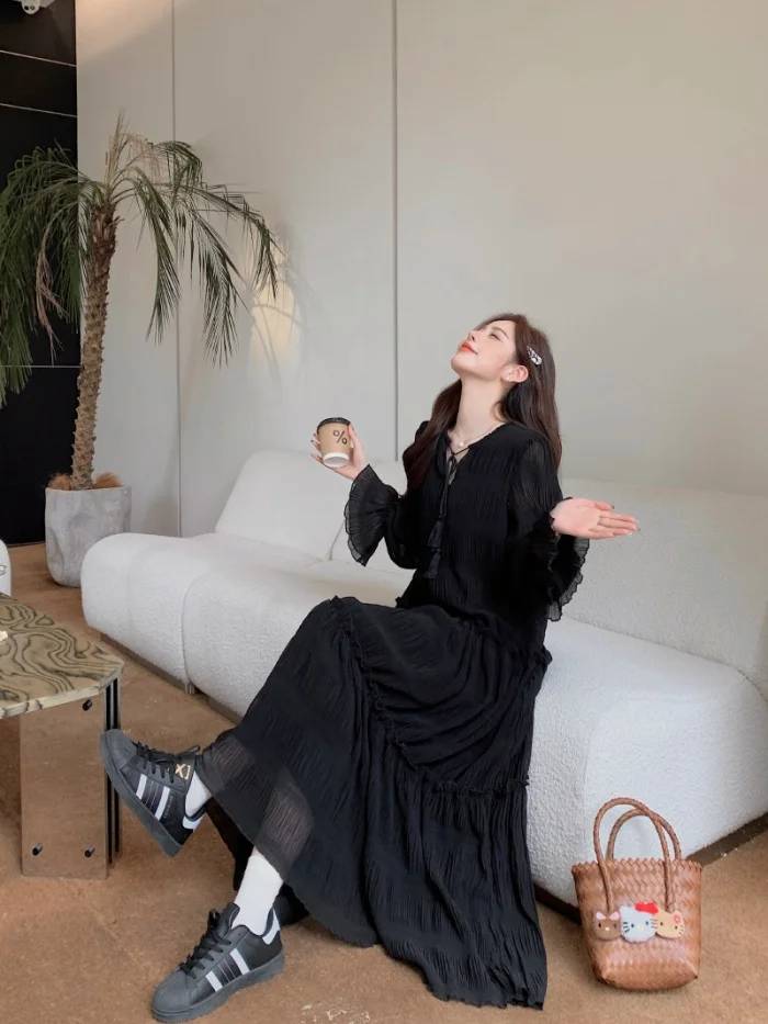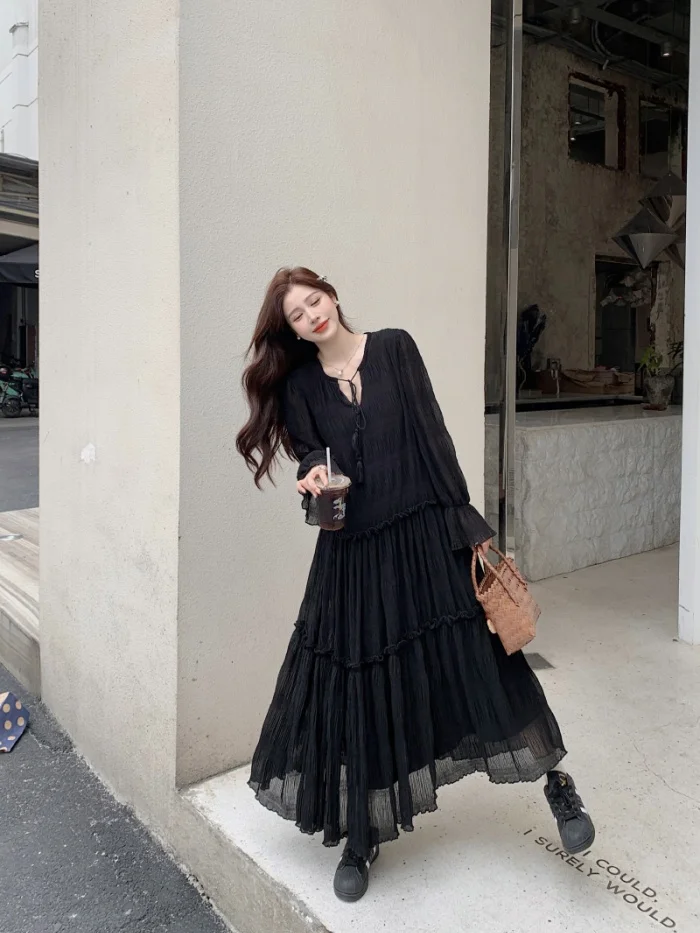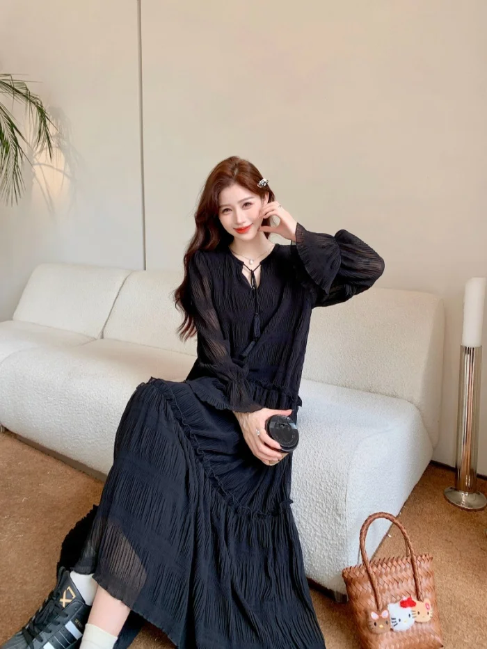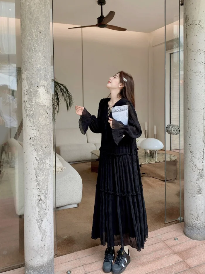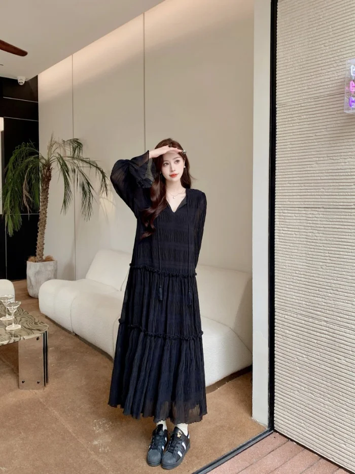 Abito ampio irregolare pieghettato con scollo a V retrò scuro per le donne Abito ampio casual con temperamento pigro autunnale w425