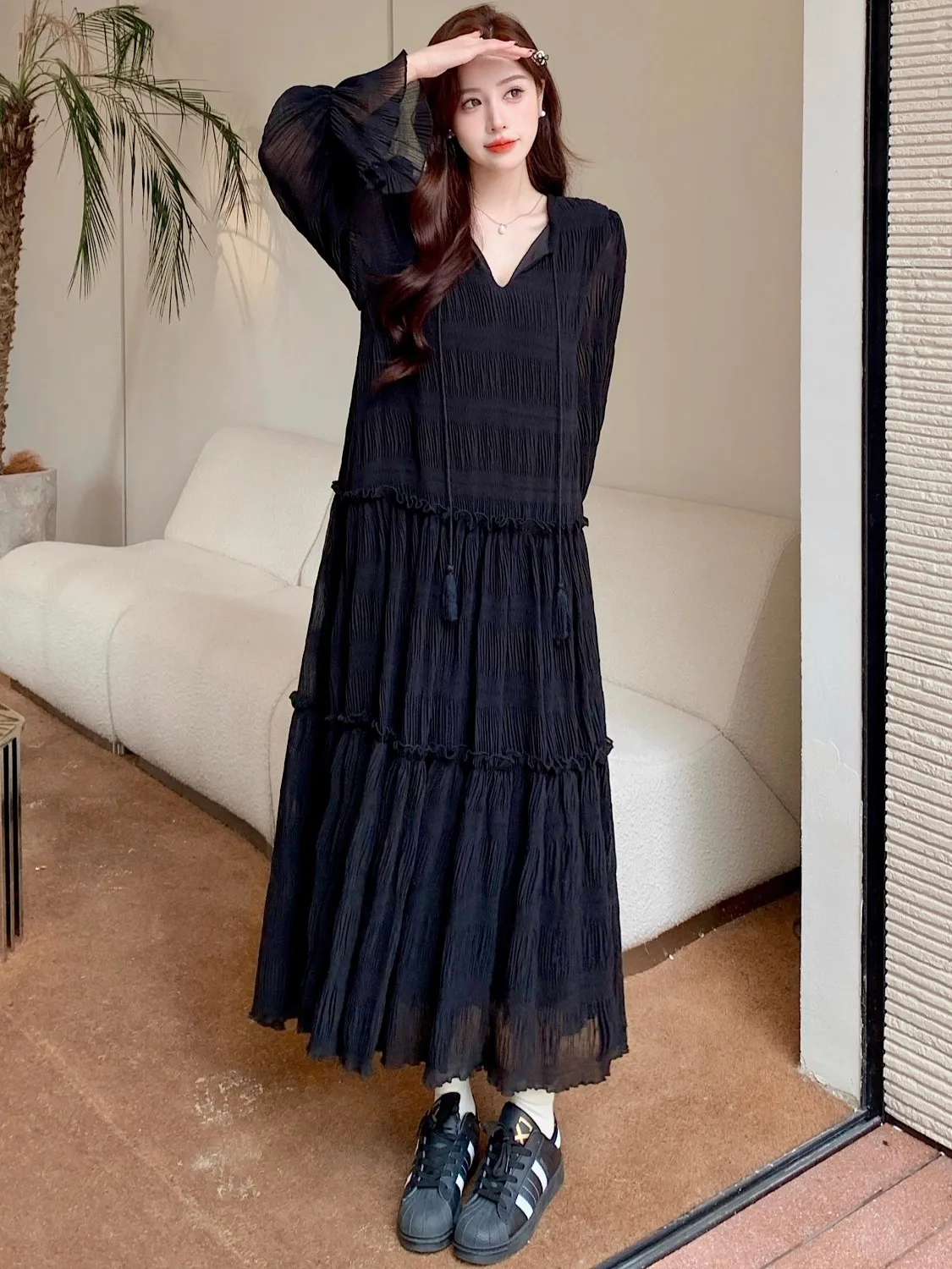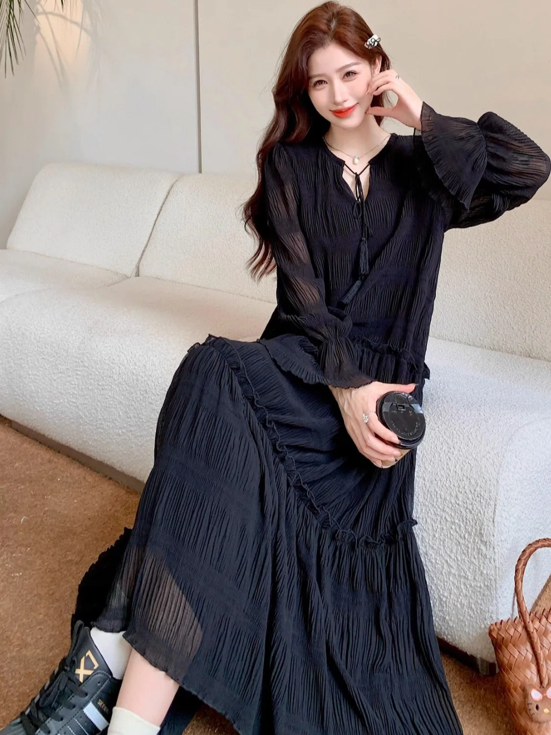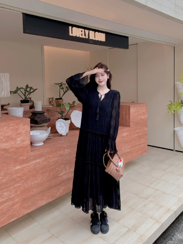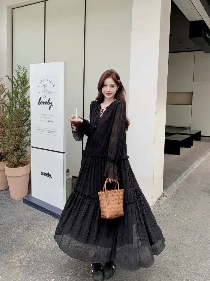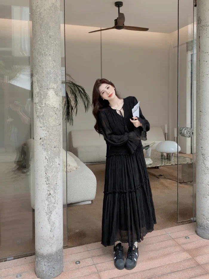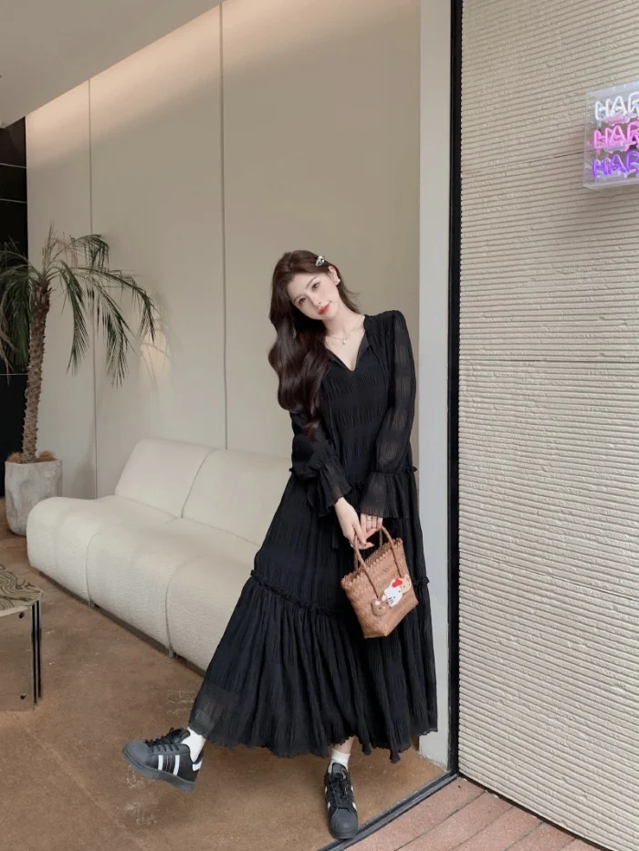 Abito ampio irregolare pieghettato con scollo a V retrò scuro per le donne Abito ampio casual con temperamento pigro autunnale w425