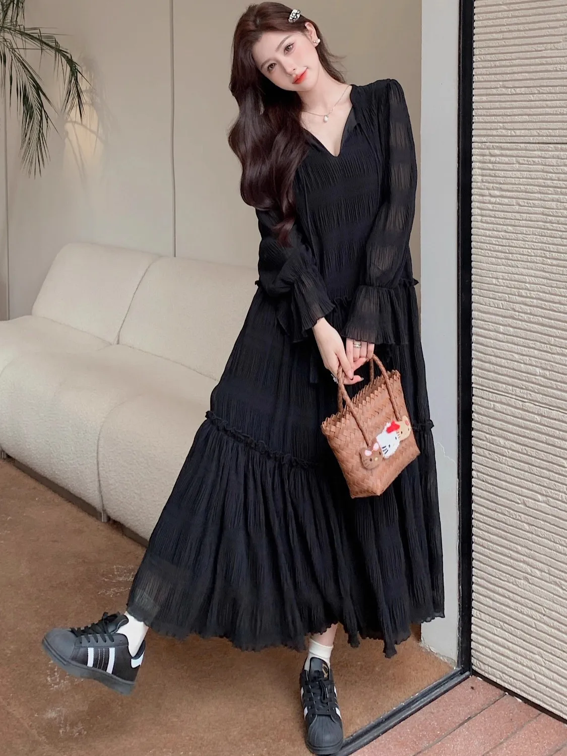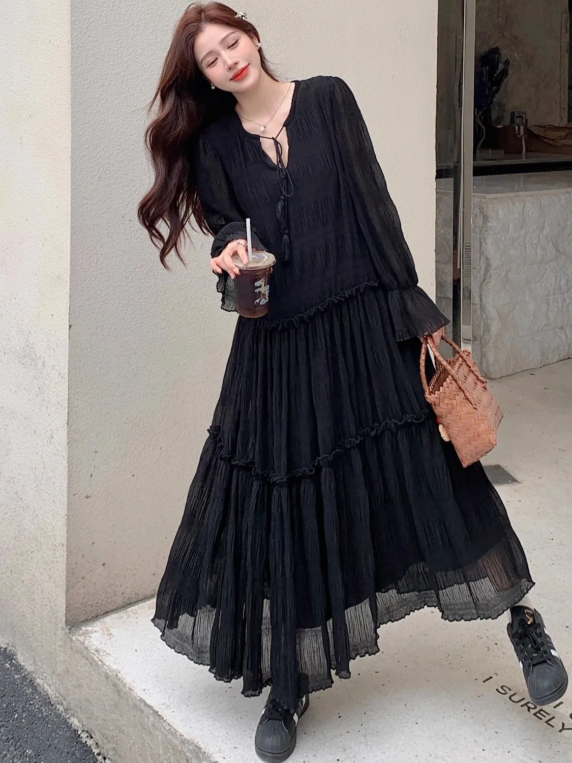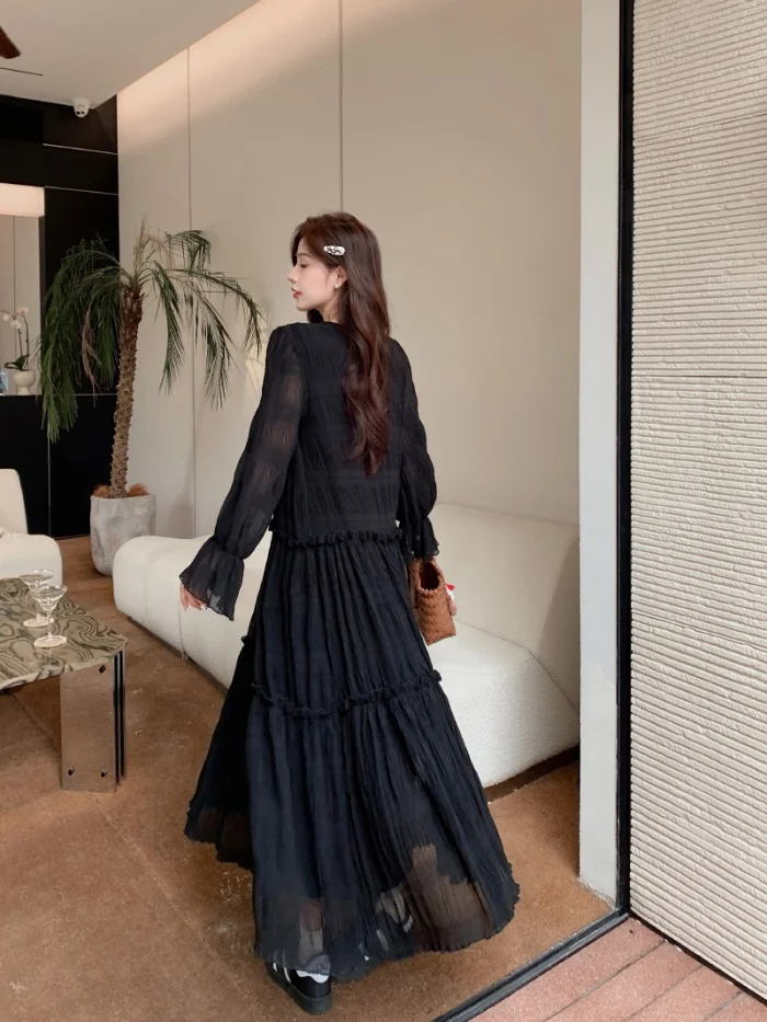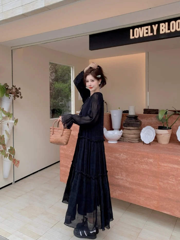 Abito ampio irregolare pieghettato con scollo a V retrò scuro per le donne Abito ampio casual con temperamento pigro autunnale w425