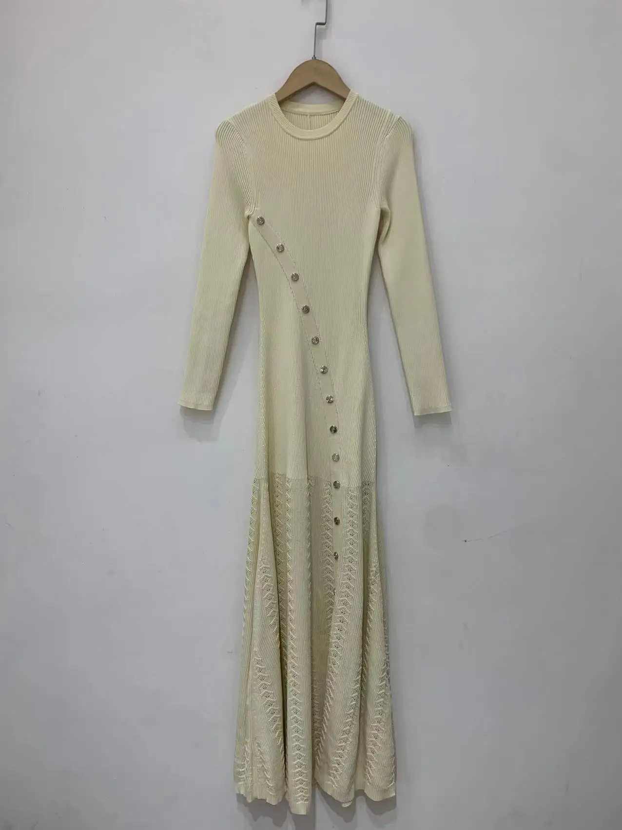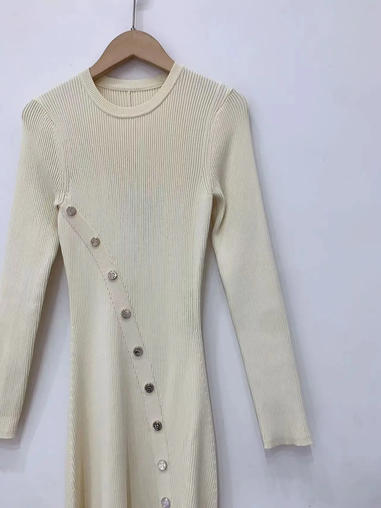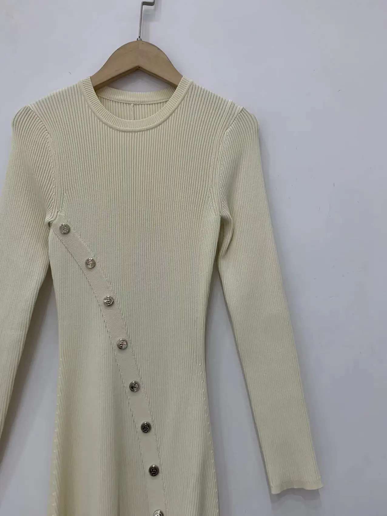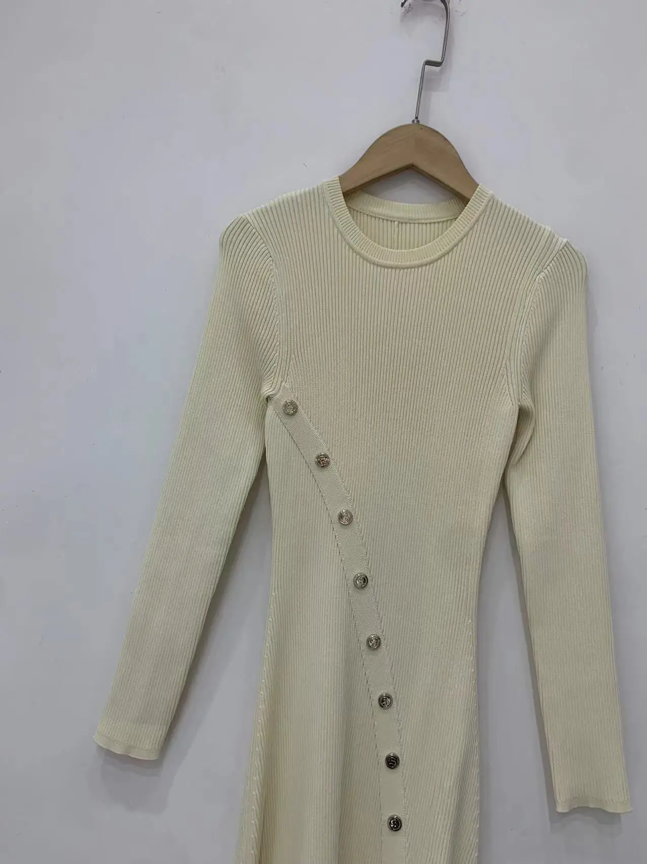 Abito da donna in maglia sottile con fibbia diagonale in metallo a maniche lunghe con spacco elegante
