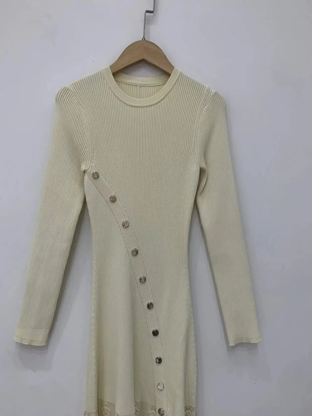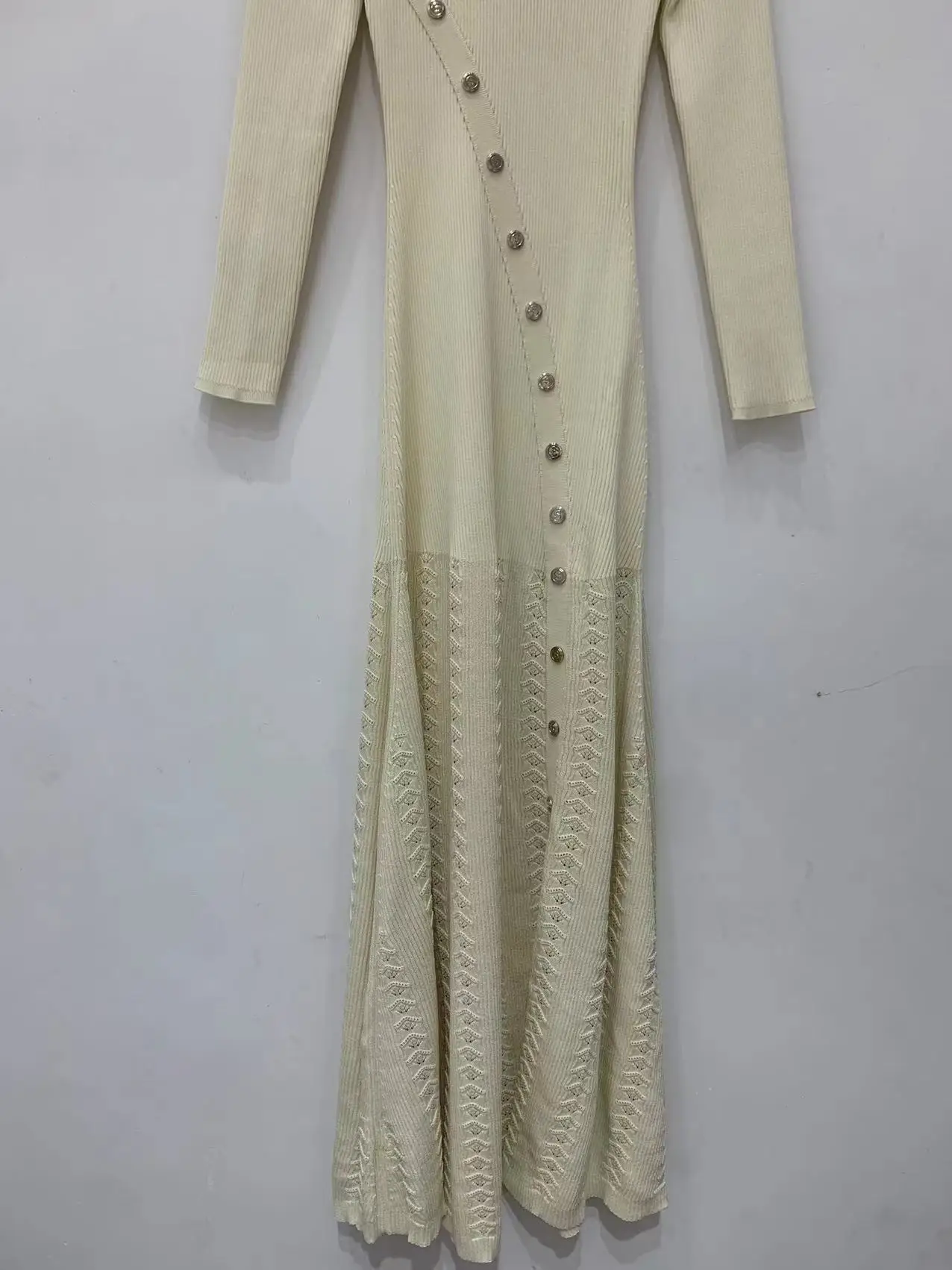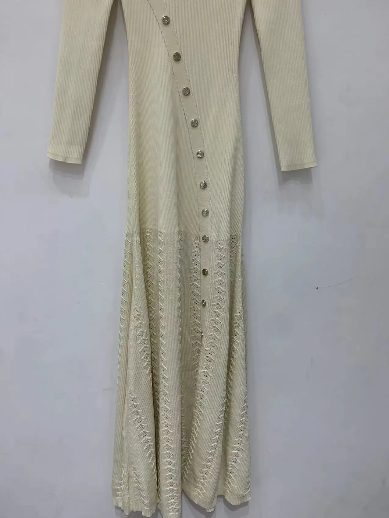 Abito da donna in maglia sottile con fibbia diagonale in metallo a maniche lunghe con spacco elegante