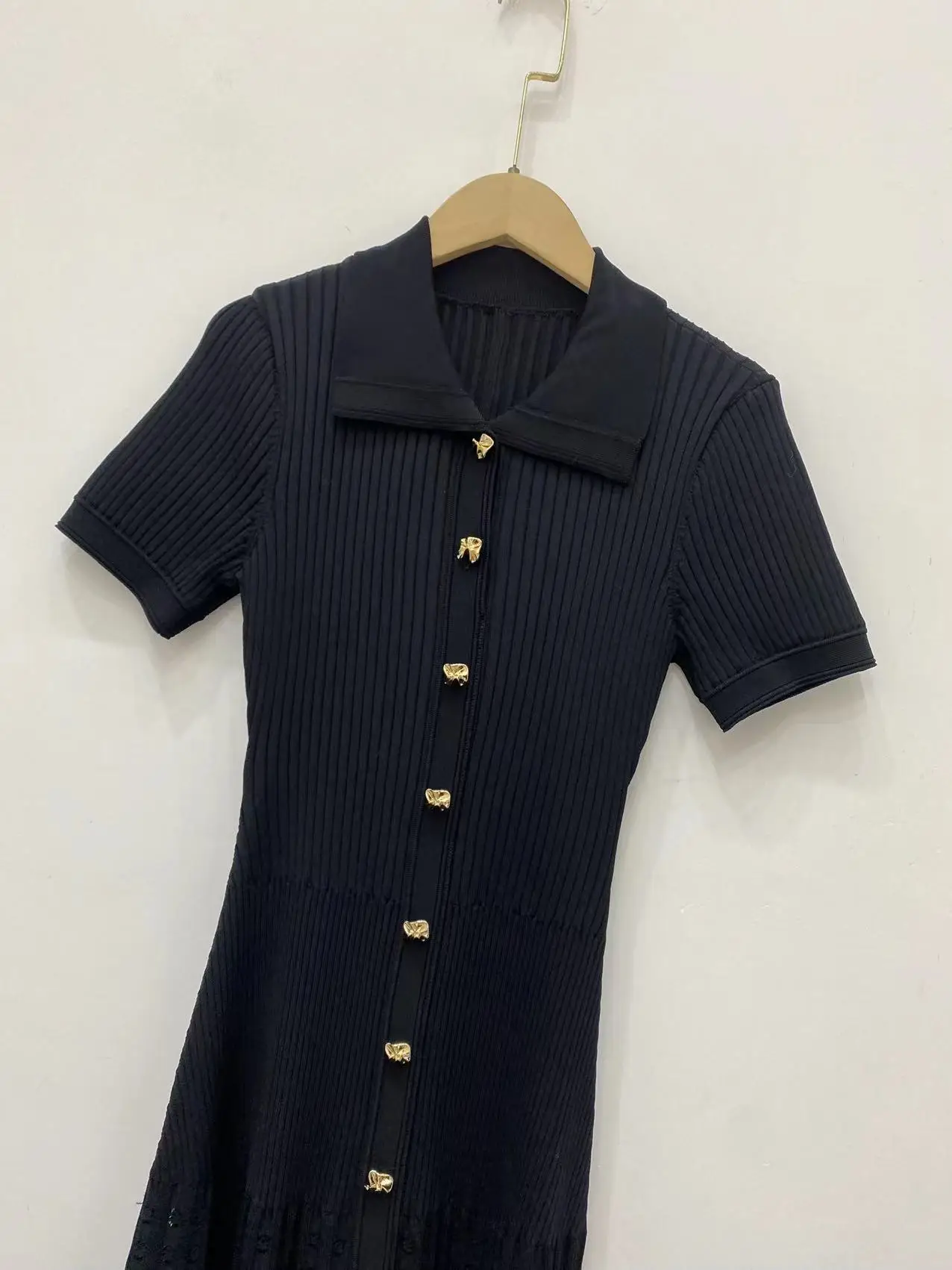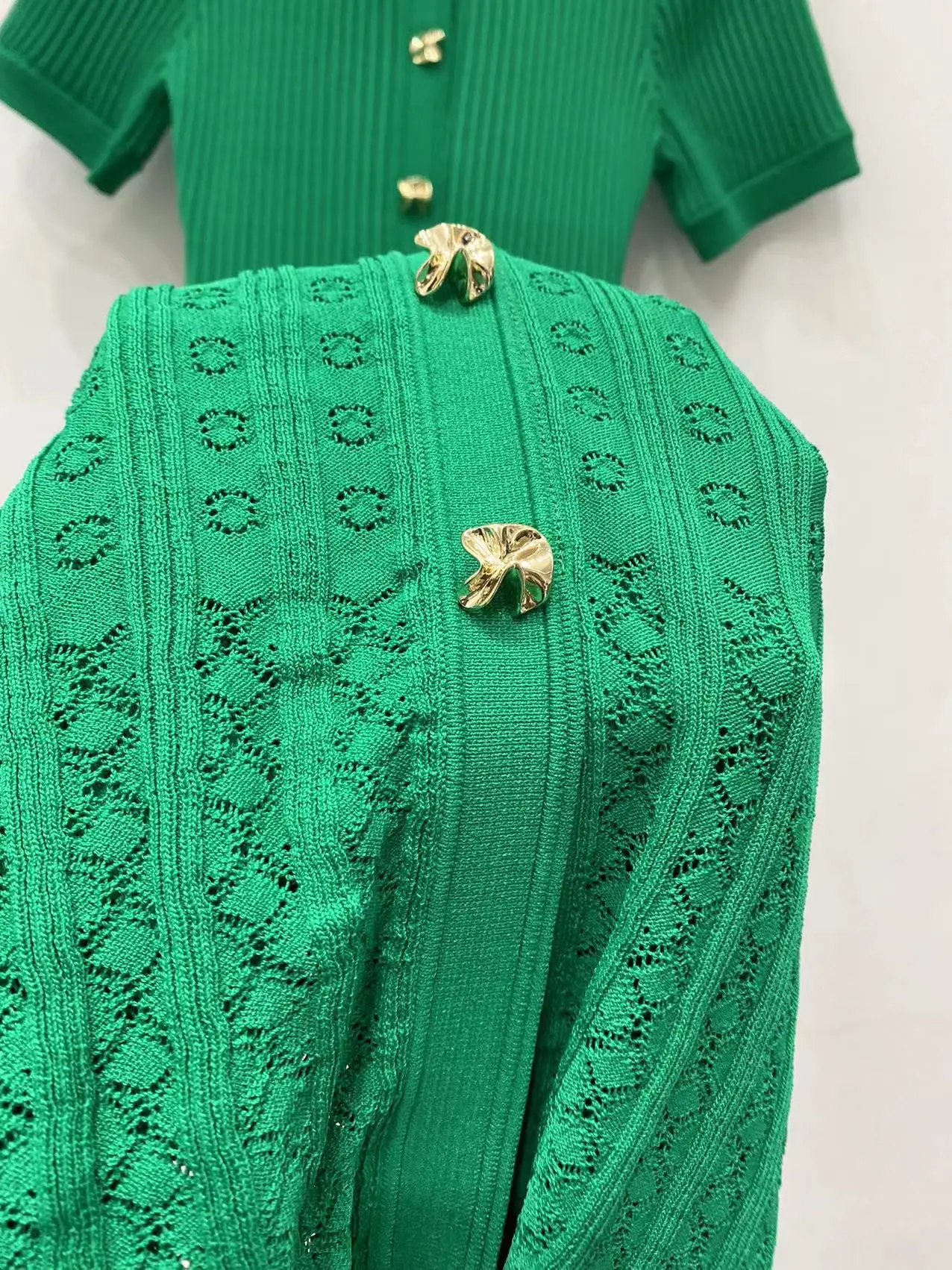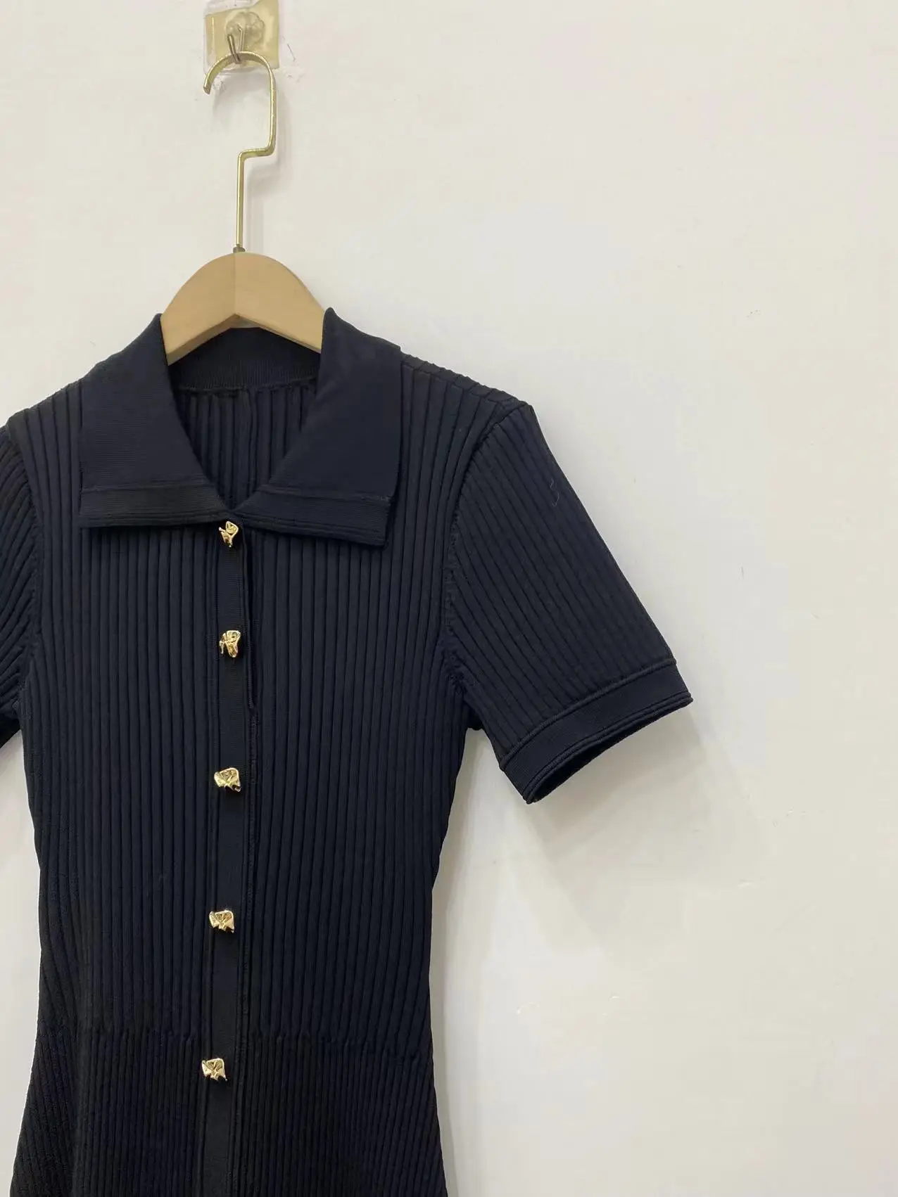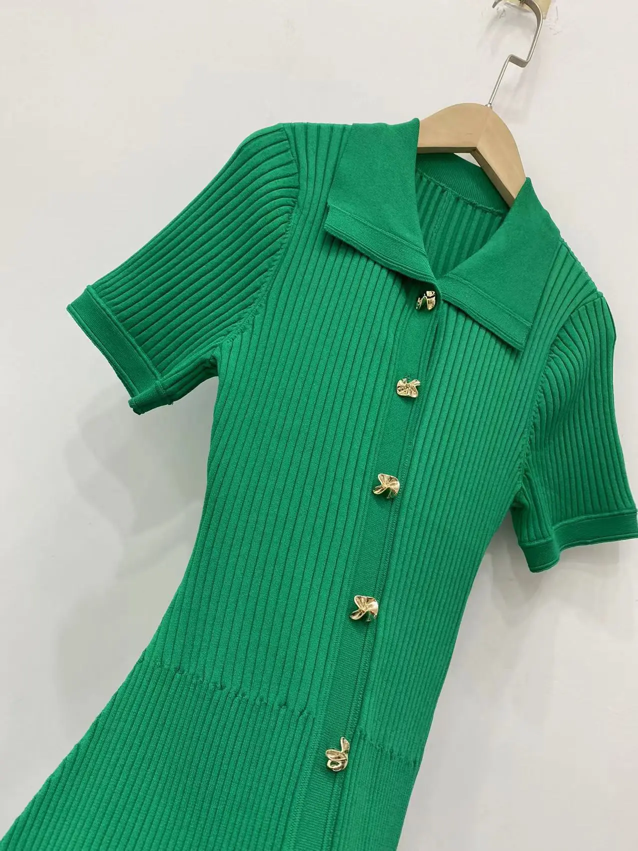 Abito da donna in maglia verde o nero Colletto rovesciato Elegante abito longuette monopetto a maniche corte