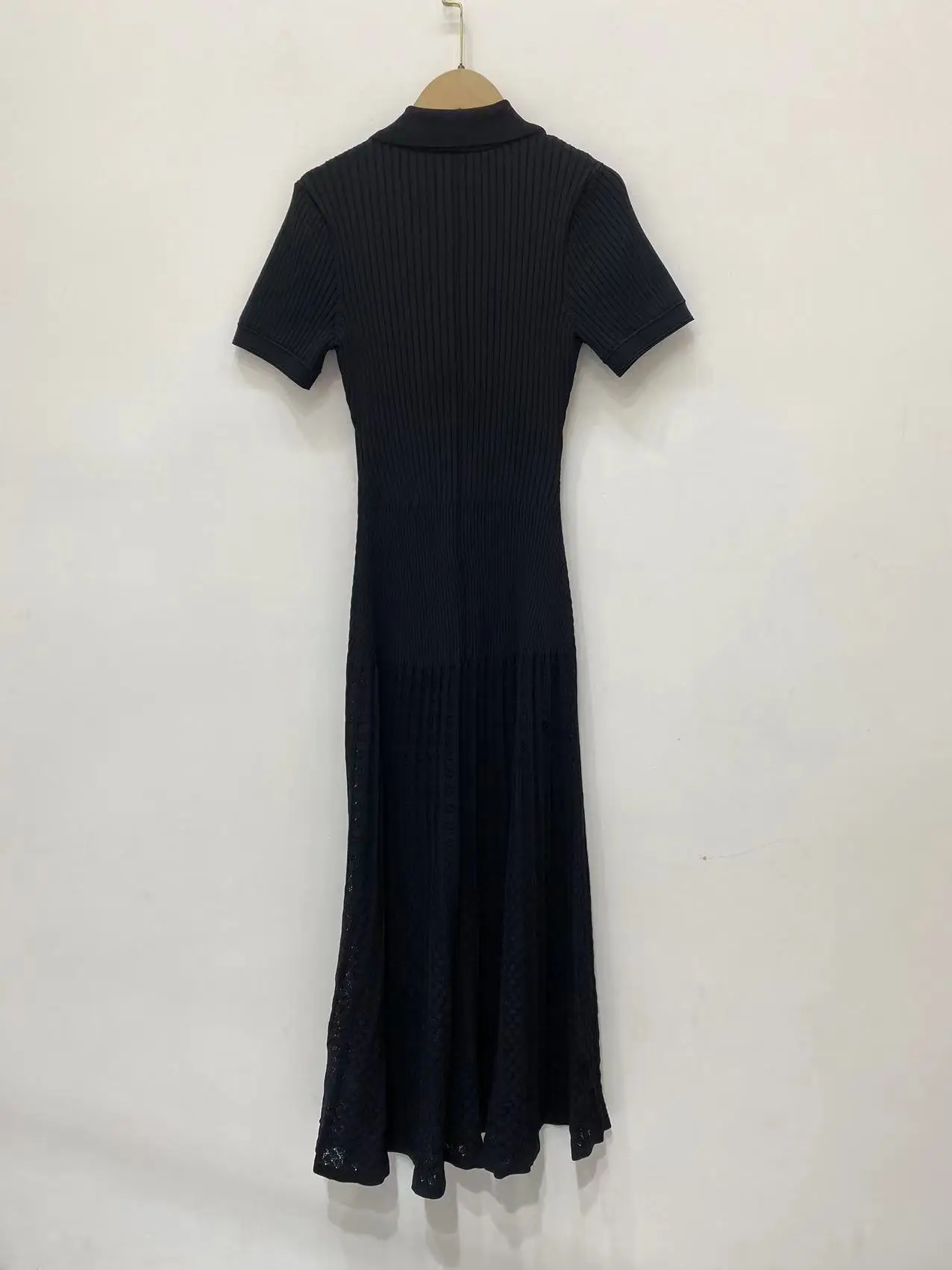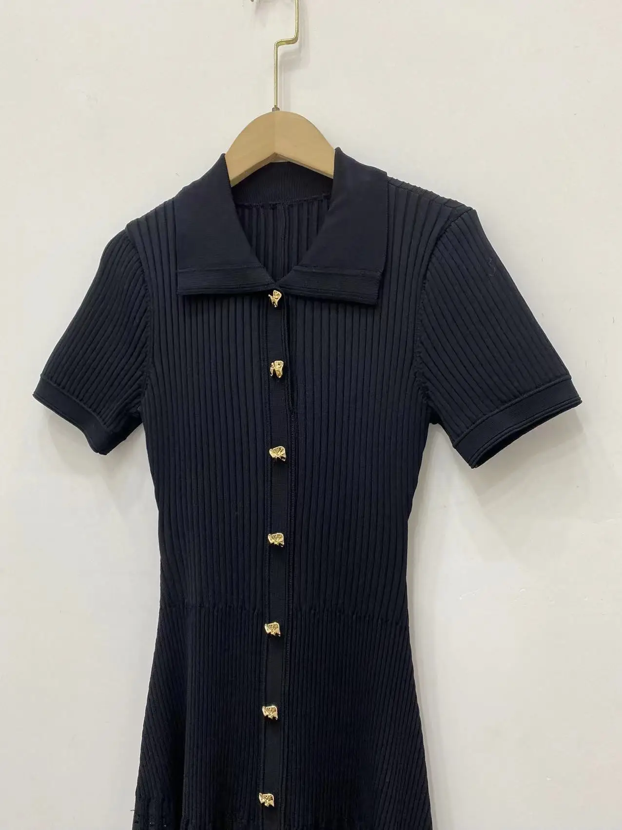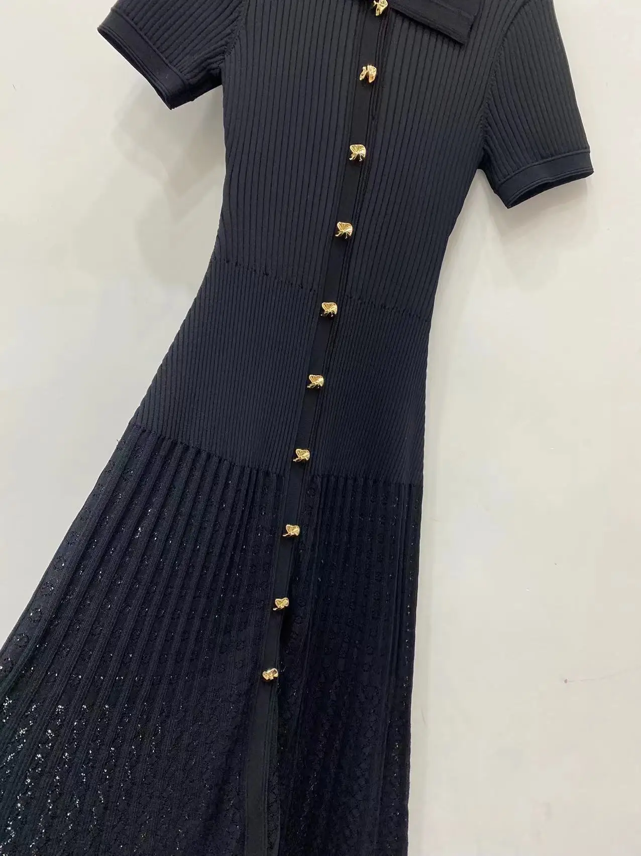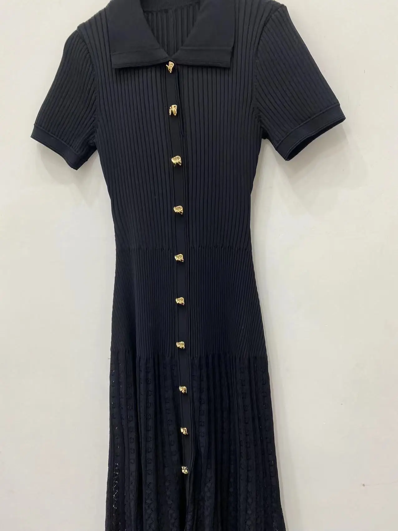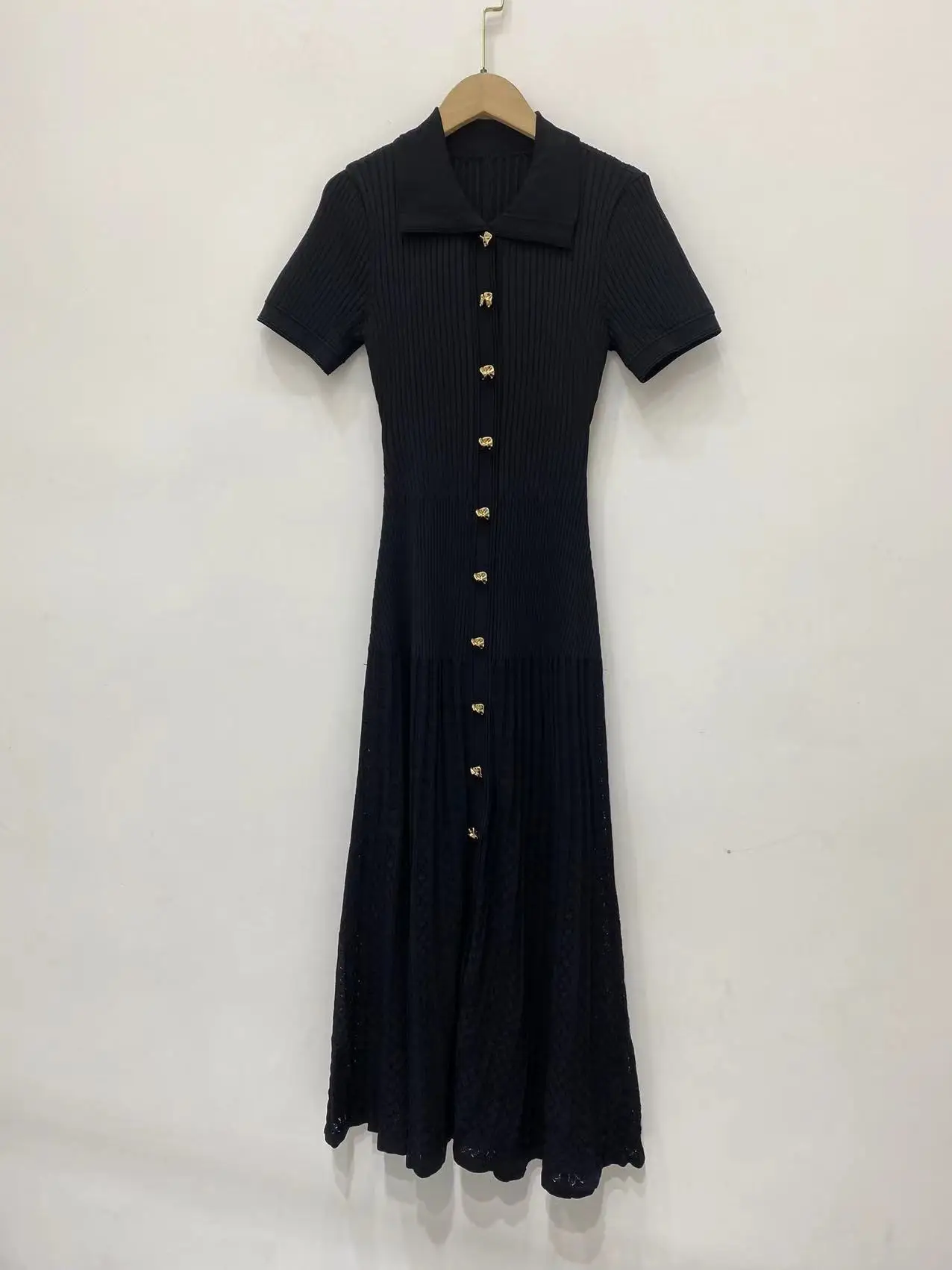 Abito da donna in maglia verde o nero Colletto rovesciato Elegante abito longuette monopetto a maniche corte