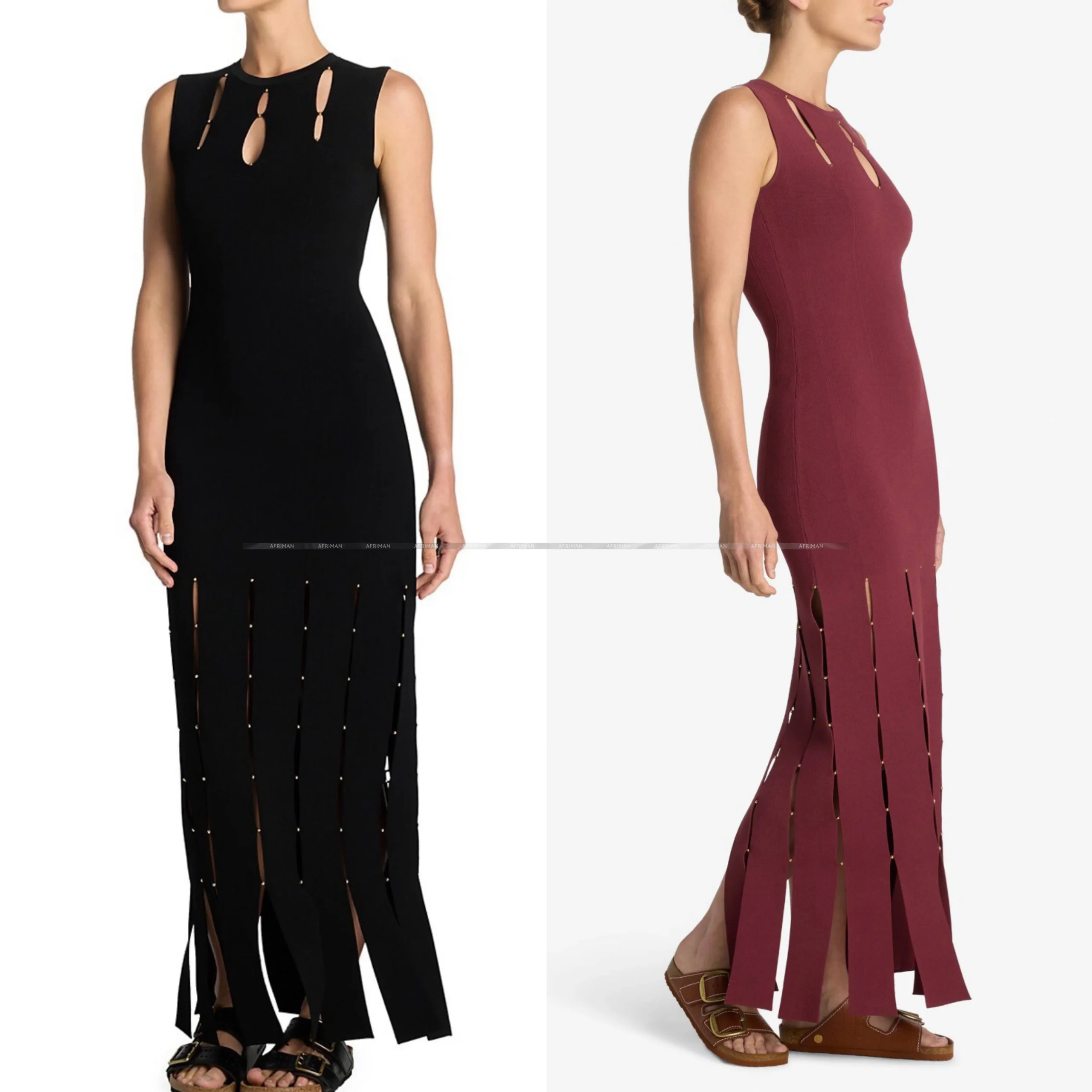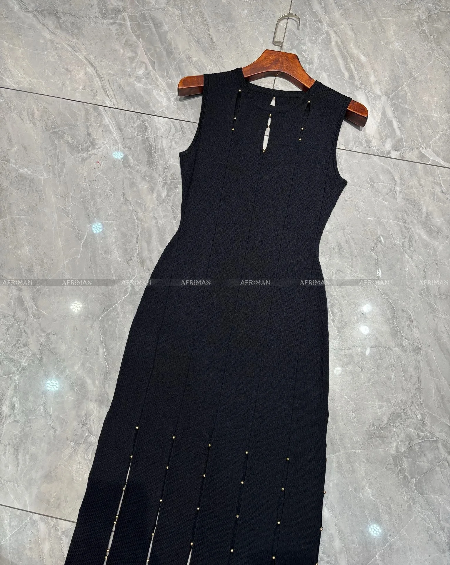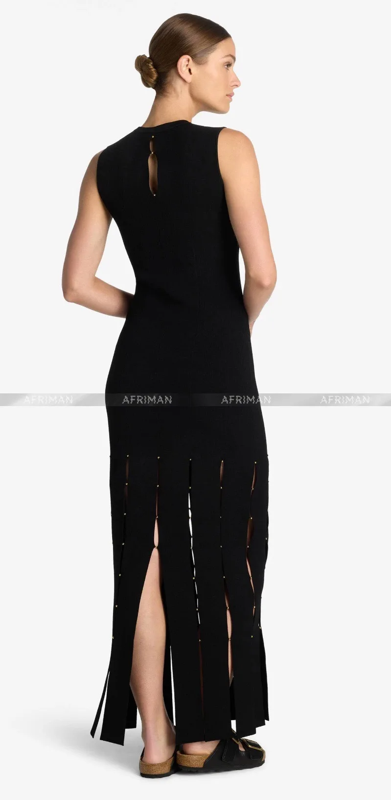 Abito da donna lungo con spacco in maglia elasticizzata scavata impreziosito da donna
