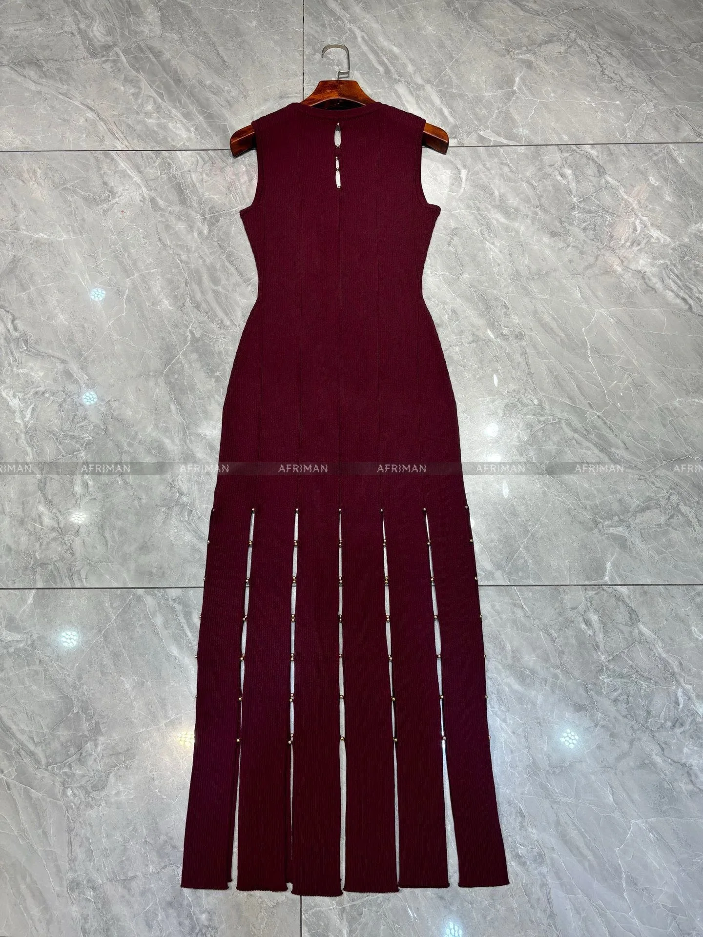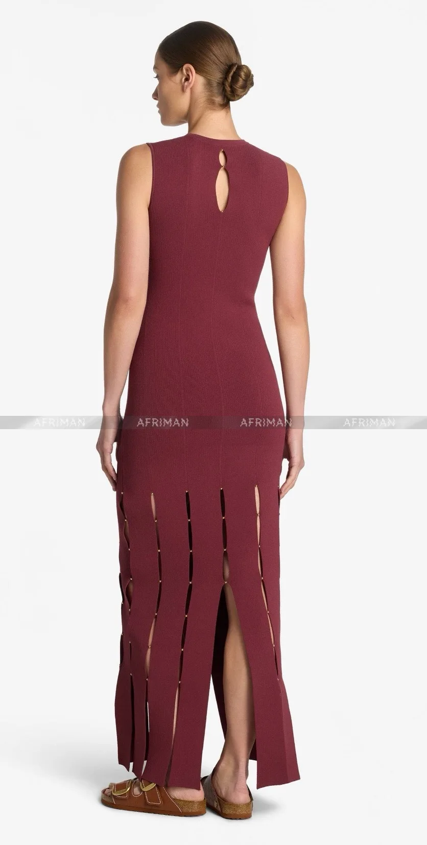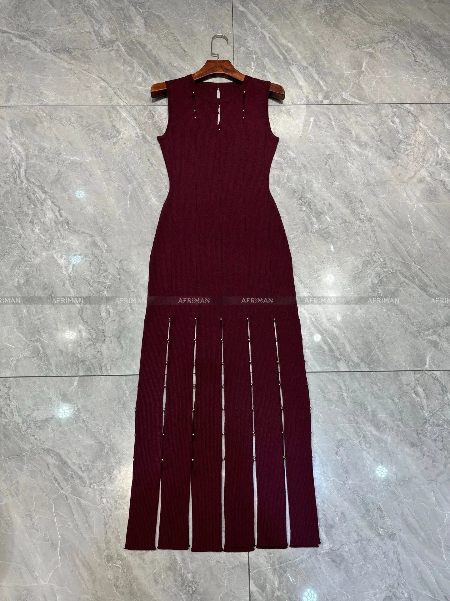 Abito da donna lungo con spacco in maglia elasticizzata scavata impreziosito da donna