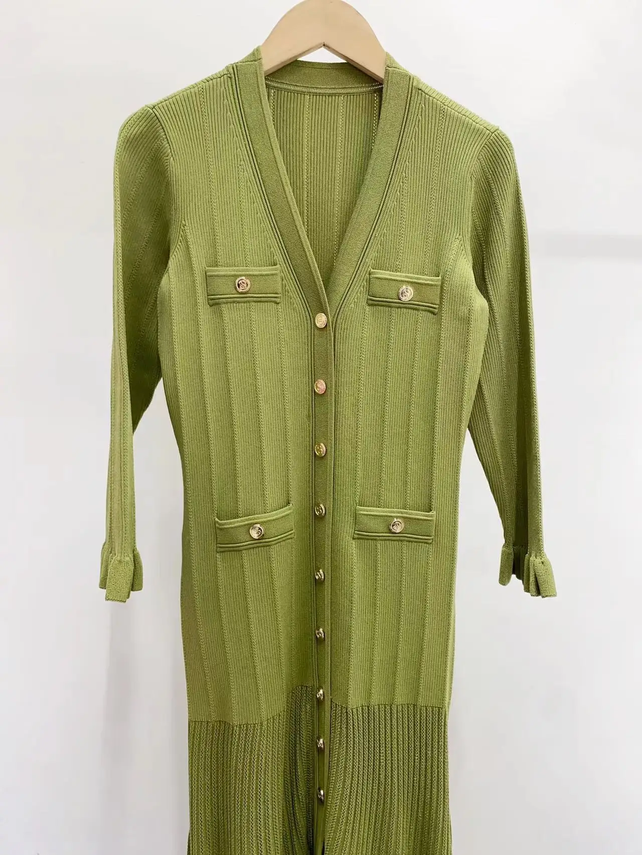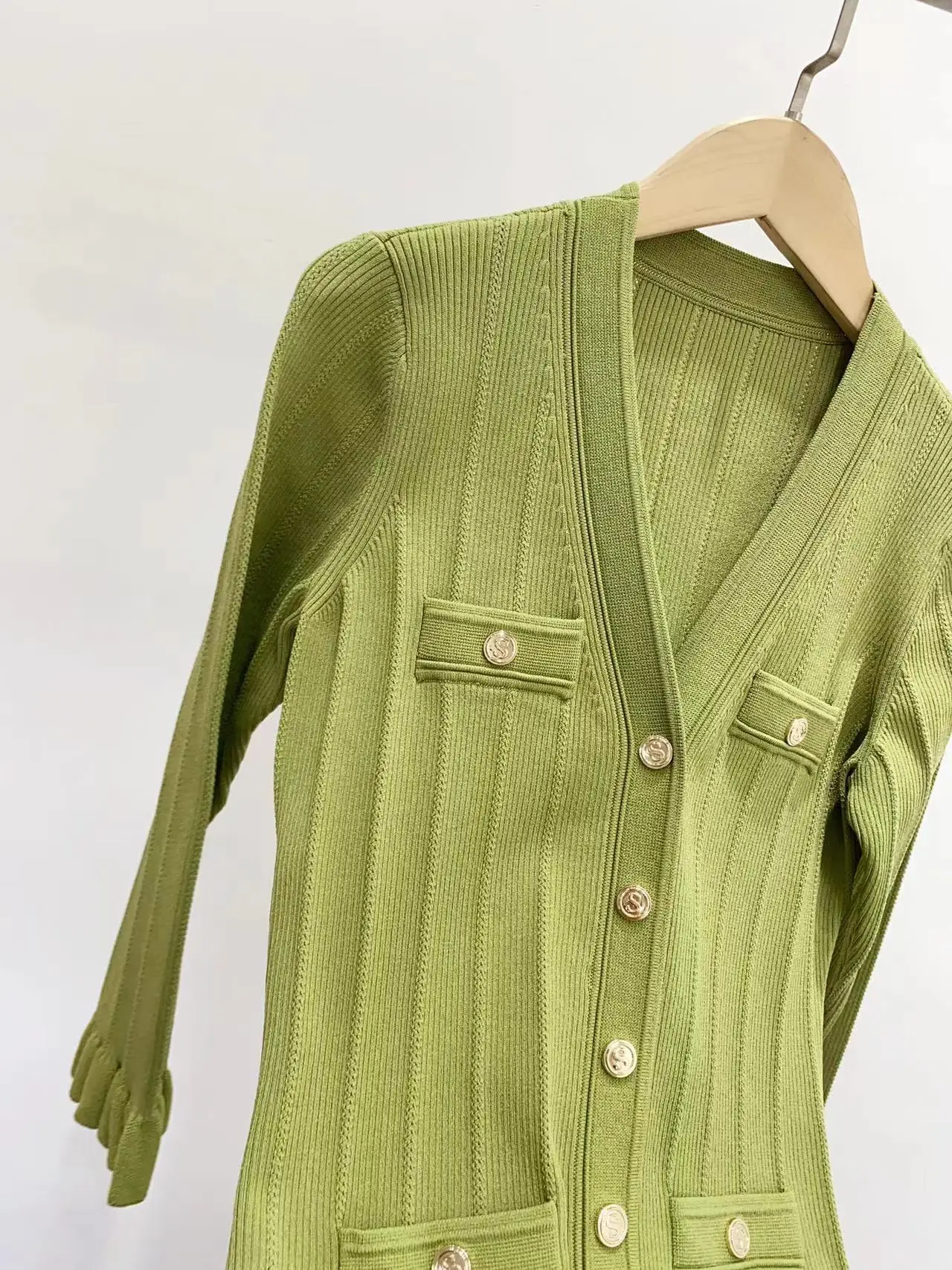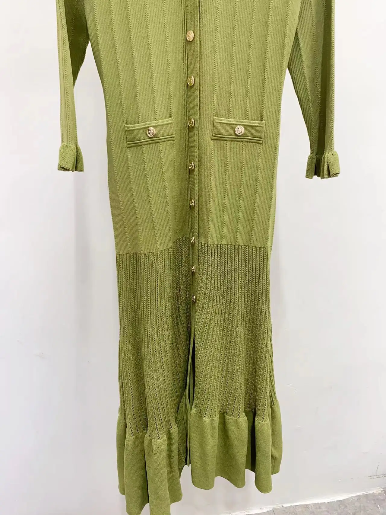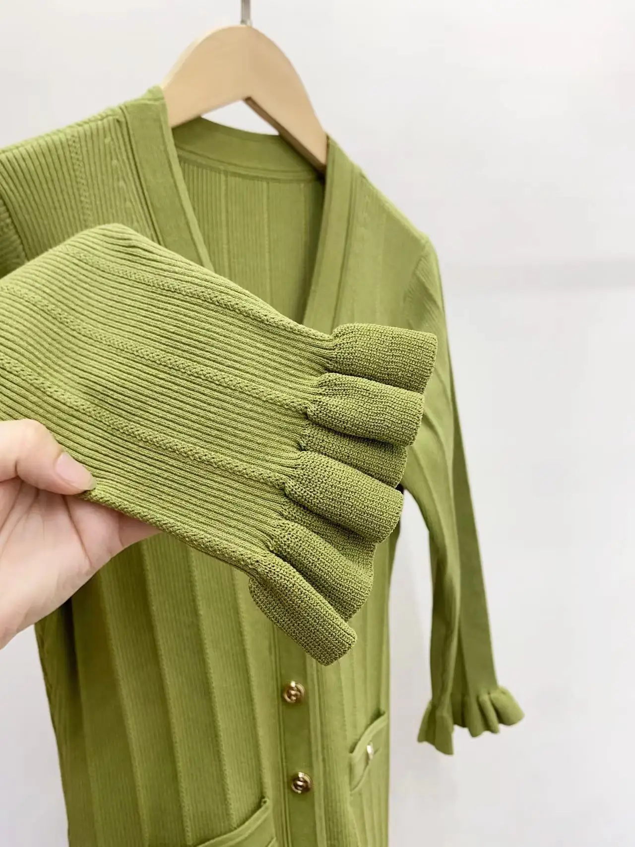 Abito da donna monopetto con volant in maglia con scollo a V manica lunga femminile elegante abito longuette all’inizio della primavera