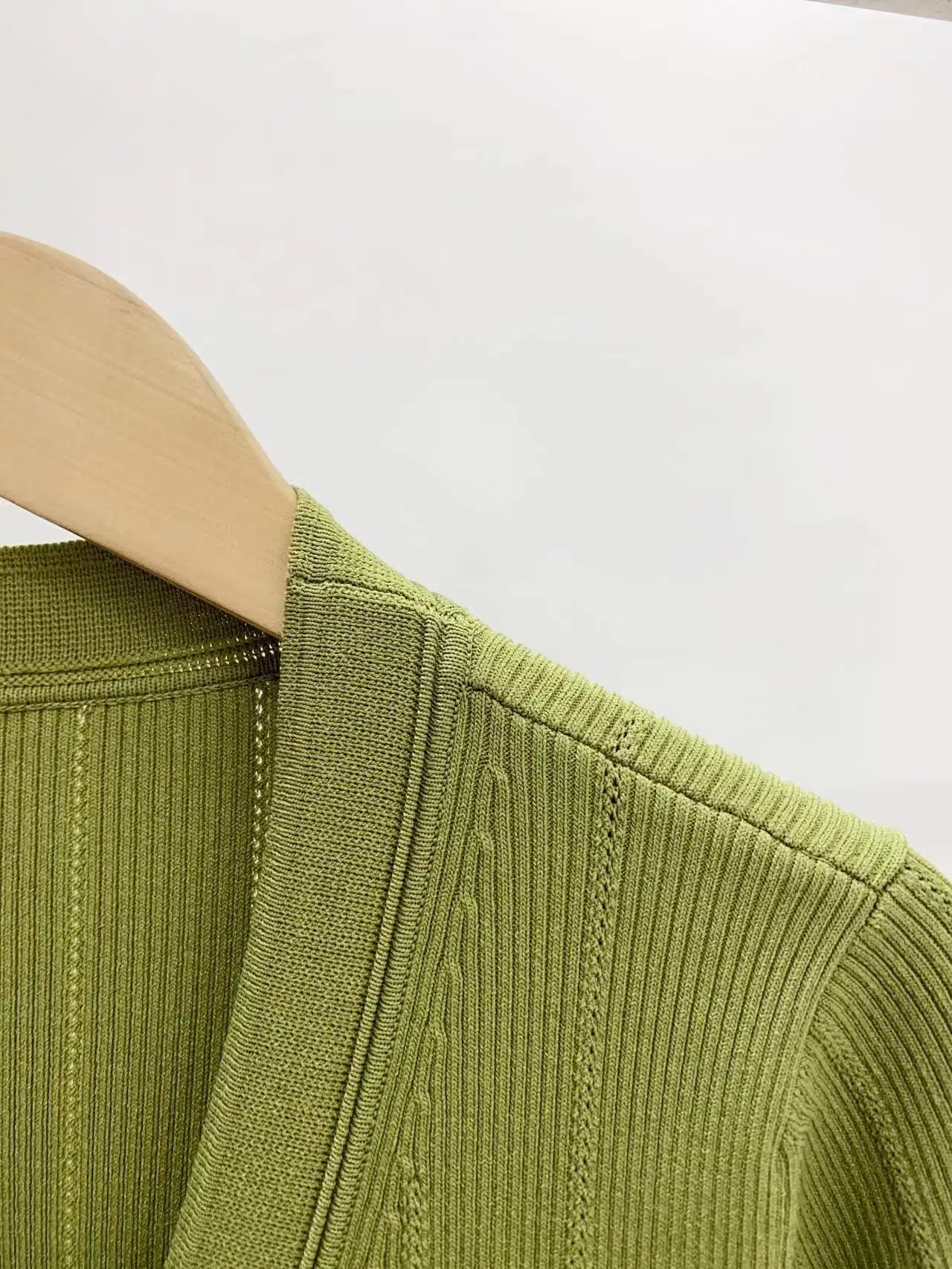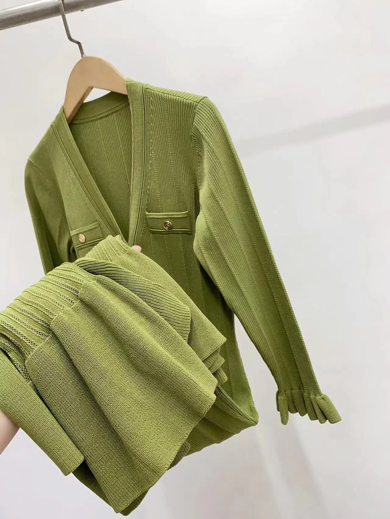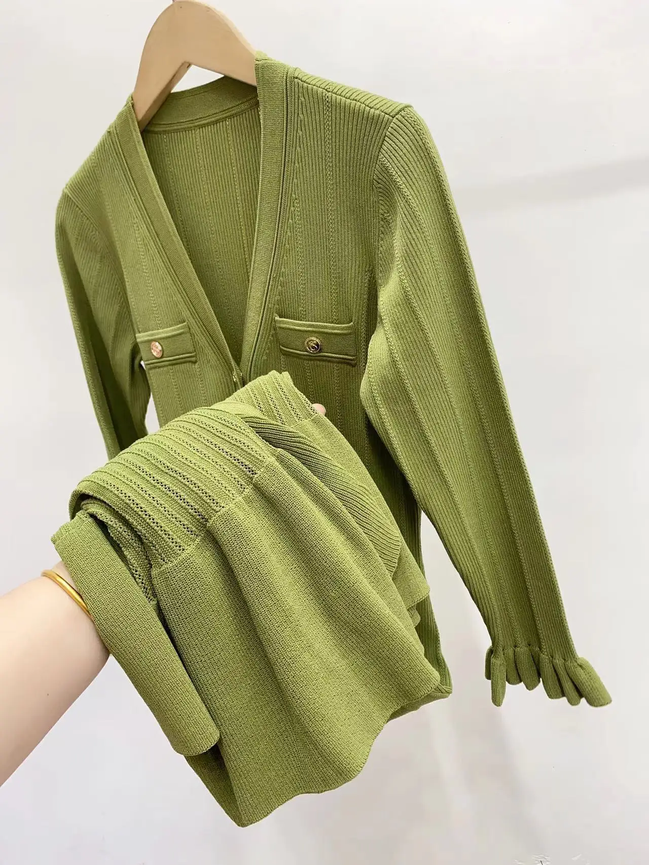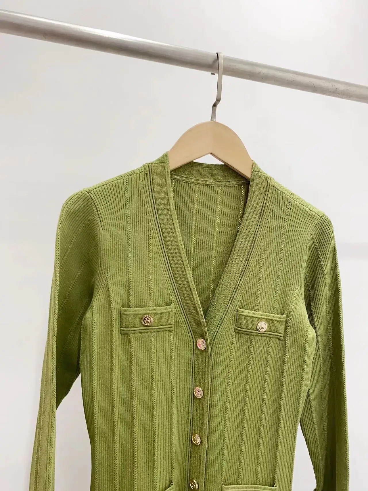 Abito da donna monopetto con volant in maglia con scollo a V manica lunga femminile elegante abito longuette all’inizio della primavera