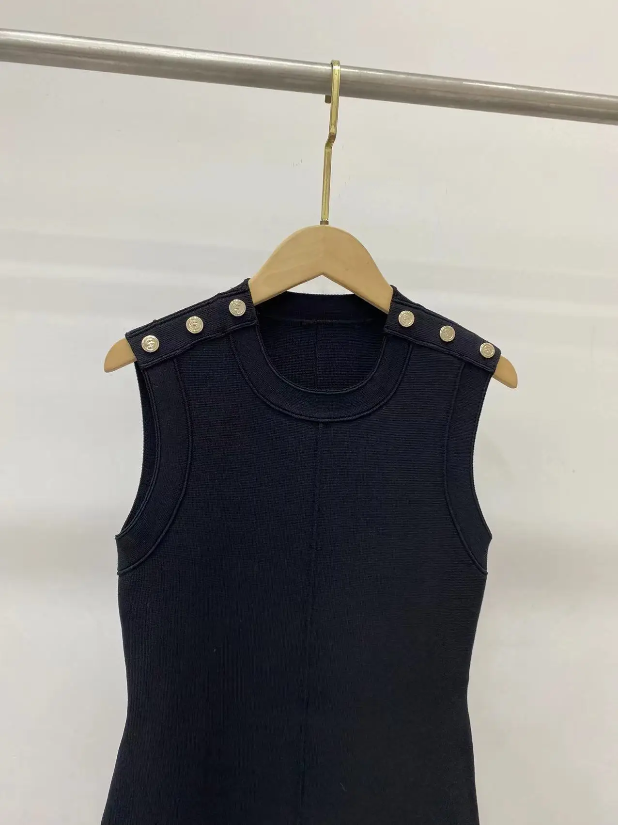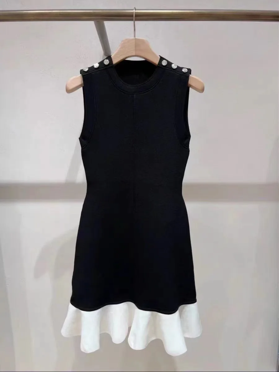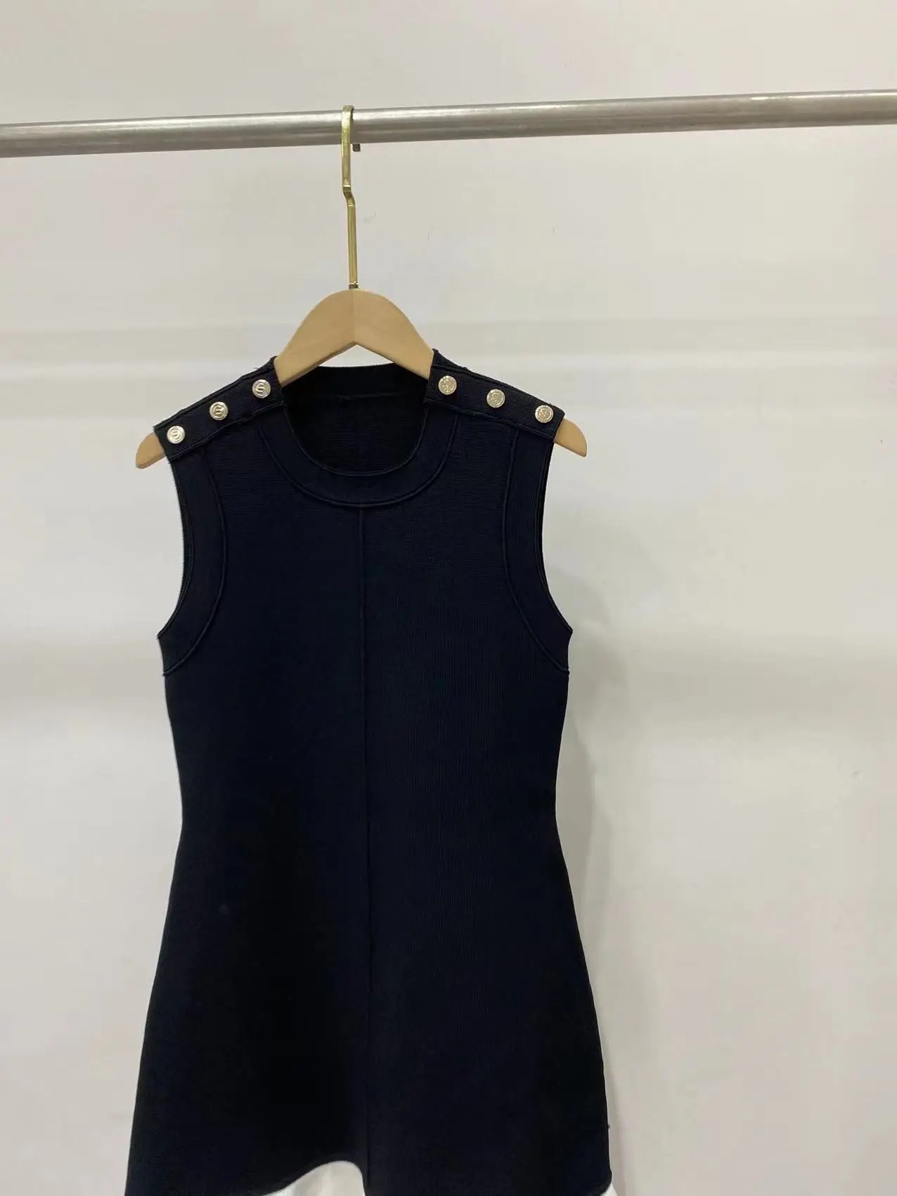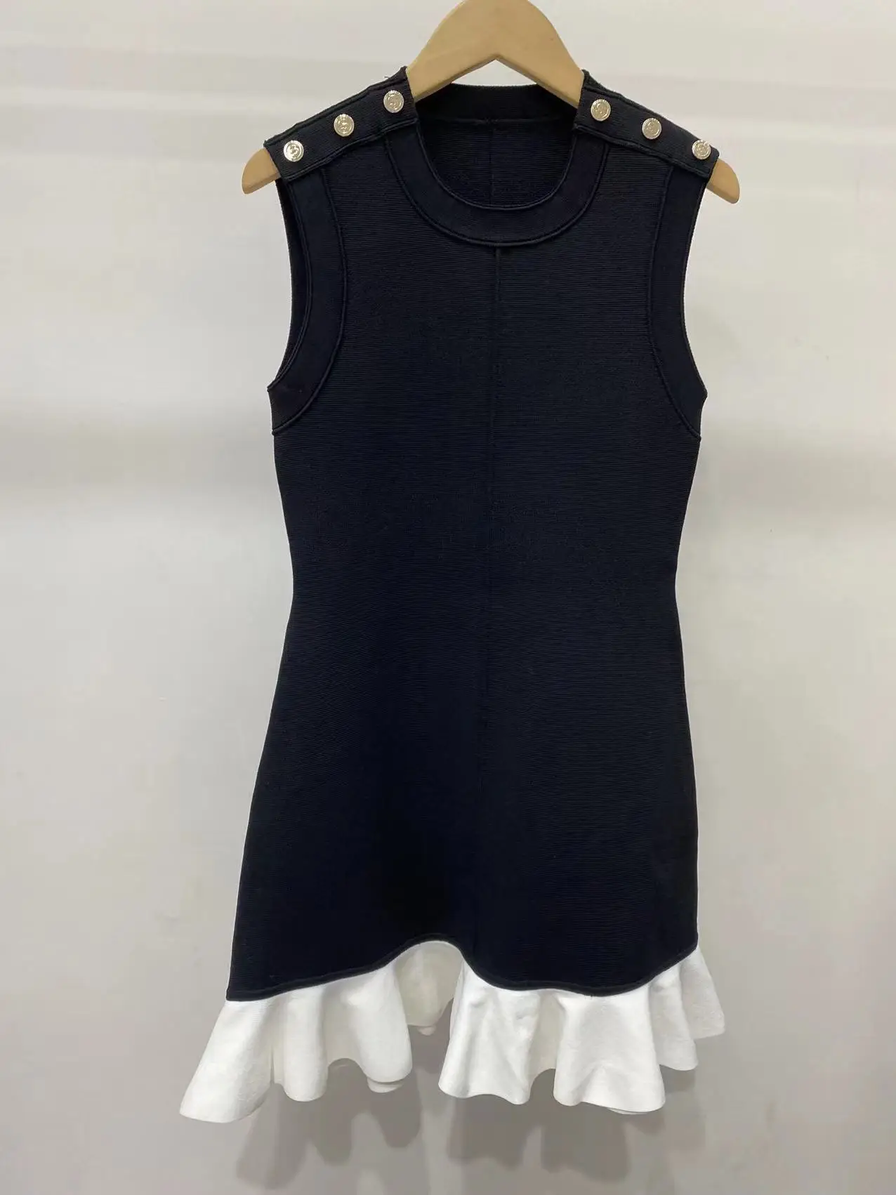 Abito da donna nero senza maniche con volant in maglia con bottoni sulle spalle, girocollo, mini abito elegante femminile primavera estate