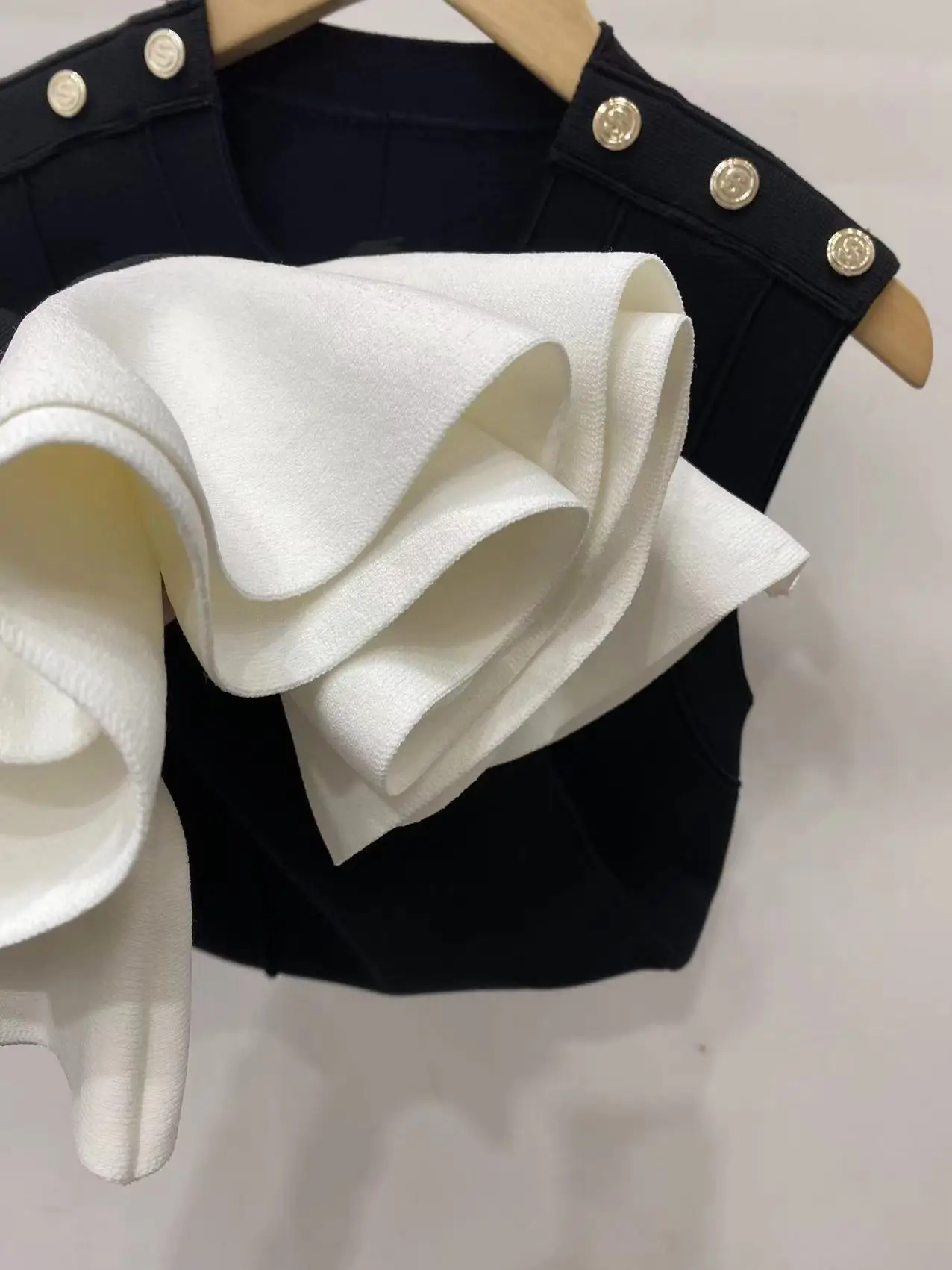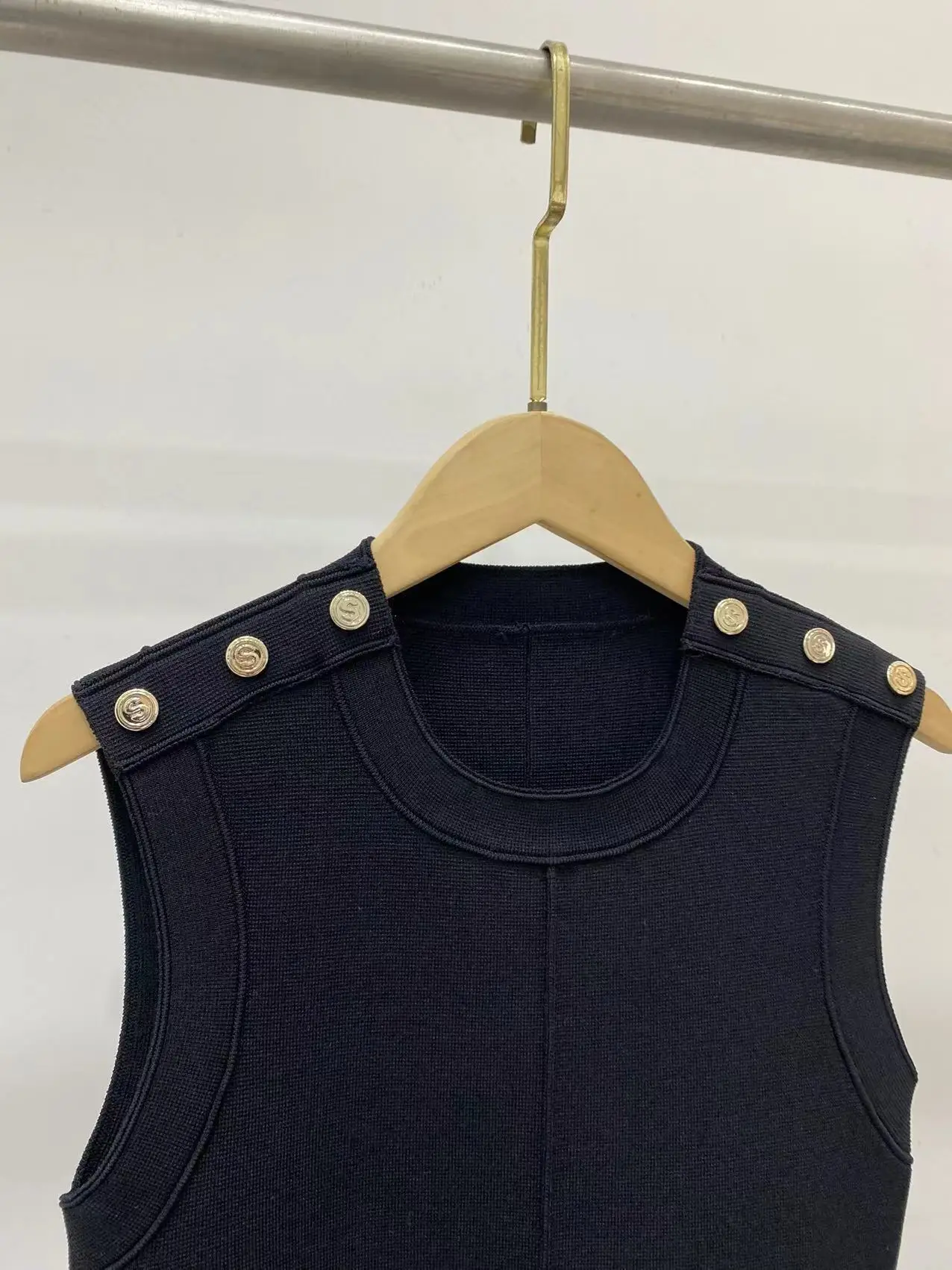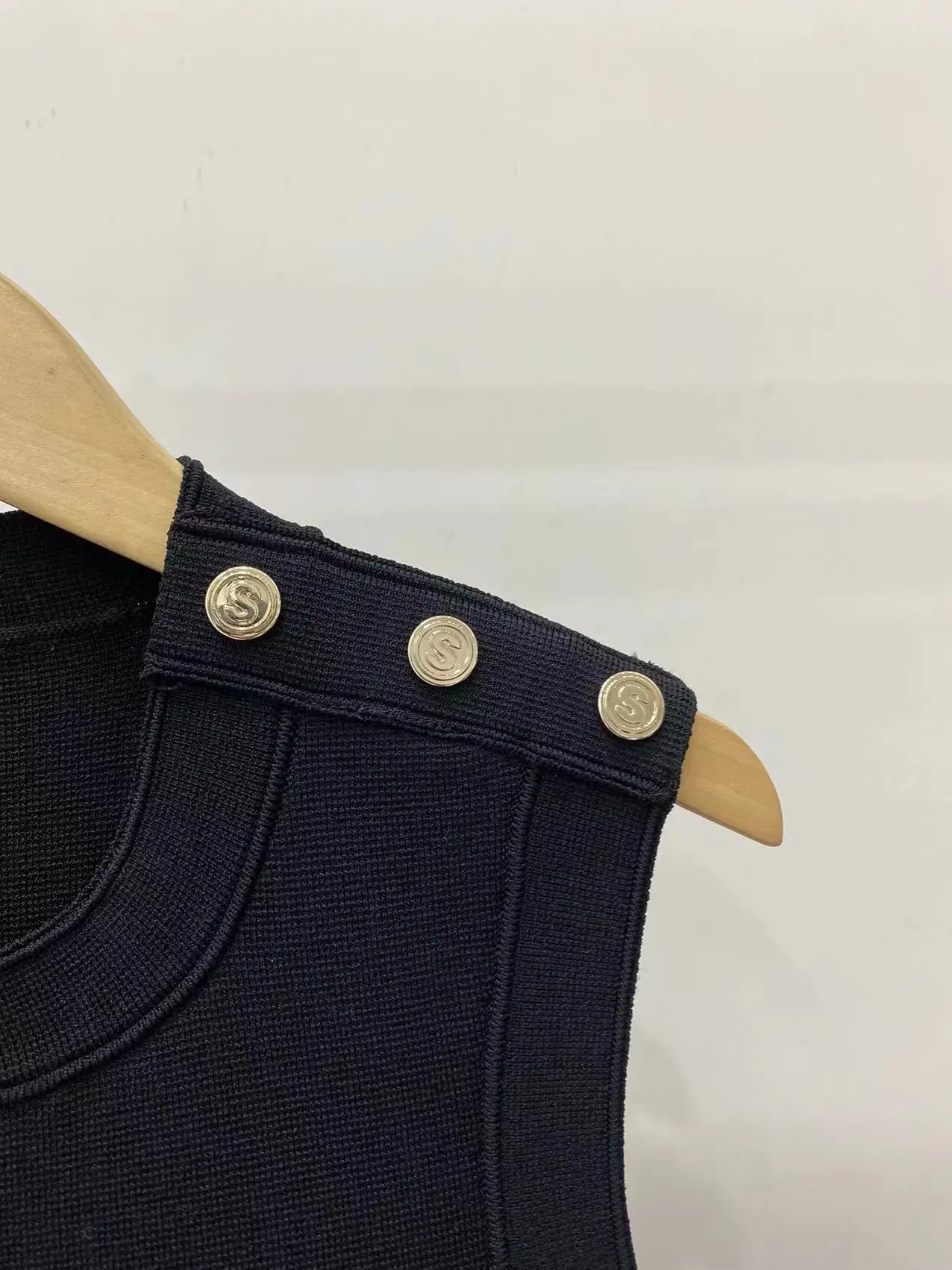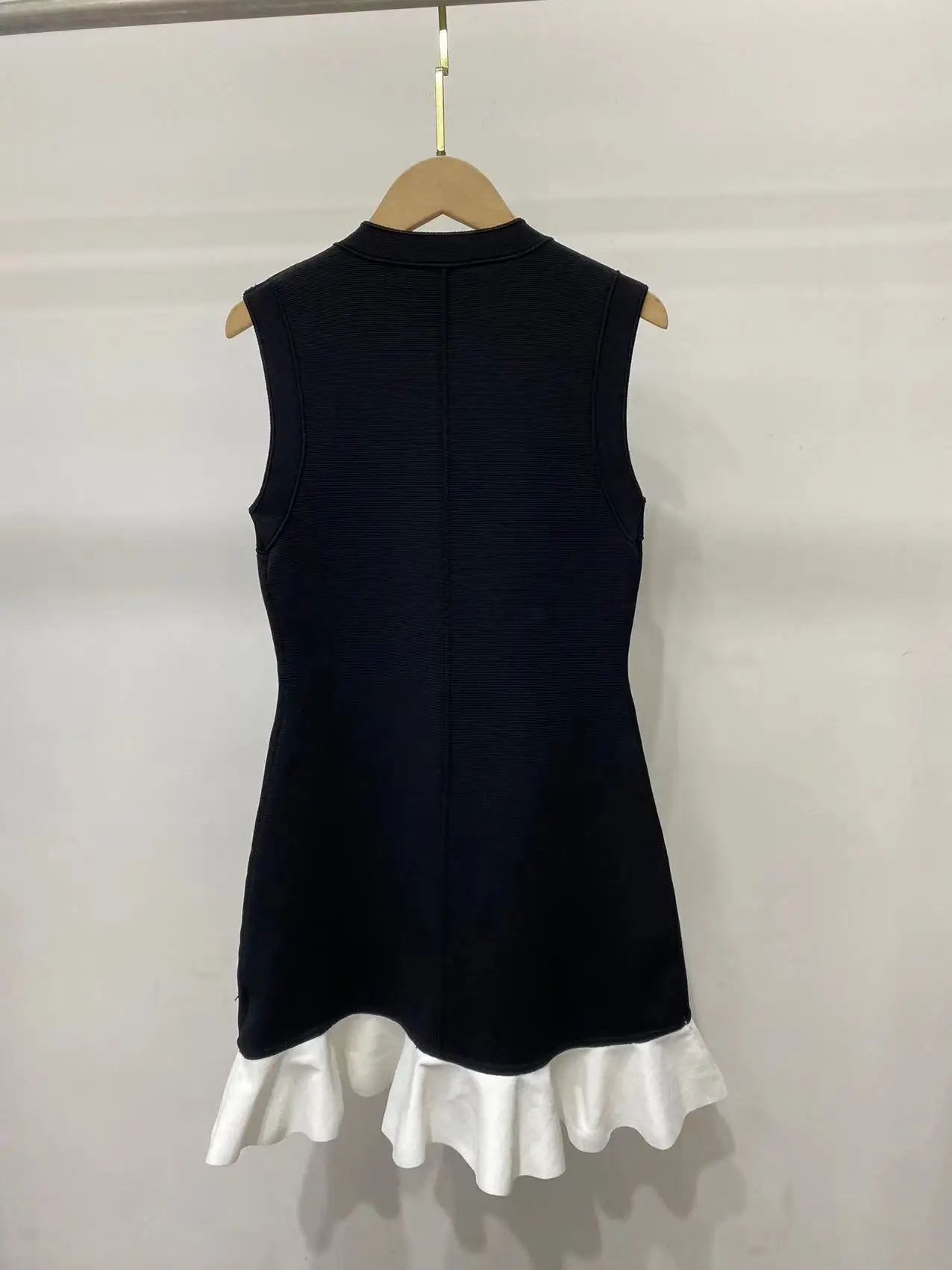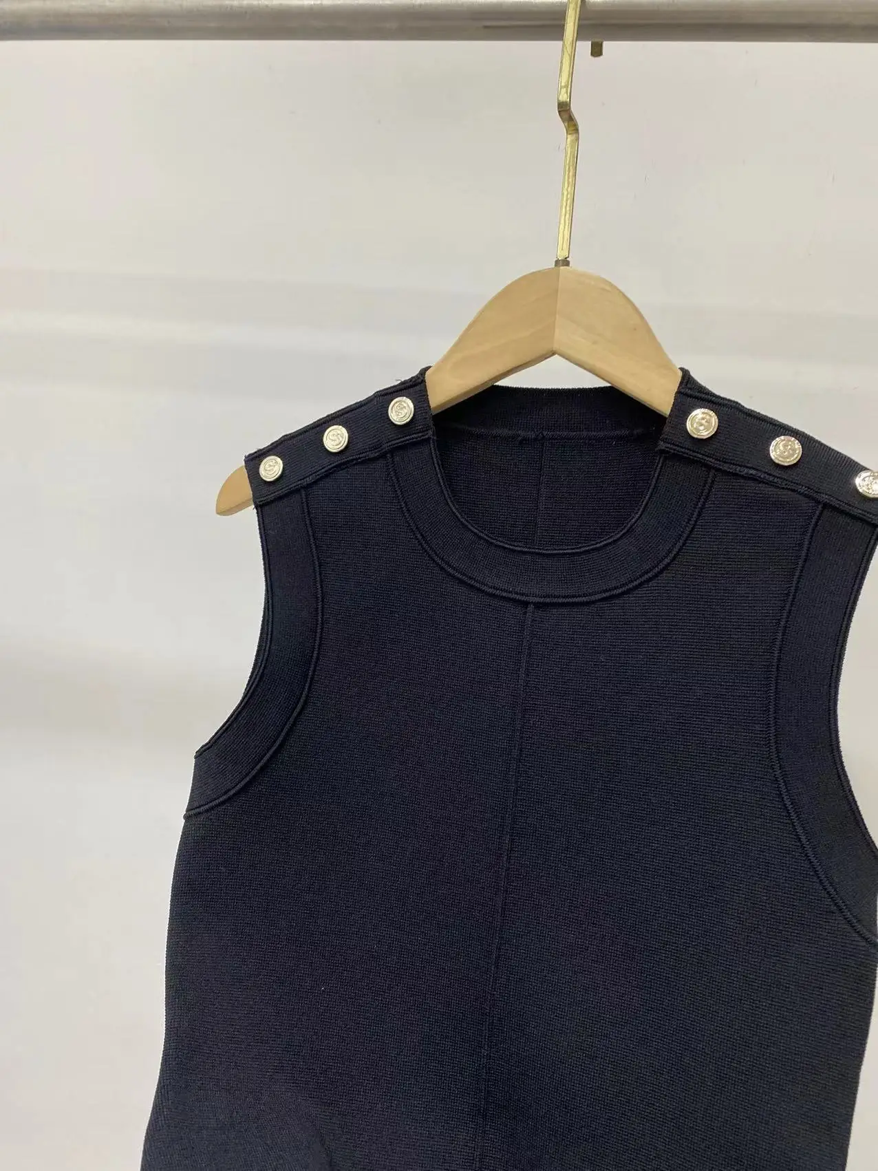 Abito da donna nero senza maniche con volant in maglia con bottoni sulle spalle, girocollo, mini abito elegante femminile primavera estate