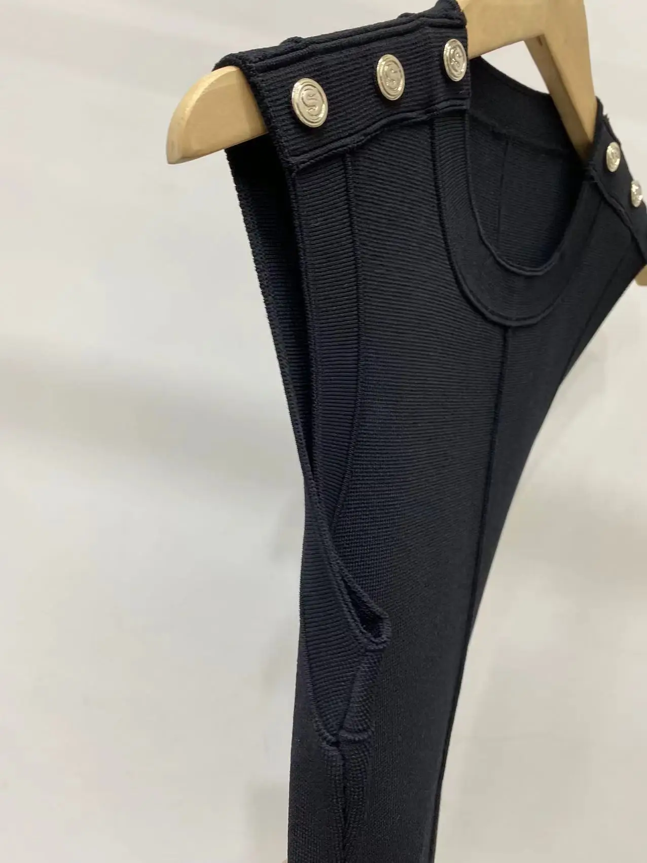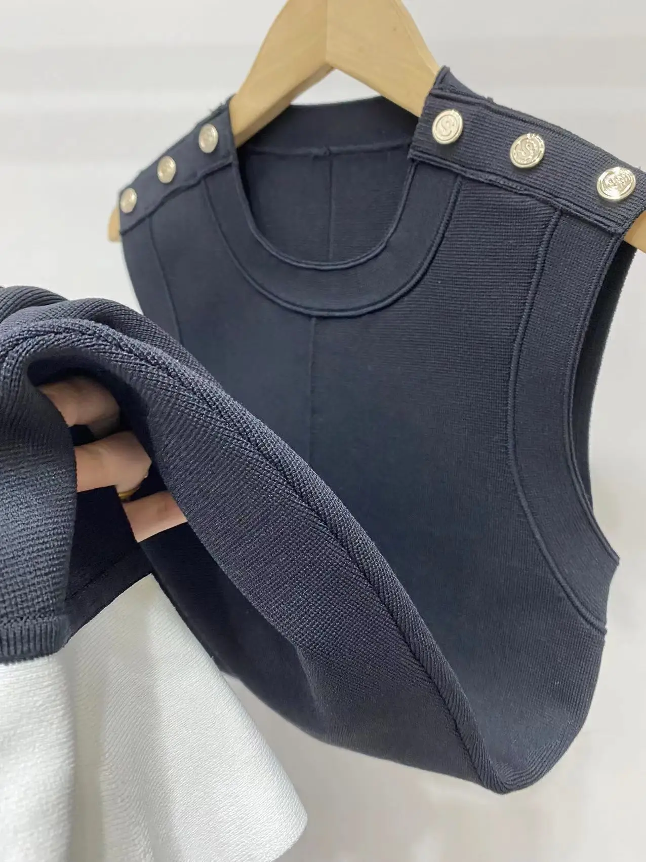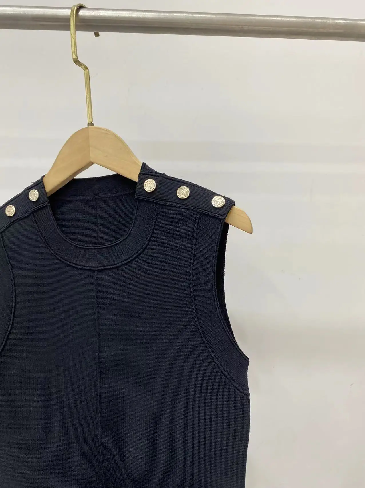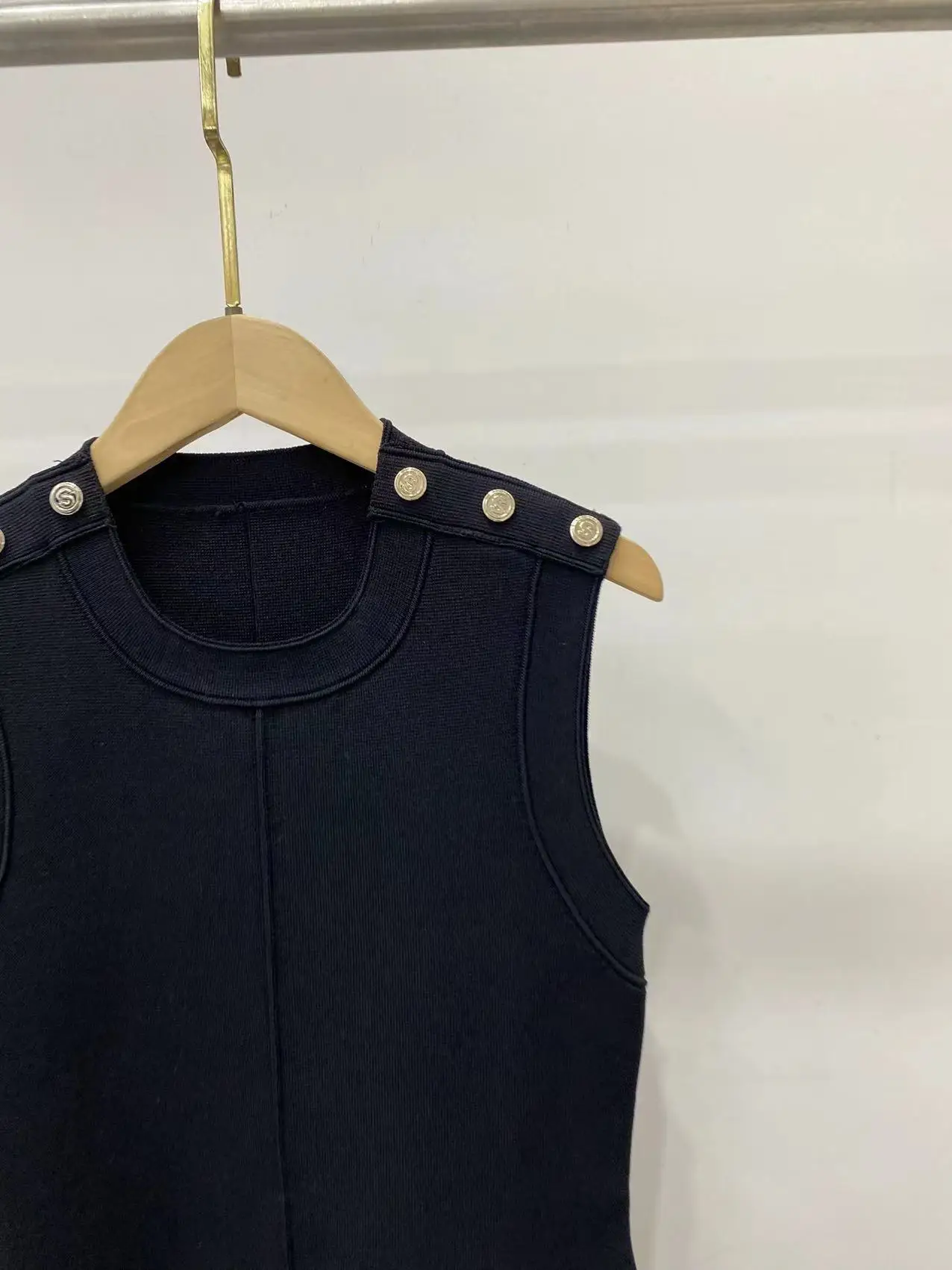 Abito da donna nero senza maniche con volant in maglia con bottoni sulle spalle, girocollo, mini abito elegante femminile primavera estate