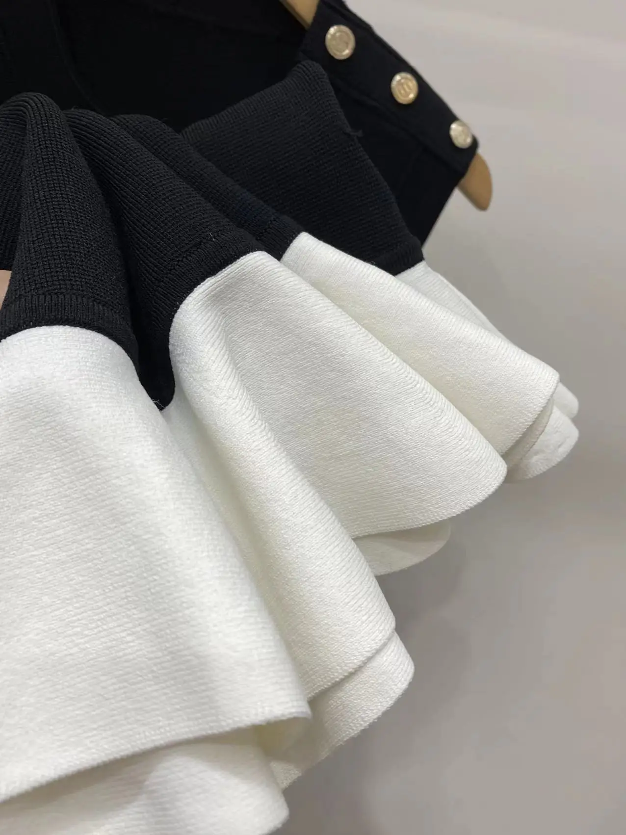 1 recensione per Abito da donna nero senza maniche con volant in maglia con bottoni sulle spalle, girocollo, mini abito elegante femminile primavera estate