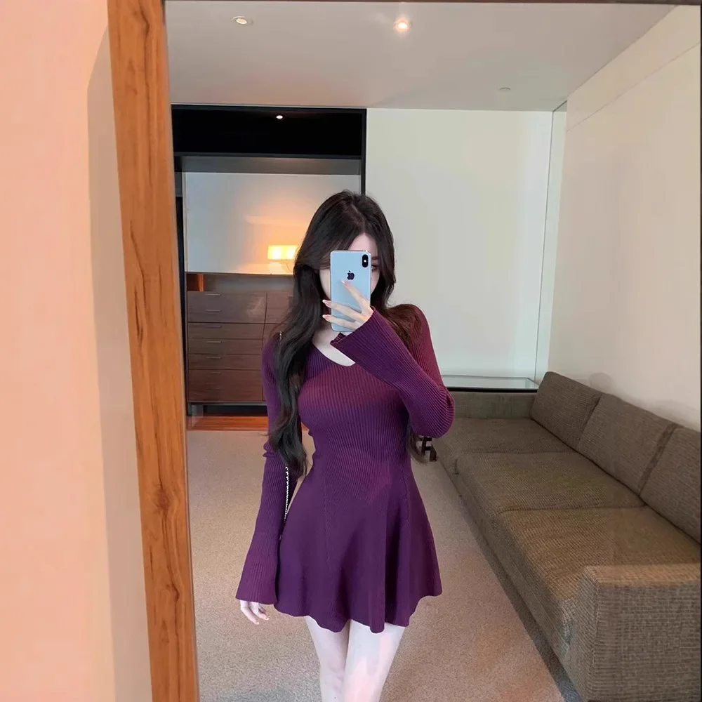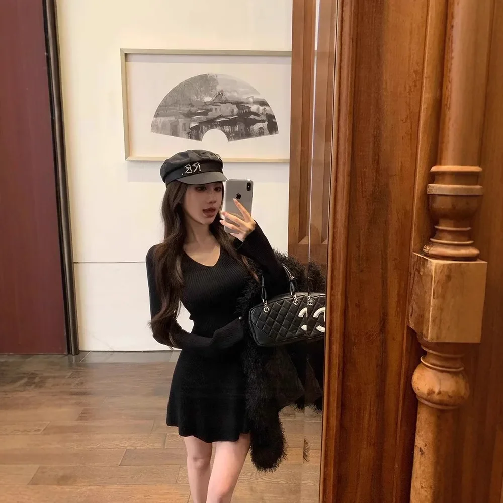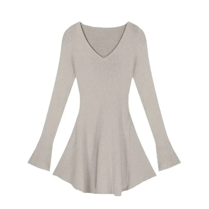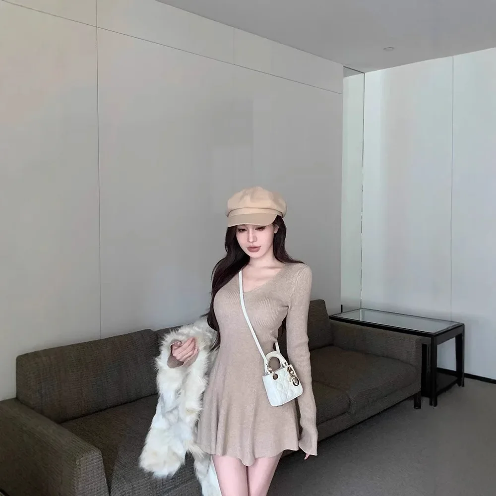 Abito lavorato a maglia a maniche lunghe con scollo a V verde oliva Gonna corta a trapezio dimagrante Donna Autunno Inverno Nuovo stile Vita impero alla moda