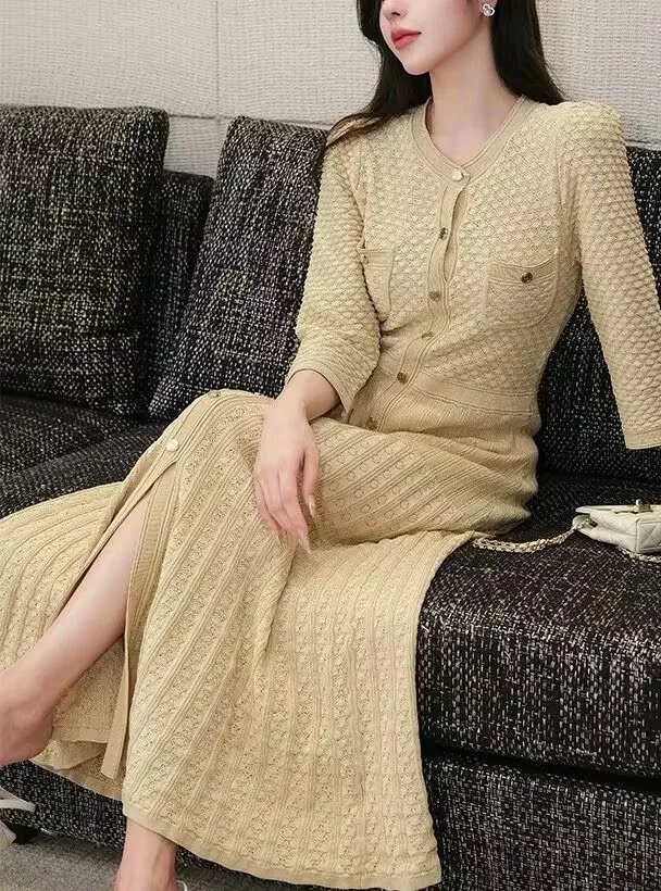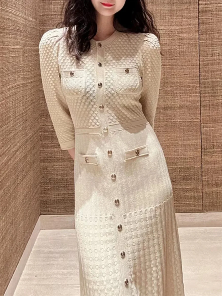 Abito lavorato a maglia scavato jacquard da donna autunnale Abito lungo alla moda e dimagrante per donna