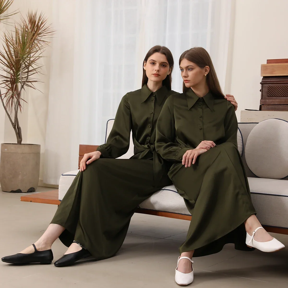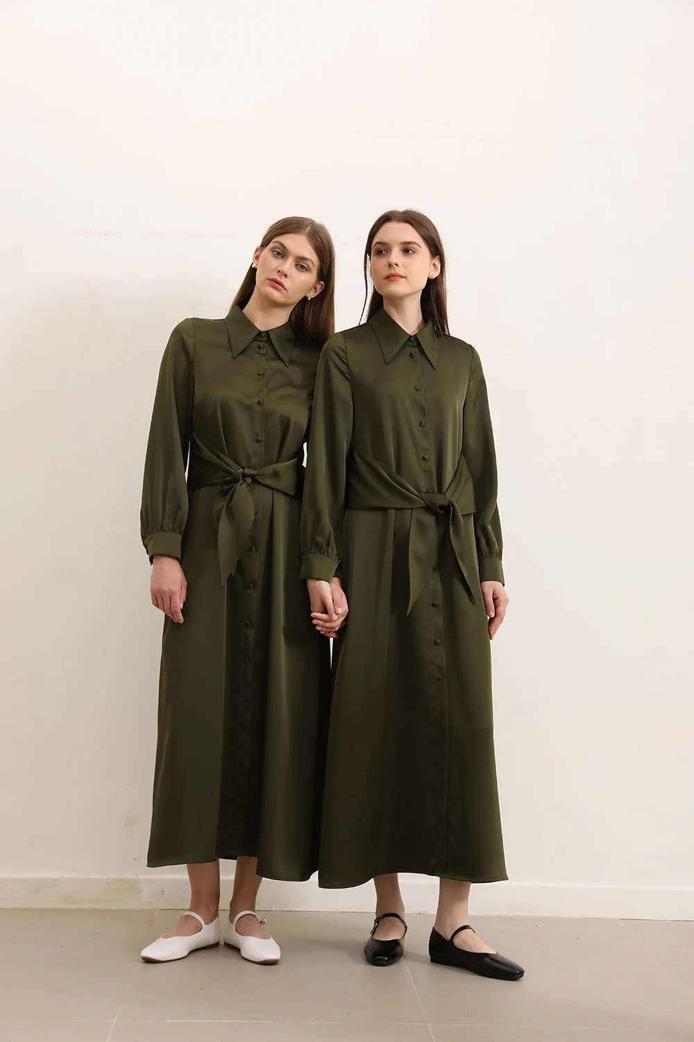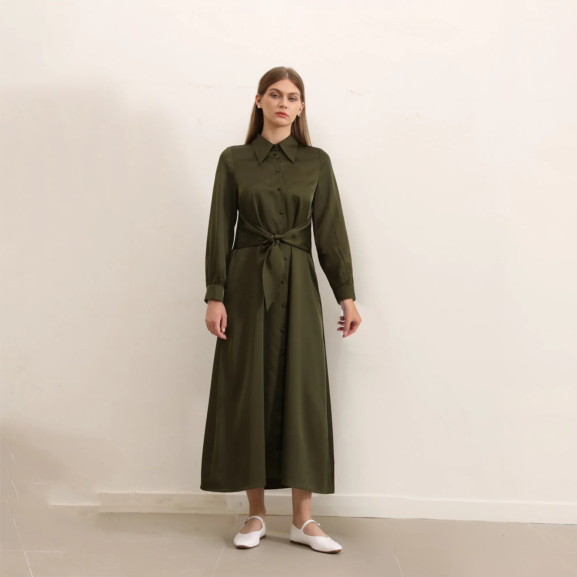 Abito lungo con colletto AP 25 AW da donna Nuovo abito in raso nero e oliva Cintura in vita Abiti eleganti