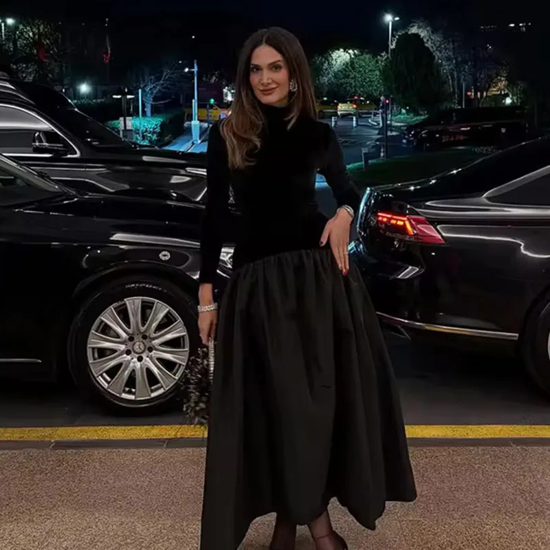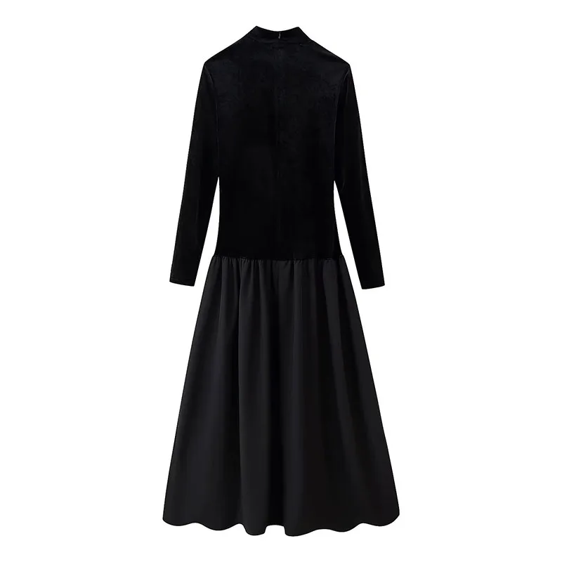 Abito lungo patchwork in velluto moda donna elegante colletto semi-alto abiti da sera per feste 2025 nuovi abiti neri a maniche lunghe