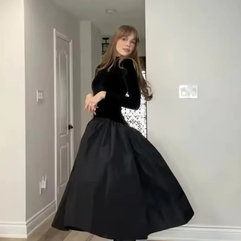 2 recensioni per Abito lungo patchwork in velluto moda donna elegante colletto semi-alto abiti da sera per feste 2025 nuovi abiti neri a maniche lunghe