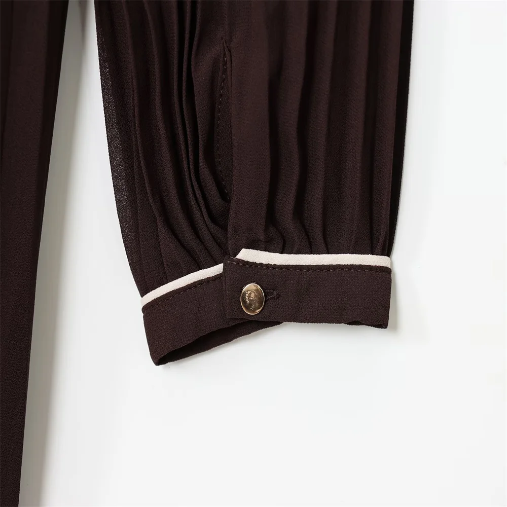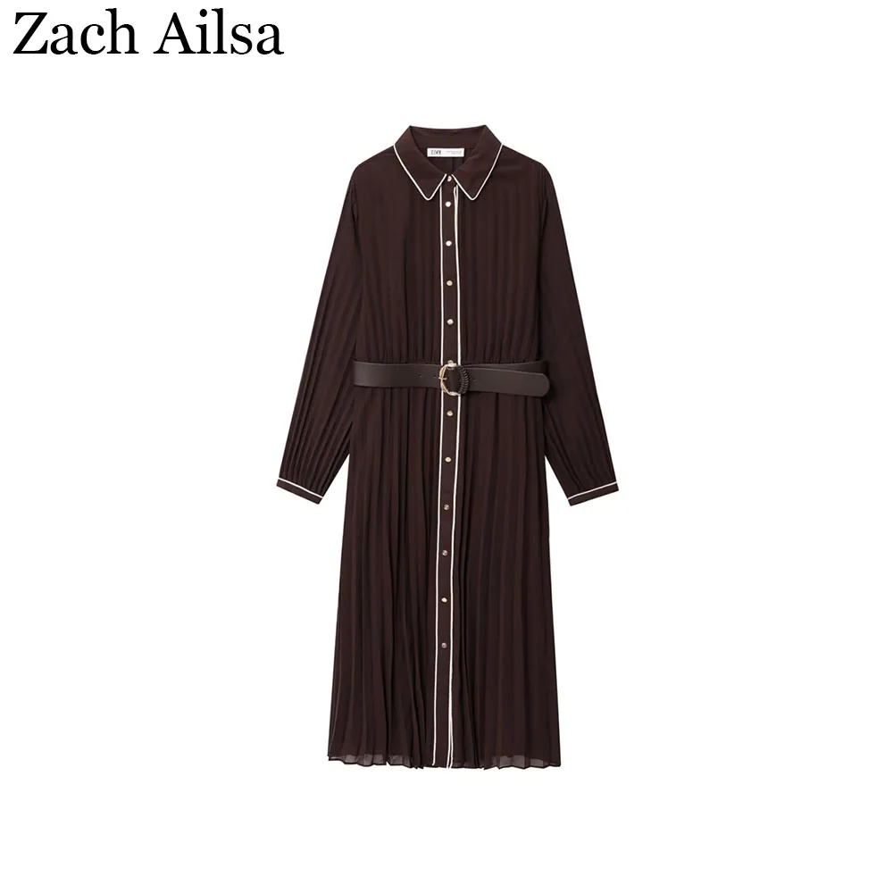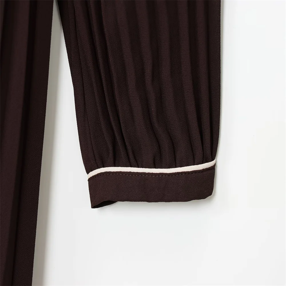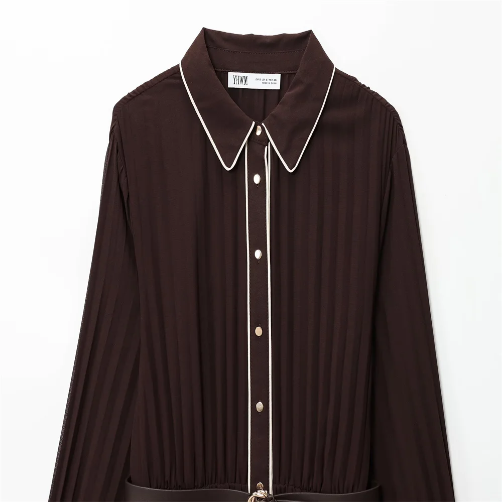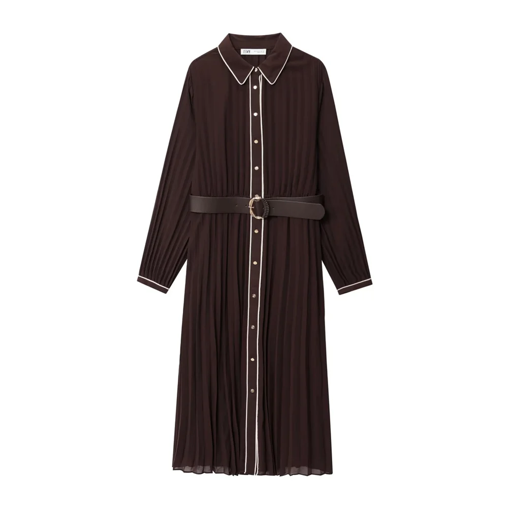 Abito MIDI plissettato patchwork con risvolto e cintura da donna nuovo autunno