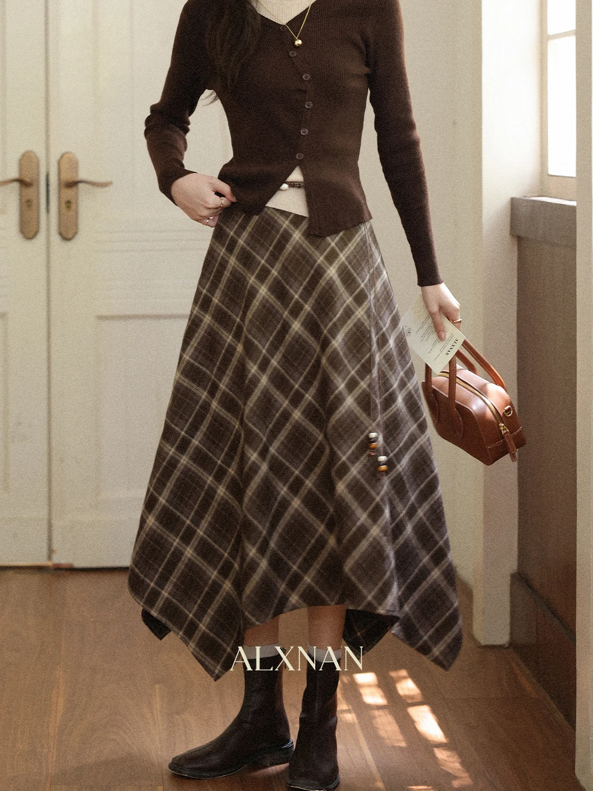 ALXNAN Gonna irregolare scozzese nera Donna Elegante lunga A-line Gonne longuette a quadretti 2025 Autunno Inverno Abbigliamento femminile L57278-1