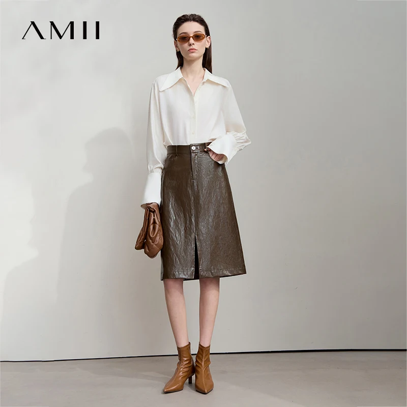AMII Minimalista PU Gonna in pelle per le donne 2025 Americano Retro Gonna al ginocchio Solid Nozioni di base Abbigliamento donna d’affari 12553014