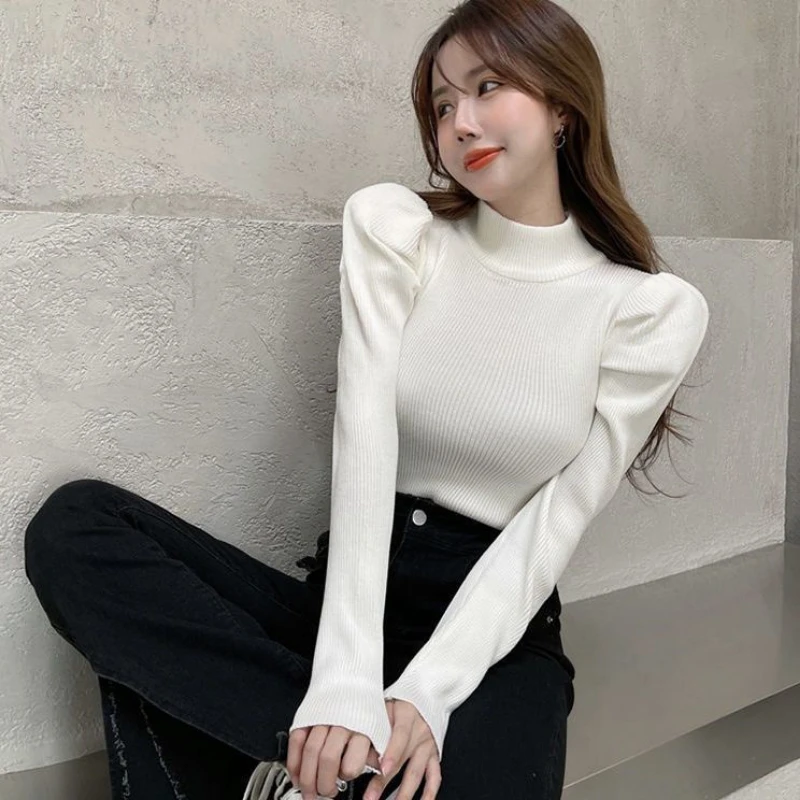 Autunno Inverno Maniche a palloncino Tinta unita Abbigliamento donna Camicia che tocca il fondo Collo semi alto Nuovo stile Elegante Slim Fit Y2K Maglioni