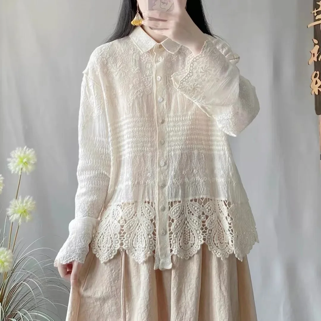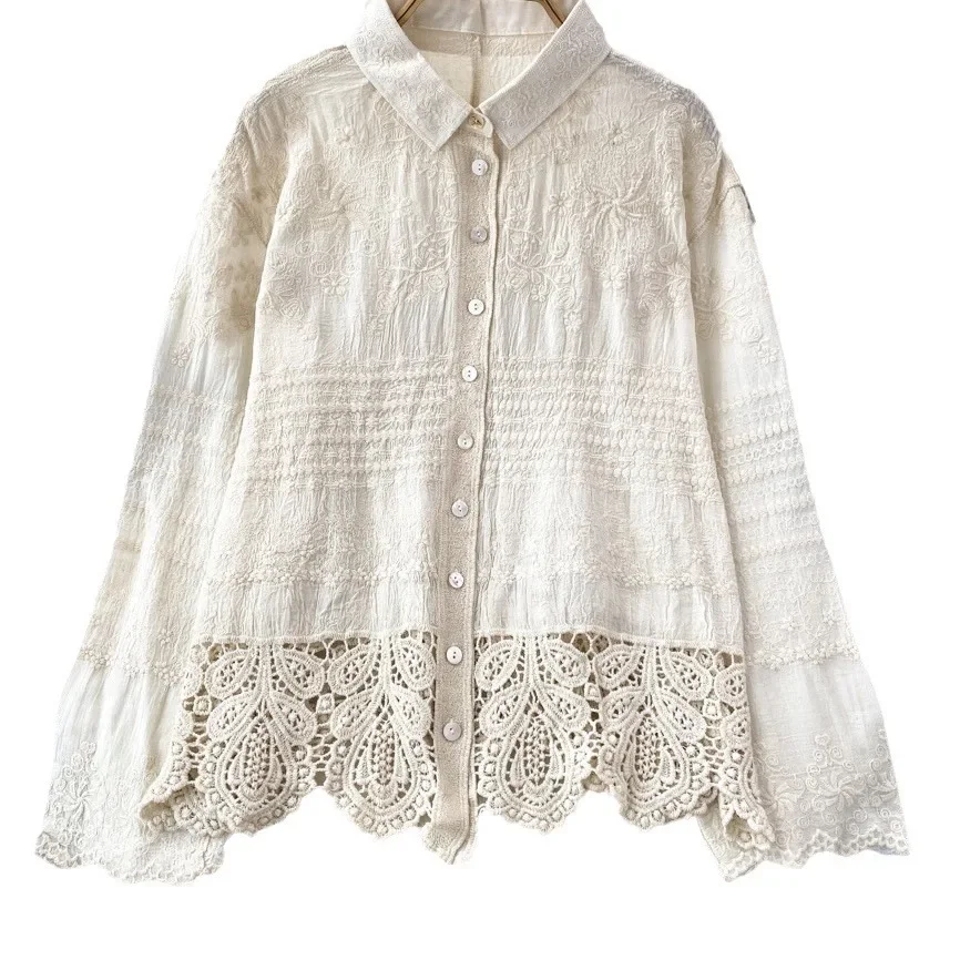 Recensisci per primo “Camicia elegante patchwork in pizzo ricamato in cotone con colletto ampio a maniche lunghe e bottone singolo per donna Moda primavera autunno”