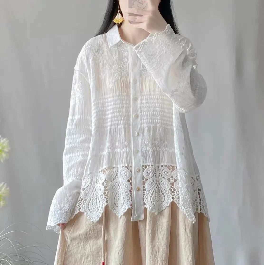 Camicia elegante patchwork in pizzo ricamato in cotone con colletto ampio a maniche lunghe e bottone singolo per donna Moda primavera autunno
