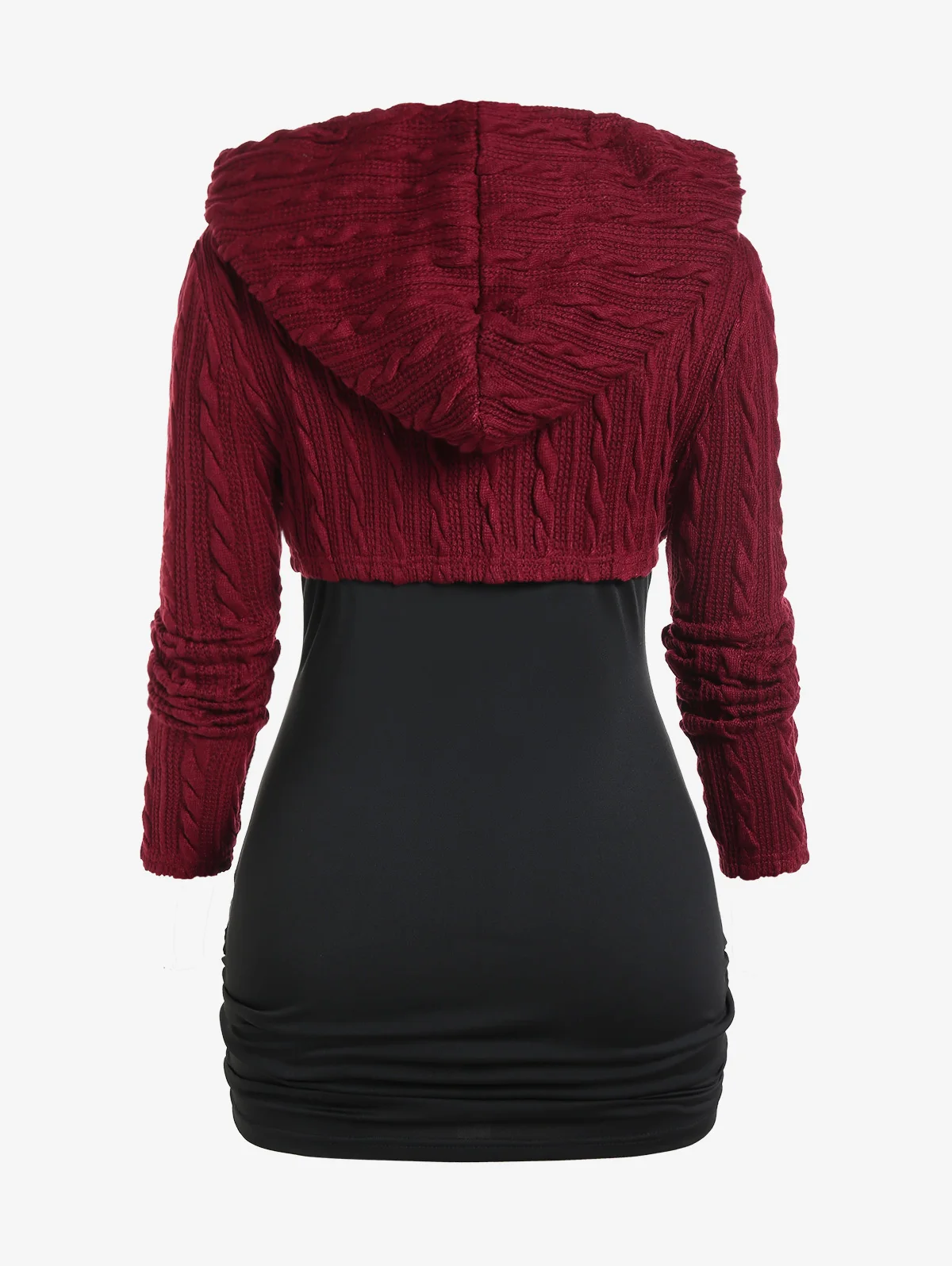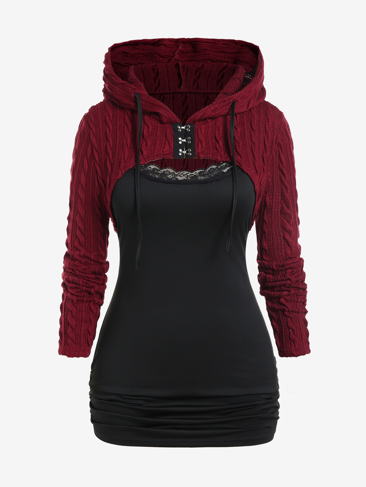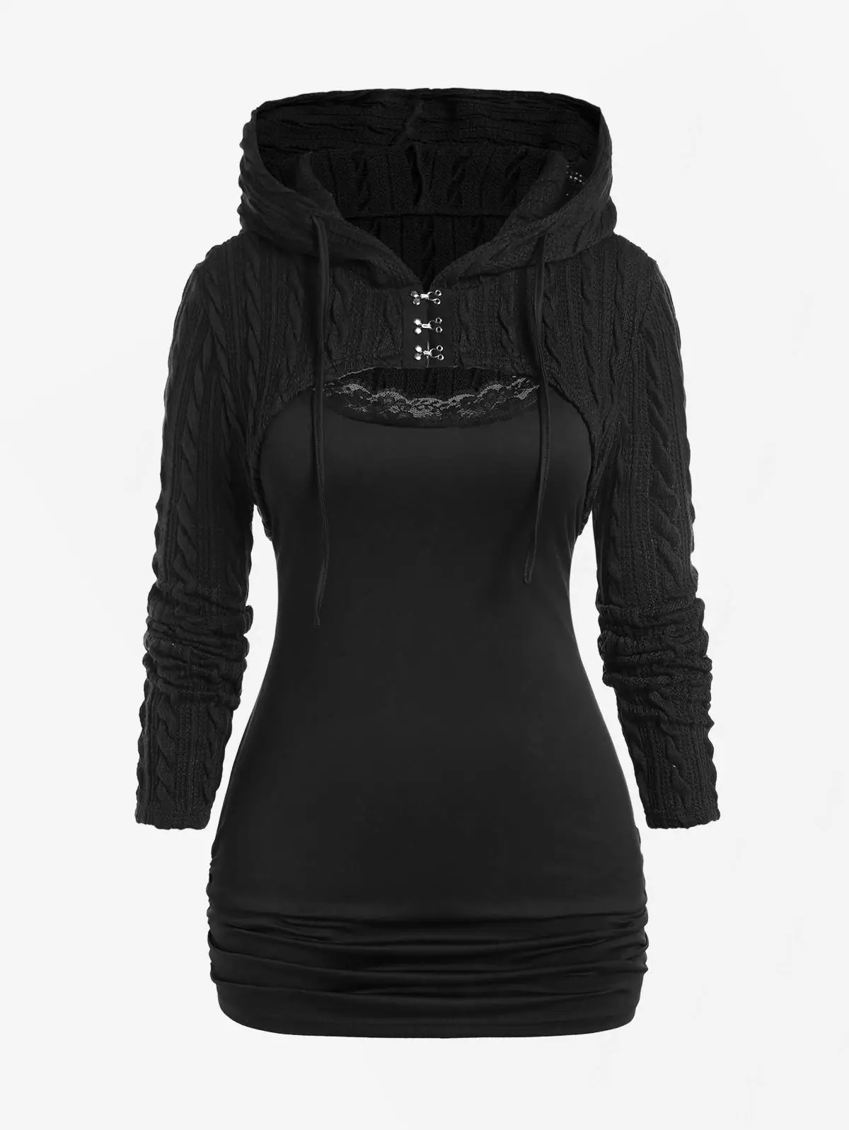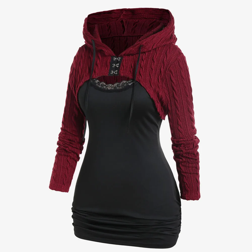 Canotta arricciata con rifiniture in pizzo da donna ROSEGAL e Top in maglia con cappuccio, taglie forti autunno, inverno Streetwear 2 pezzi camicette