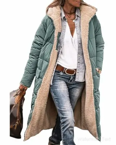 3 recensioni per Cappotti invernali caldi da donna 2024 Piumini lunghi con cappuccio reversibili in pile Sherpa Capispalla 142857