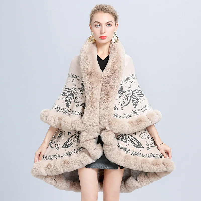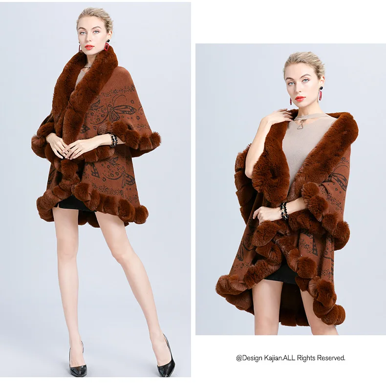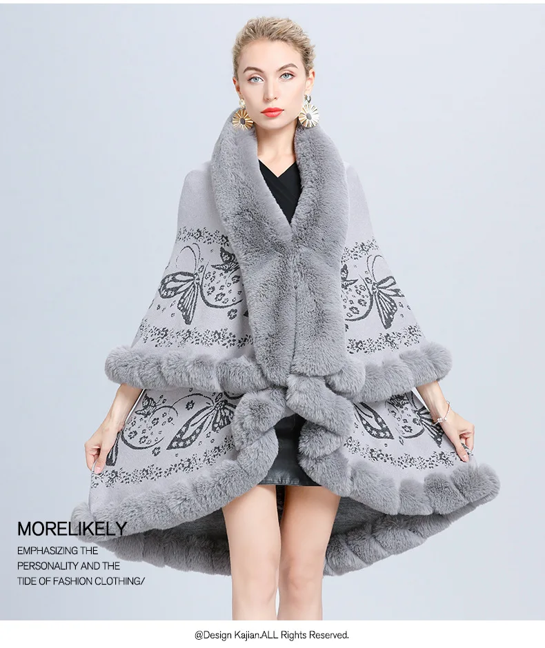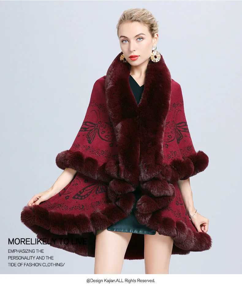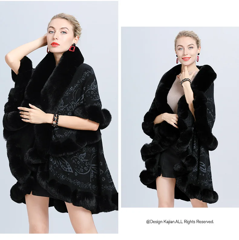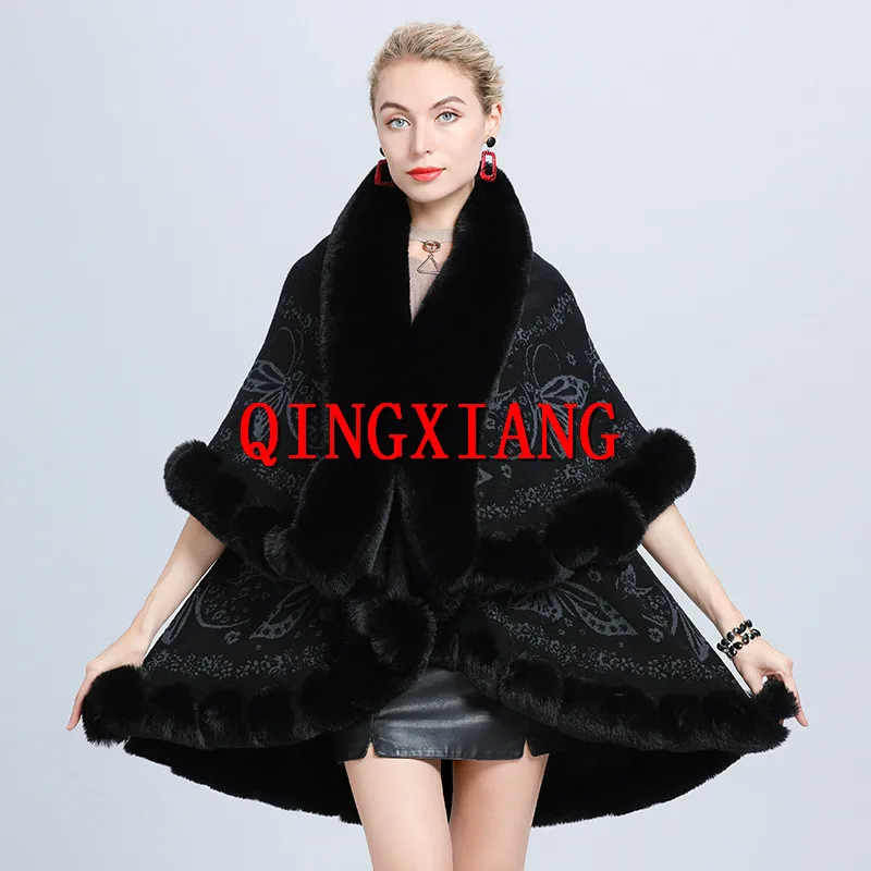 Cardigan invernale in pelliccia di volpe sintetica Poncho caldo Mantello allentato Scialle lavorato a maglia Cappotto oversize da donna Mantello spesso in tessuto jacquard a due strati