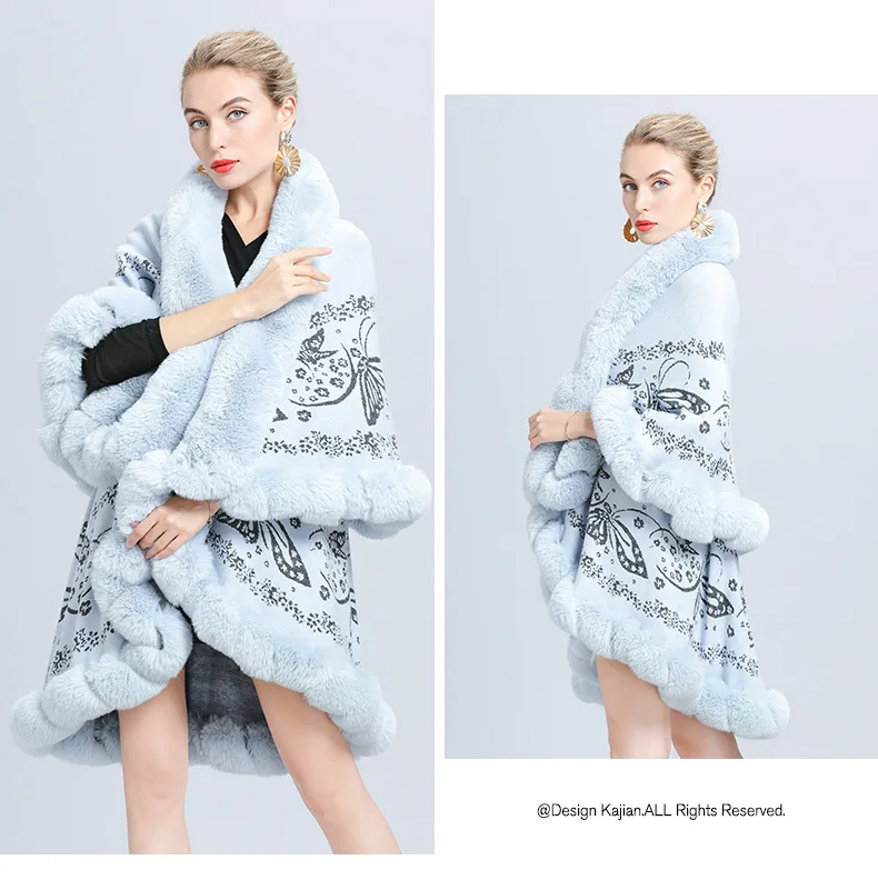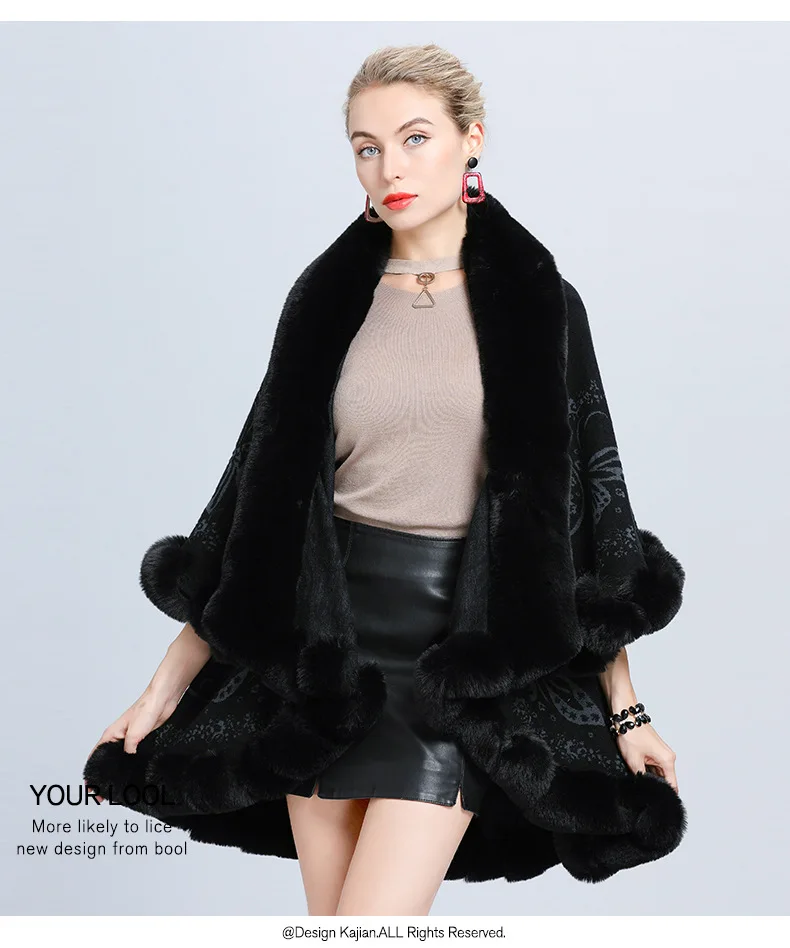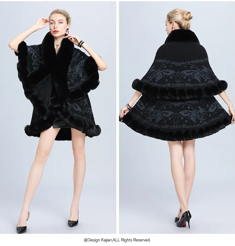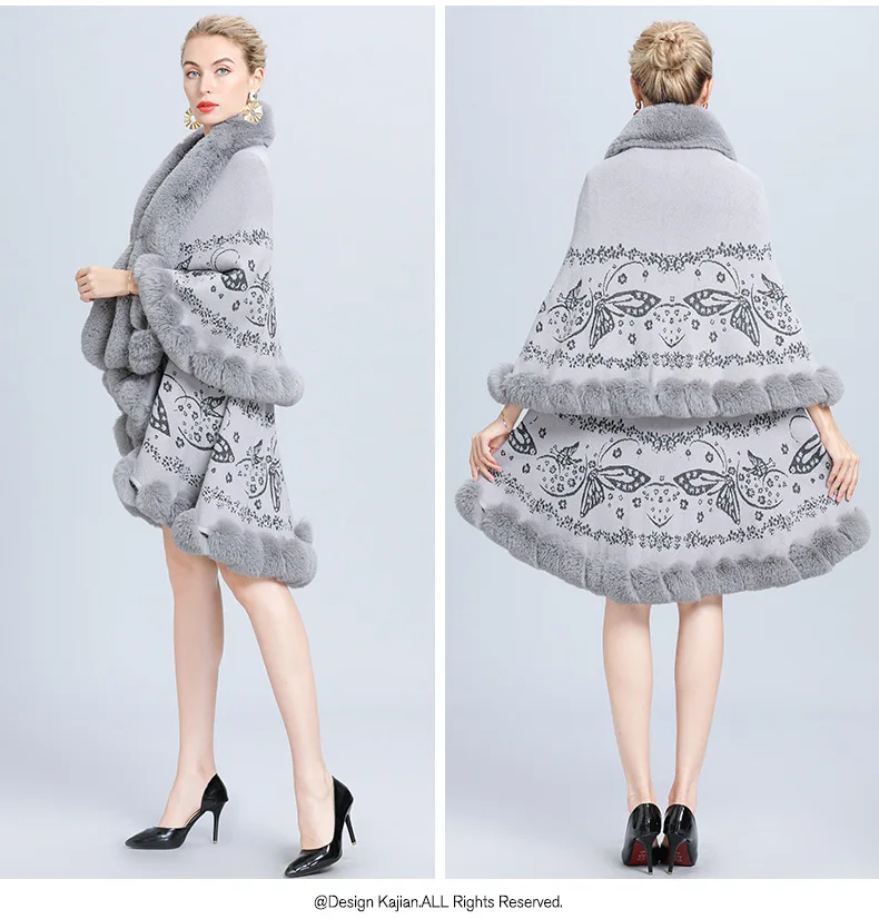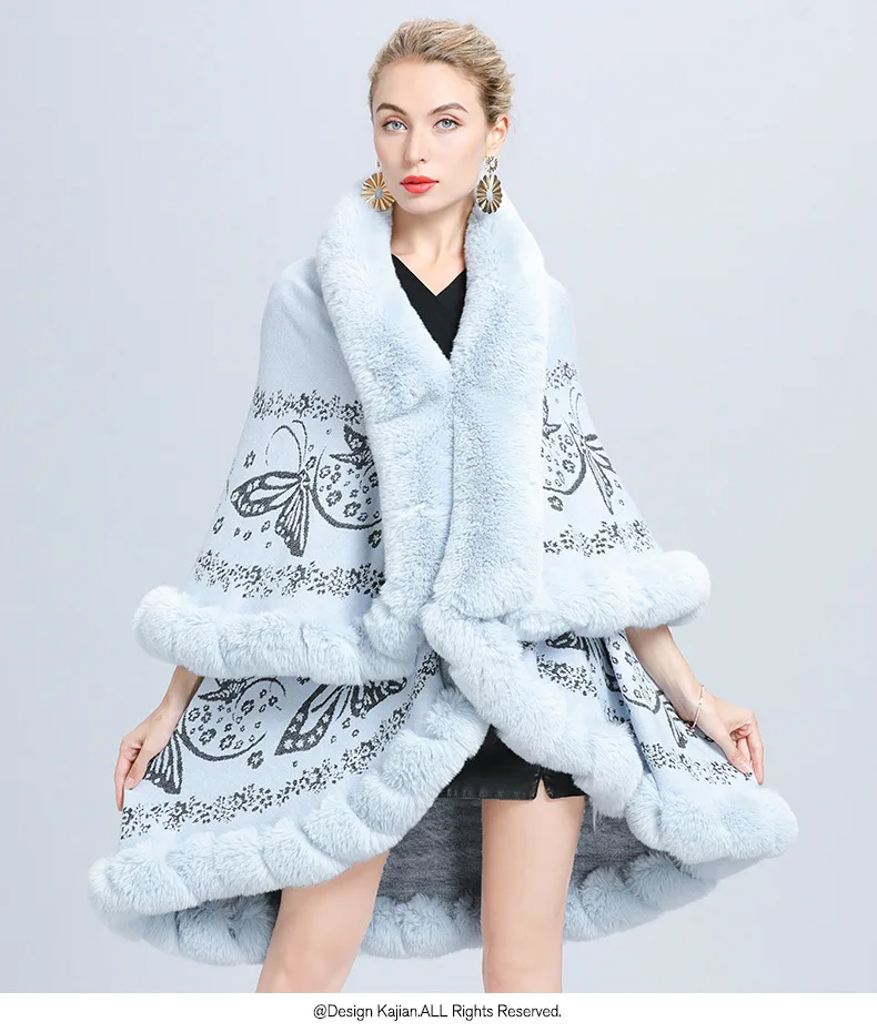 Cardigan invernale in pelliccia di volpe sintetica Poncho caldo Mantello allentato Scialle lavorato a maglia Cappotto oversize da donna Mantello spesso in tessuto jacquard a due strati