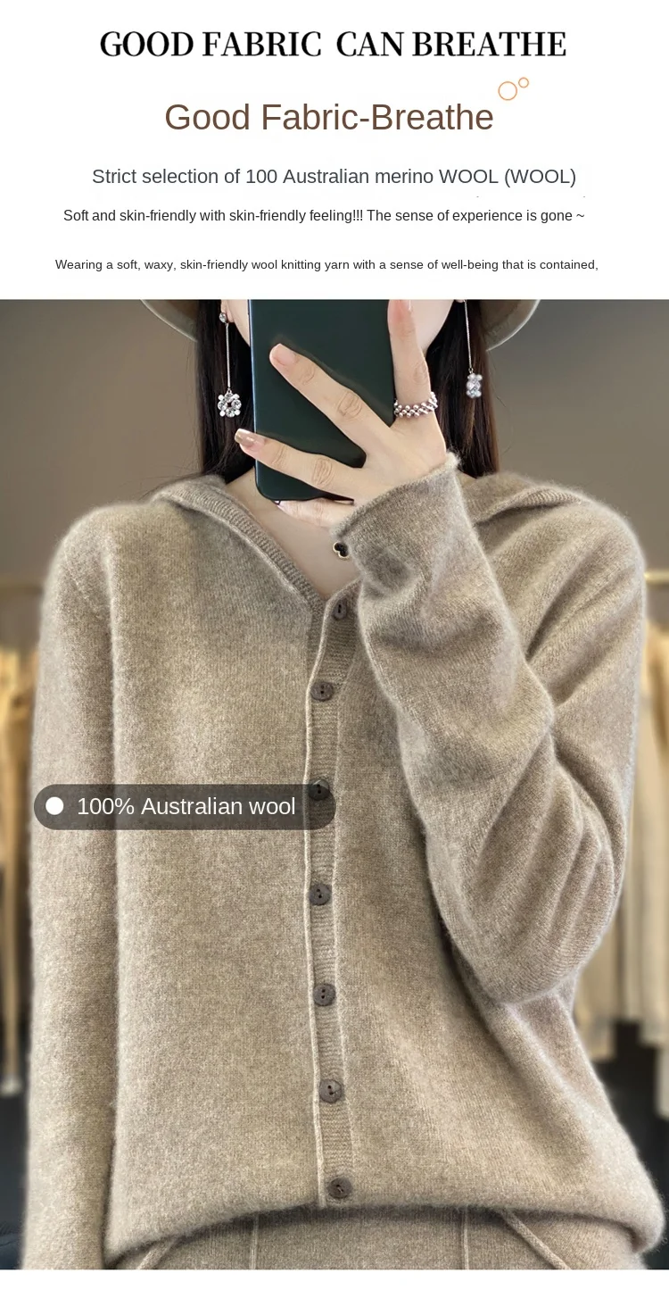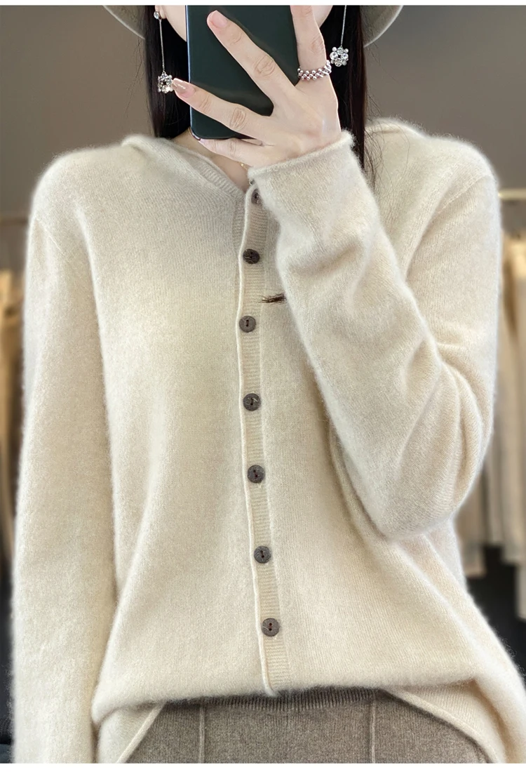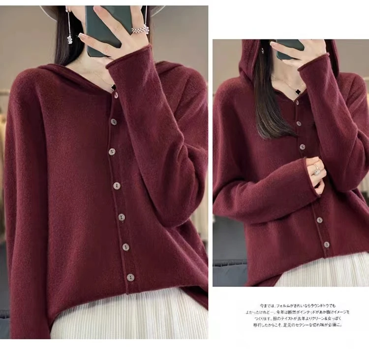 Cardigan lavorato a maglia in lana merino 100% prima linea Felpa con cappuccio autunno e inverno da donna Maglione allentato Cappotto versatile alla moda Top YC014
