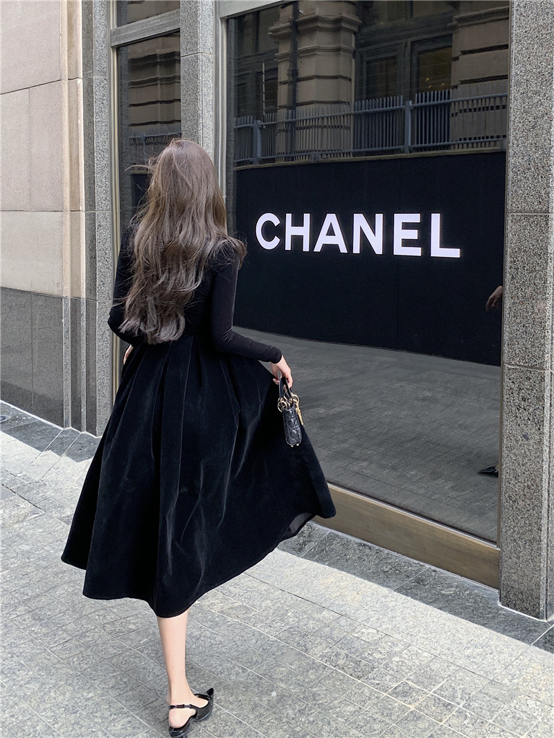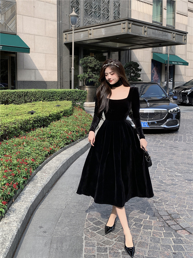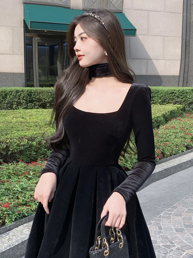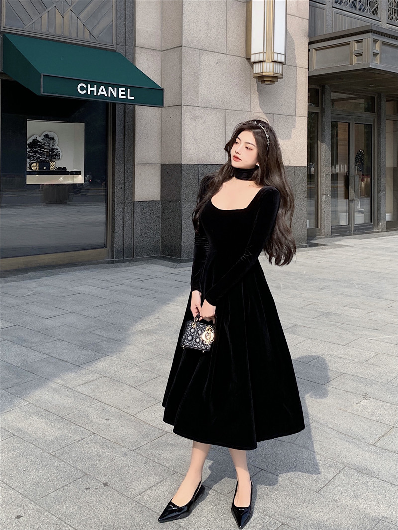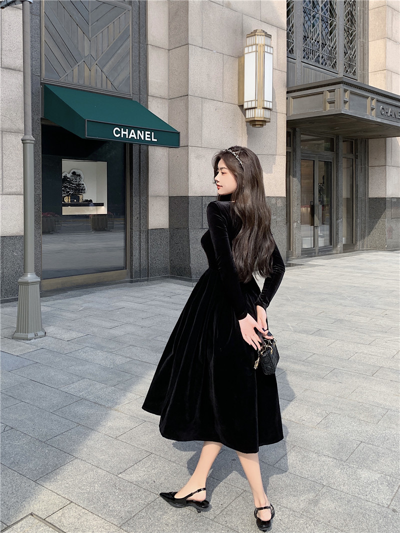 CJFHJE Black Velvet Evening Party Midi Dresses France Vintage Elegant Lady Dress New Winter coreano One Piece Dress donna autunno