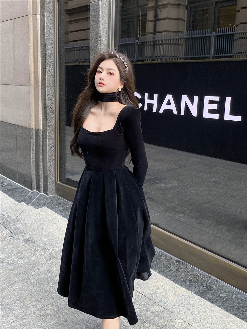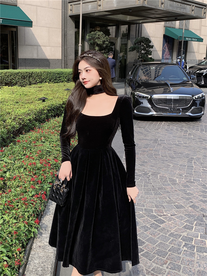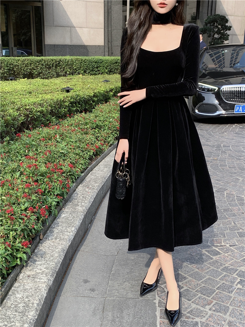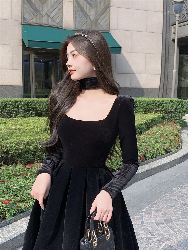 CJFHJE Black Velvet Evening Party Midi Dresses France Vintage Elegant Lady Dress New Winter coreano One Piece Dress donna autunno