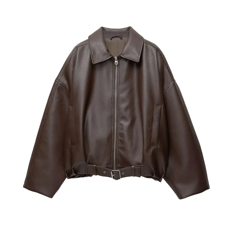 Colletto alla coreana Giacca corta in pelle da donna Cerniera Solido monopetto Manica intera Cintura con risvolto Cappotto 2025 Autunno Lady Chic Outwears