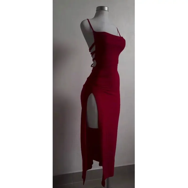 Deeptown Lace-up Irregolare Split Abito lungo Donna Sexy Rosso Party Abito longuette Estate Halter Strap Spice Girl Bag Hip Vestiti Solido