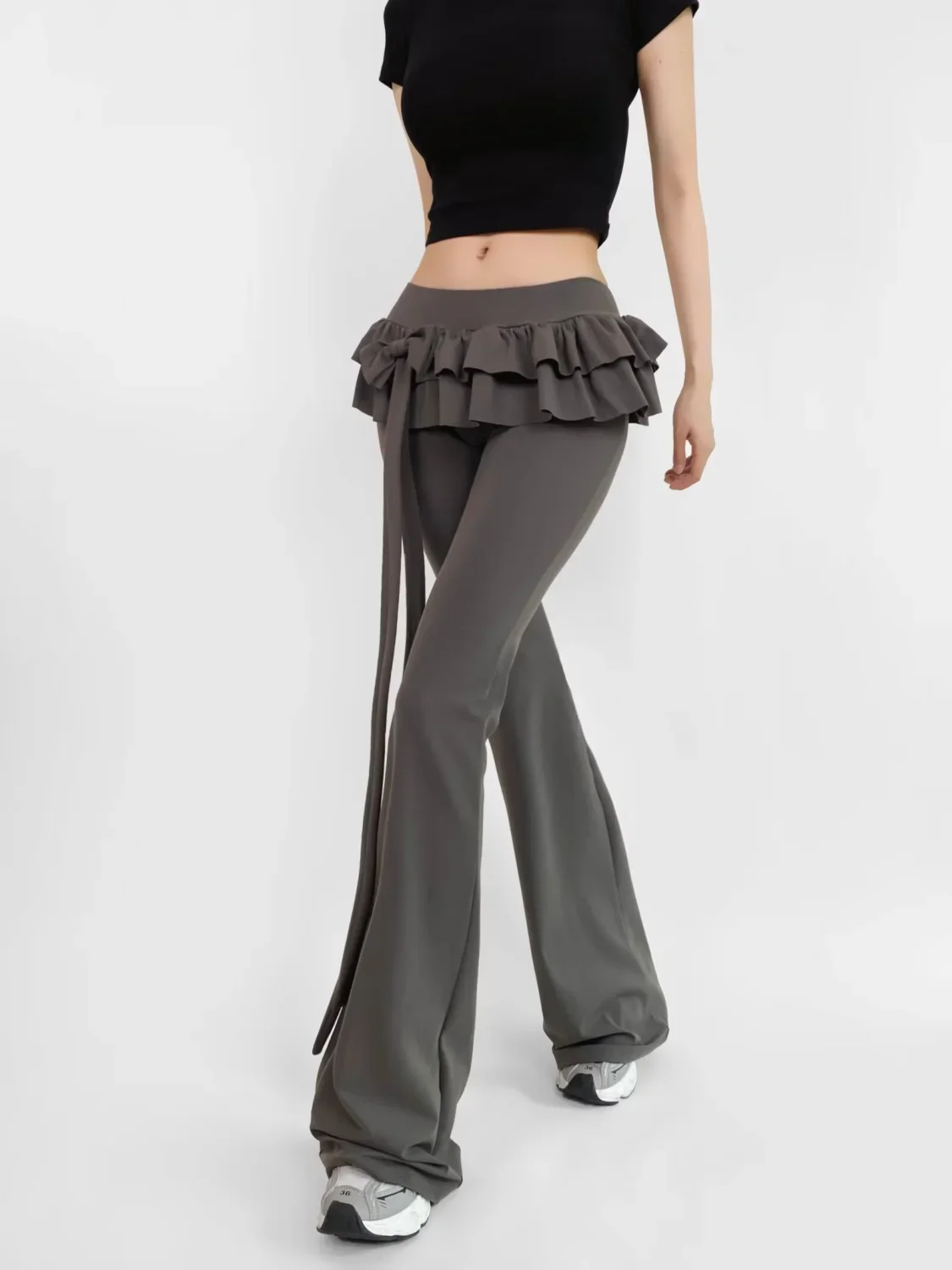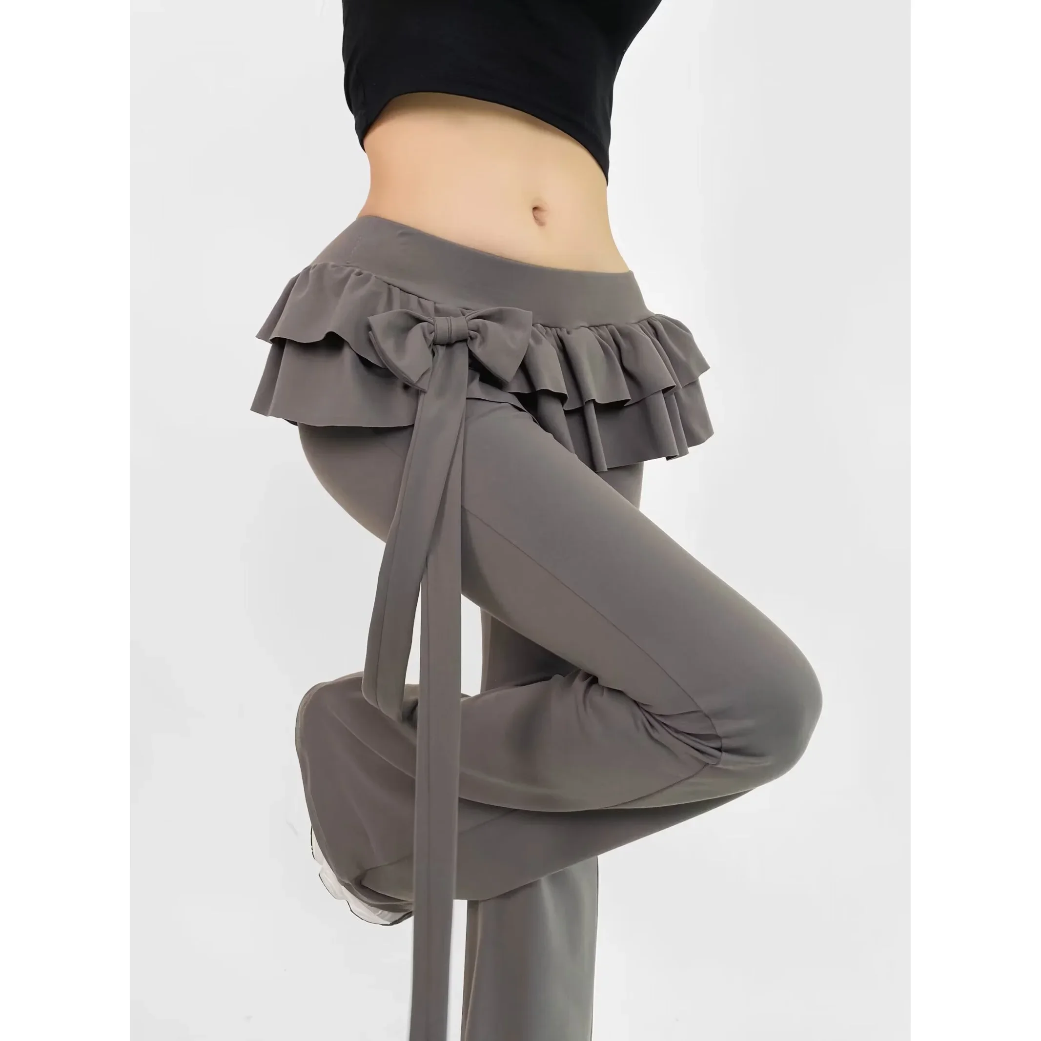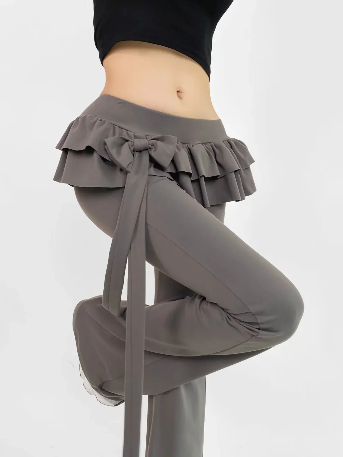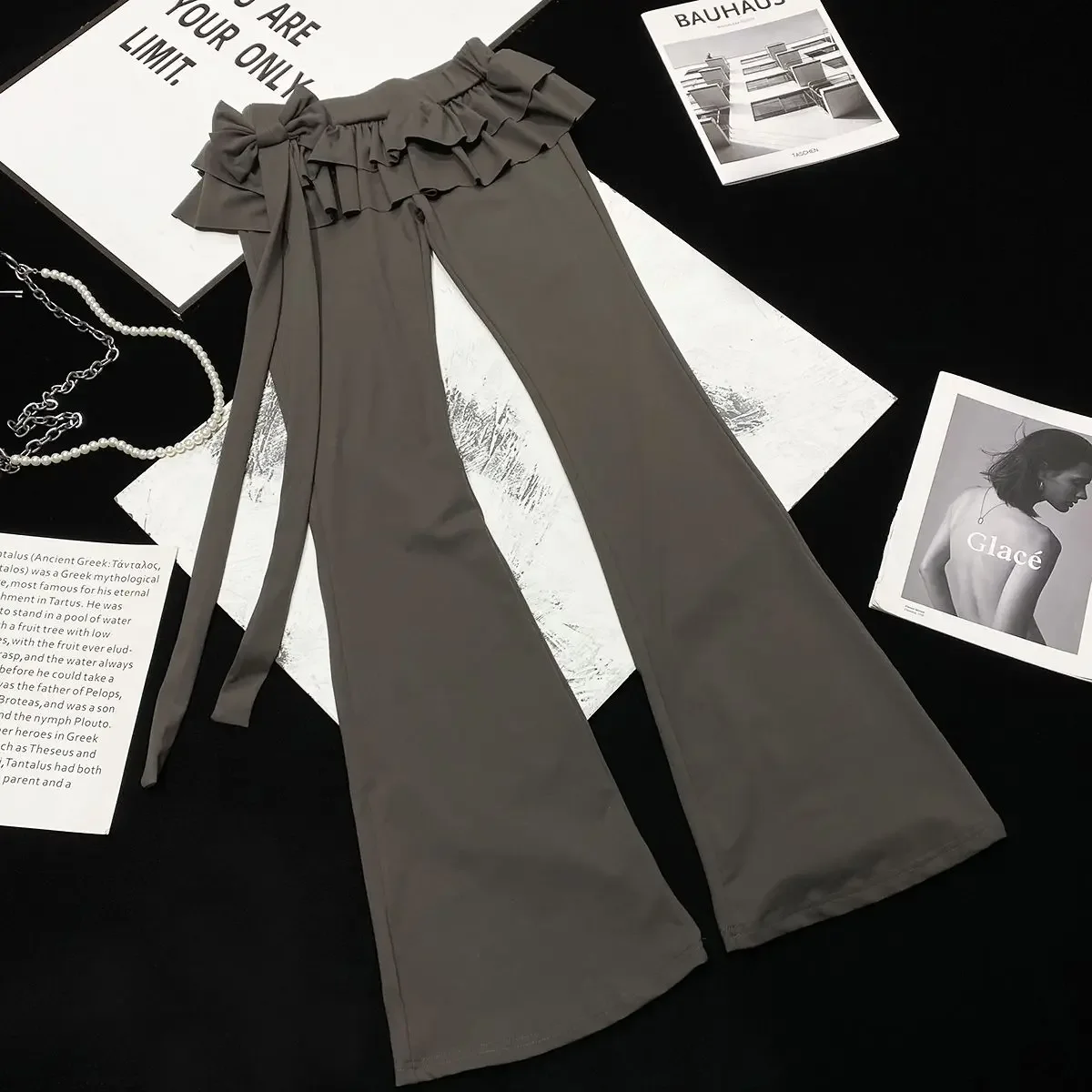 Deeptown Y2k Bow Ruffles Pantaloni a zampa d’elefante Donna Sexy Vita bassa Slim Casual Gonne Pantaloni Autunno Inverno Street Coquette Pantalones